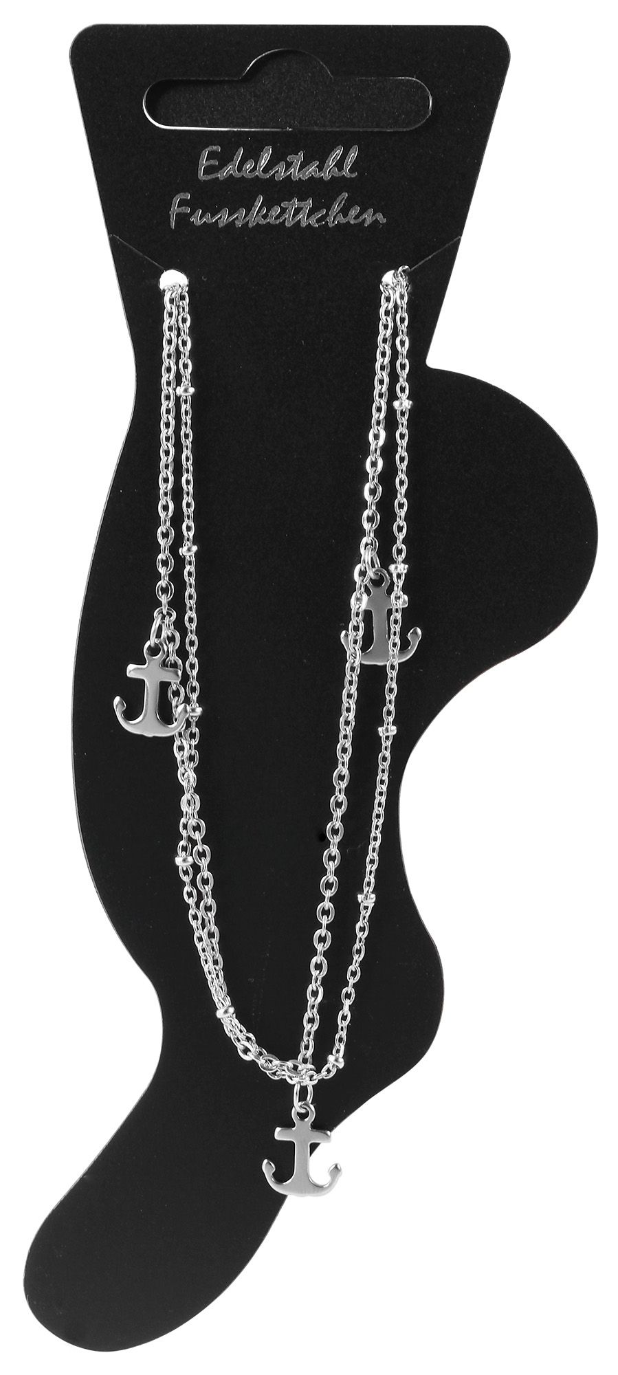 Dit elegante enkelbandje van hoogwaardig roestvrij staal in een koele zilverkleur of warme goudkleur, met een lengte van 24 cm en een breedte van 4 mm en een dikte van 2 mm, wordt gekenmerkt door het ontwerp met dubbele rijen in een ankerkettingpatroon: twee delicate roestvrijstalen kettinkjes die stijlvol de enkel strelen.