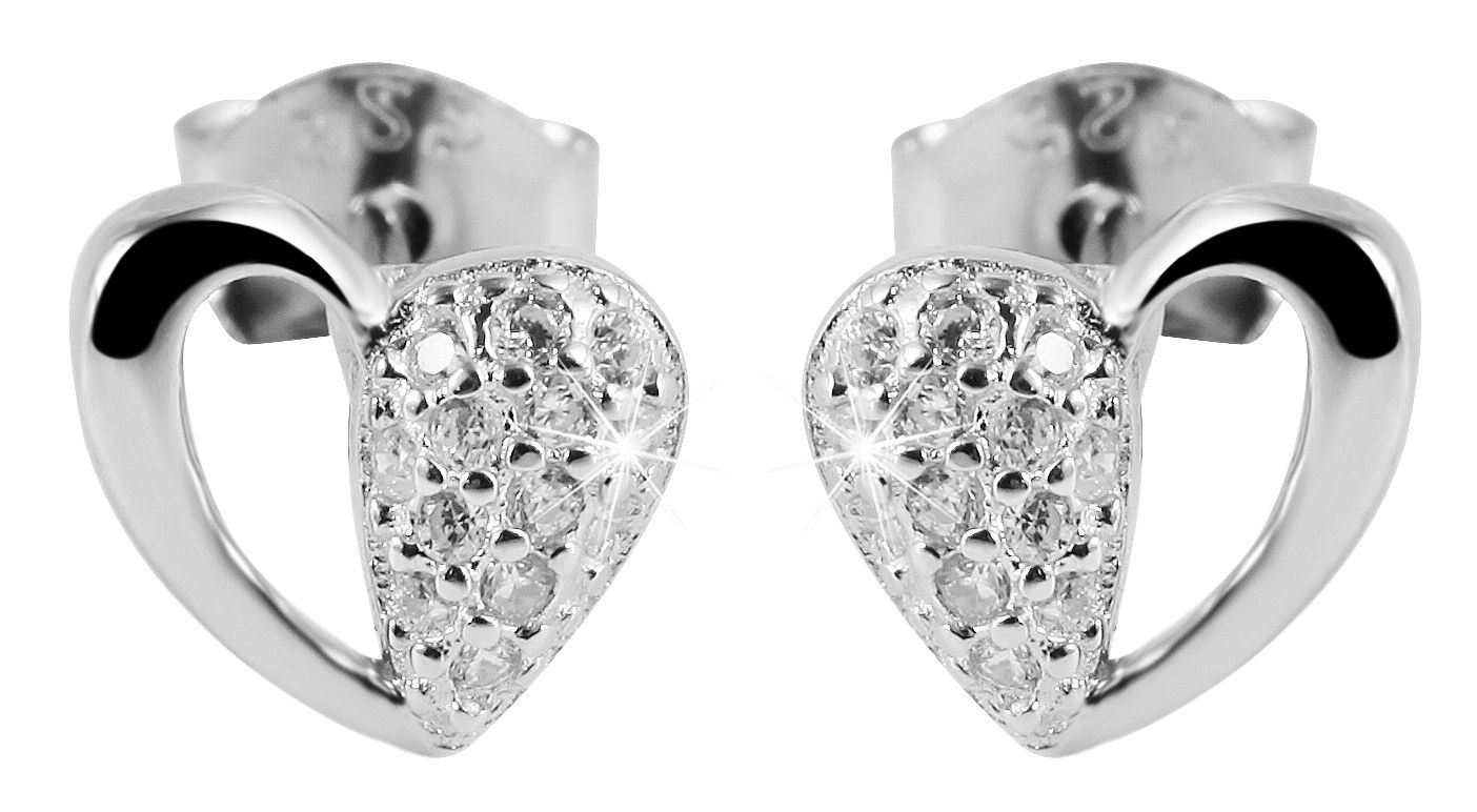 De ene helft van de hart oorstekers is open, terwijl de andere helft versierd is met 16 zirkonia steentjes. De oorbellen worden aan het oorgat bevestigd met een vleugelschroef, die ook van echt zilver is gemaakt. De maat komt voort uit een lengte van 9 mm, een breedte van 8 mm en een dikte van 2,5 mm.