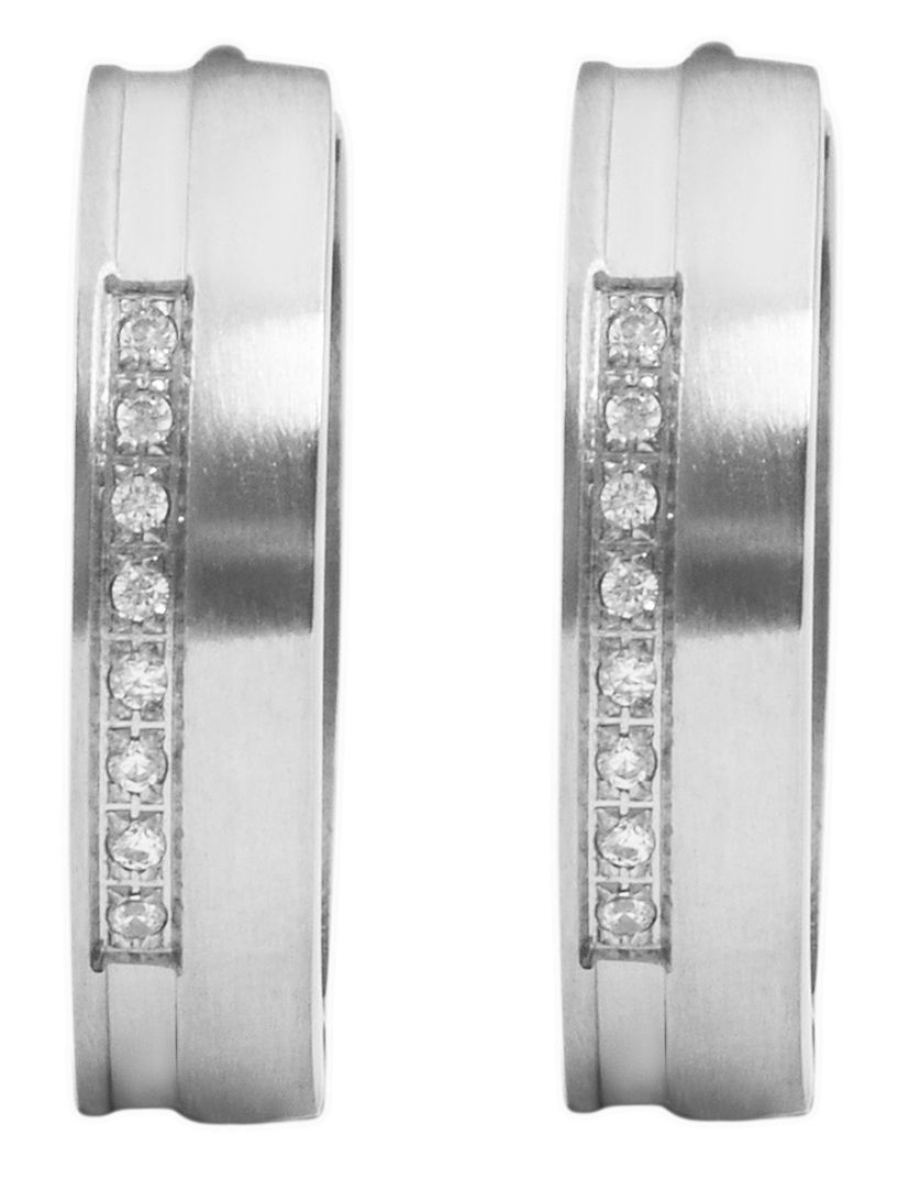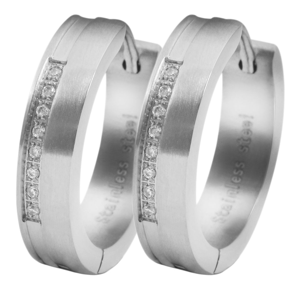 De scharnierende oorbellen met accent zijn gemaakt van roestvrij staal en zijn bezet met 8 fonkelende similisteenjes per oorbel. De oorbellen zijn zilverkleurig. Het materiaal is mat afgewerkt. De oorbellen kunnen gemakkelijk worden geopend en gesloten dankzij de scharniersluiting. Het item heeft de volgende afmetingen: Diameter: 16 mm, breedte 5 mm en dikte 2 mm.