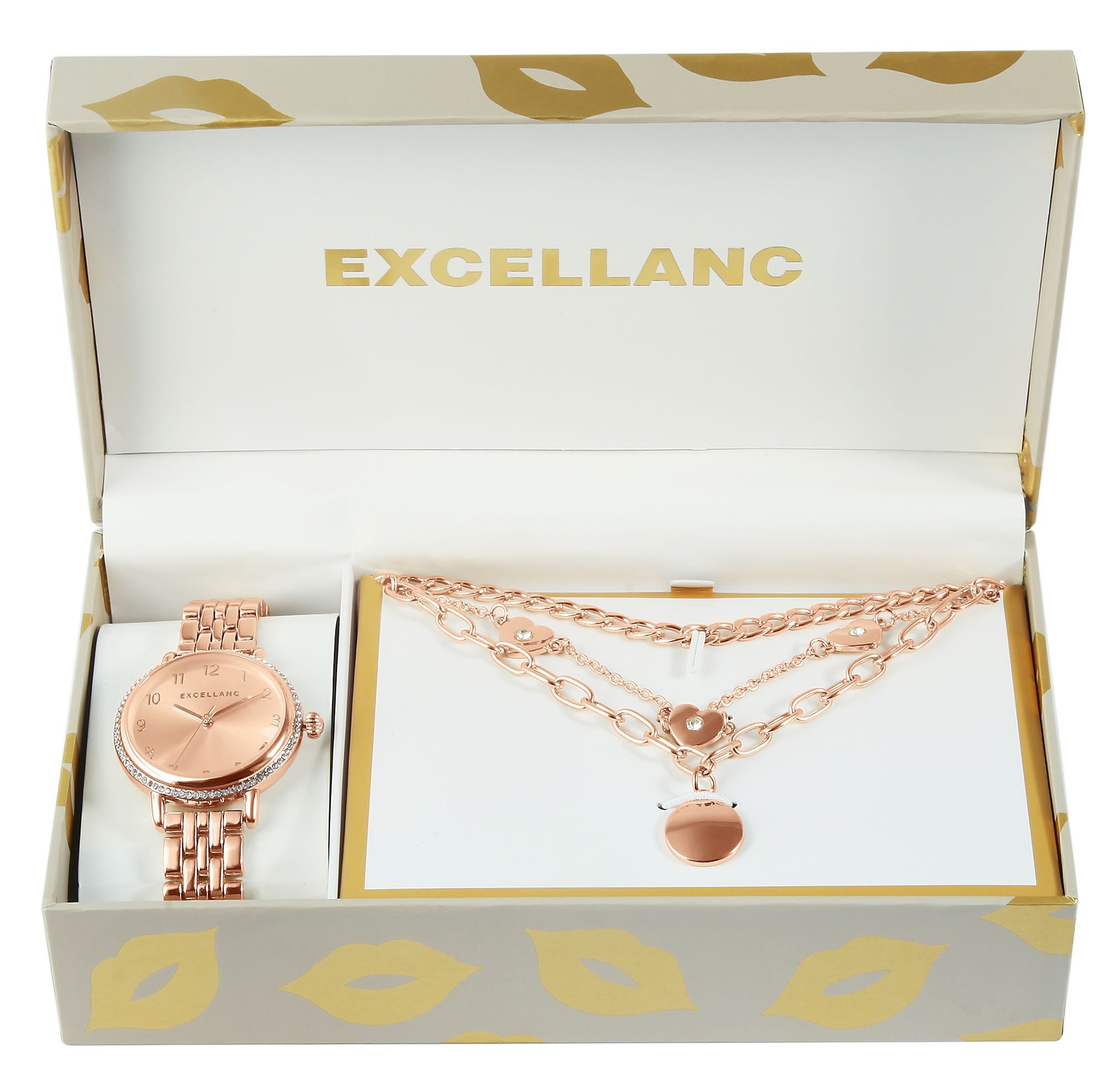 Productinformatie "Excellanc Geschenkset mit Damenarmbanduhr und drei Halsketten, roségoldfarben"