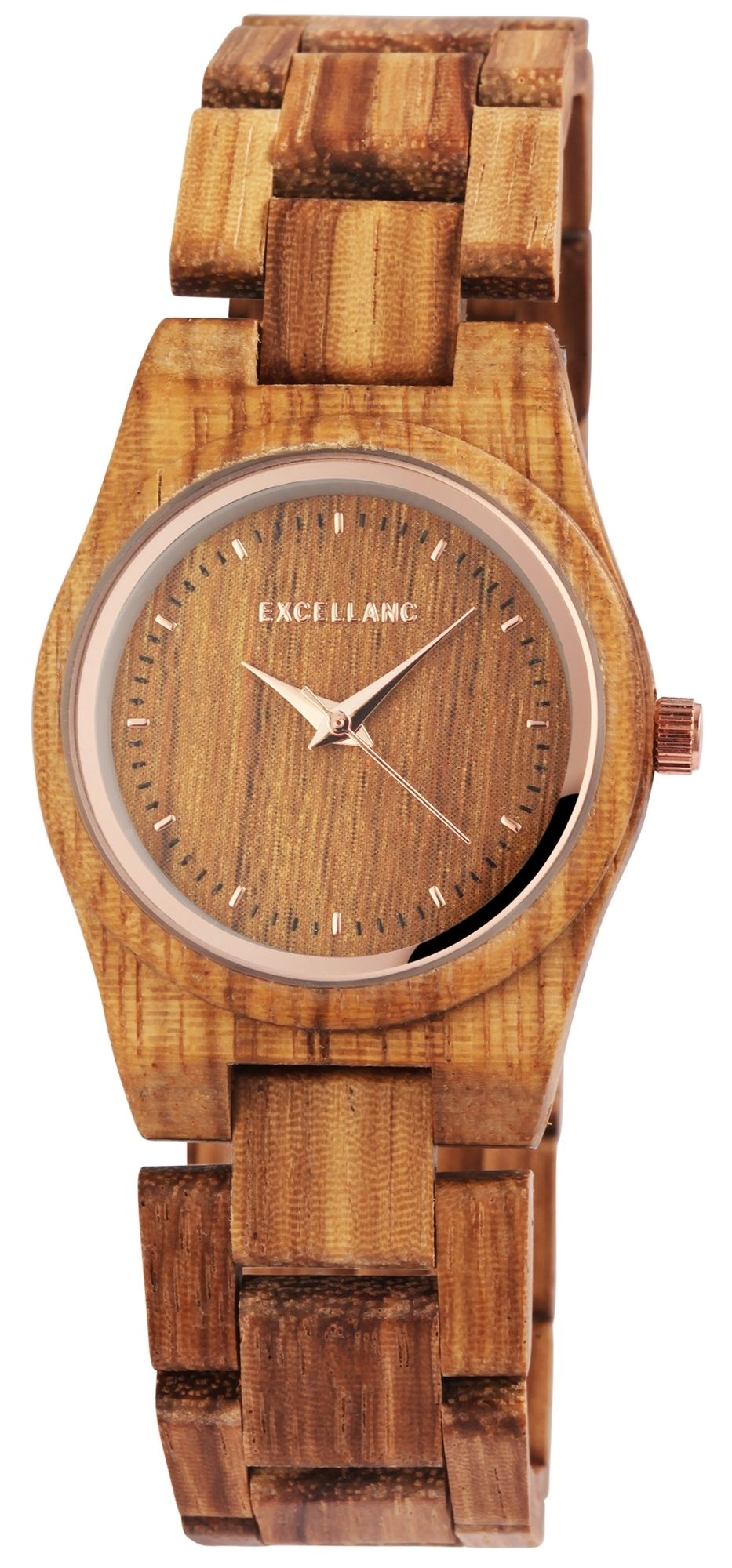Het analoge damespolshorloge met 3 wijzers van het merk Excellanc heeft een hoogwaardig kwartsuurwerk. De zebrahouten schakelarmband is 20 mm breed bij de lug en kan worden geopend en gesloten met een zilverkleurige roestvrijstalen vouwsluiting. De totale lengte van het horloge is 21 cm. De houten kast met mineraalglas heeft een diameter van 32 mm en een kasthoogte van 10 mm. Een bijzondere blikvanger is het mineraalglas, dat een 1 mm brede rosékleurige spiegelrand heeft. Samen met de kleurgecoördineerde kroon rondt dit de unieke look van het horloge af. De wijzerplaat is ook gemaakt van zebrahout en heeft dezelfde kleuren als de band en kast. De roségoudkleurige wijzers passen goed bij de algehele look van het horloge en ronden het harmonieus af. Met dit horlogemodel draag je een absolute blikvanger om je pols die bij elke gelegenheid gecombineerd kan worden. Dankzij het lichtgewicht materiaal past het perfect om de pols en is het comfortabel om te dragen. Het horloge is perfect als cadeau. Bijvoorbeeld voor een verjaardag, Moederdag, Kerstmis of Valentijnsdag.