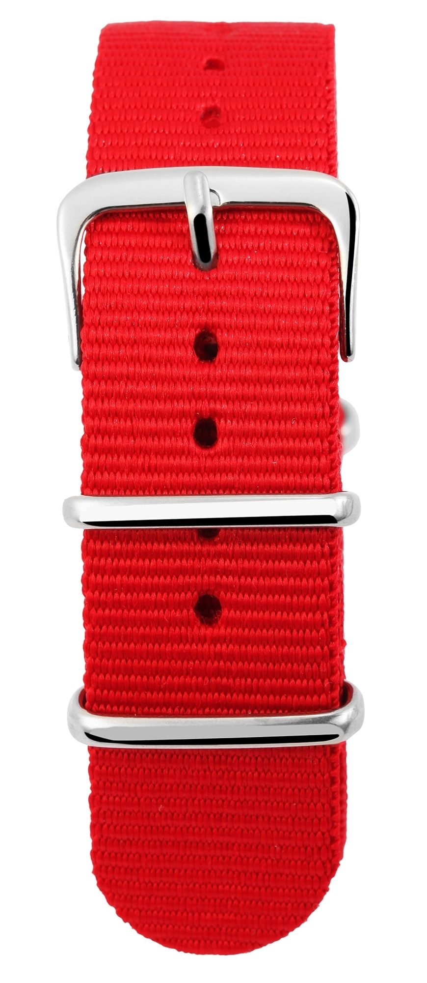 De rode nylon horlogeband heeft een lugbreedte van 20 mm. Het kan eenvoudig aan de horlogekast worden bevestigd met behulp van twee standaard veertjes. Het horlogebandje heeft een totale lengte van 27,5 cm. De horlogeband kan worden geopend en gesloten met een zilverkleurige gesp. Twee metalen lussen zijn ook stevig aan het horlogebandje genaaid. Het zachte materiaal maakt de horlogeband bijzonder comfortabel om te dragen. Het eenvoudige uiterlijk maakt het mogelijk om de horlogeband aan elk type horloge te bevestigen. Het past goed bij het algemene uiterlijk van de horloges.