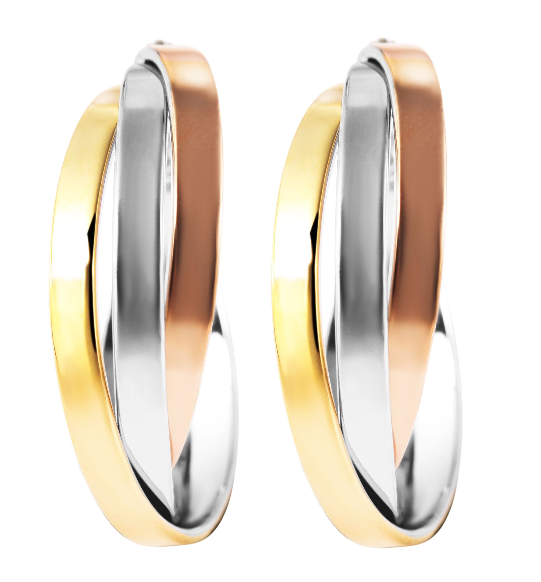 De hoogglans gepolijste hoepels van het merk Akzent zijn gemaakt van roestvrij staal en kunnen veilig worden vastgemaakt met een klassieke borgsluiting. De driekleurige oorbellen zijn gemaakt van drie 3 mm brede hoepels die in elkaar verstrengeld zijn. Zilver, goud en roségoud zijn de drie kleuren die het oppervlak van de moderne hoepeloorbellen sieren. Samen vormen ze een harmonieus geheel en dankzij hun veelzijdigheid kunnen ze met elk ander sieraad gecombineerd worden. Op het breedste punt zijn de oorbellen 9 mm breed en het materiaal is 1,5 mm dik.