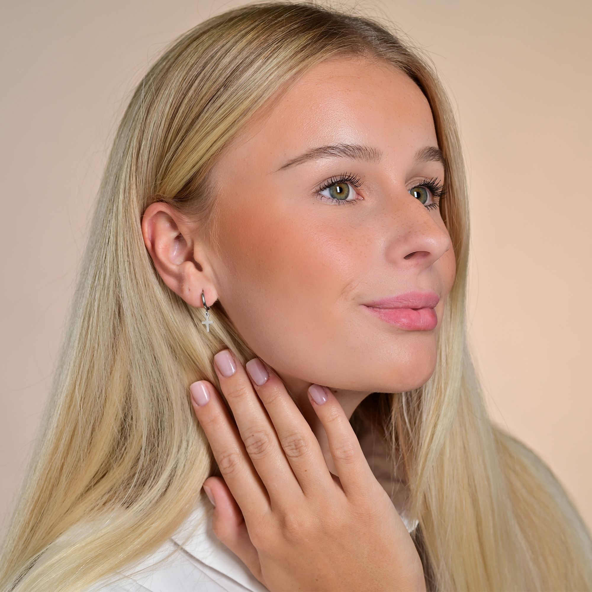 De scharnierende hoepeloorbellen van het merk Akzent zijn gemaakt van roestvrij staal. De binnendiameter van de oorbellen is 8 mm. De breedte is 1,5 mm en de dikte is ook 1,5 mm. Aan de onderkant van de oorbellen is een oogje bevestigd, waaraan een kleine kruis hanger is bevestigd. Deze is 9 mm lang, 6 mm breed en heeft een materiaaldikte van 1 mm. De kleine hangers zwaaien zachtjes bij elke beweging en zorgen voor modieuze accenten. De oorbellen zijn verkrijgbaar in zilver- en goudkleur.