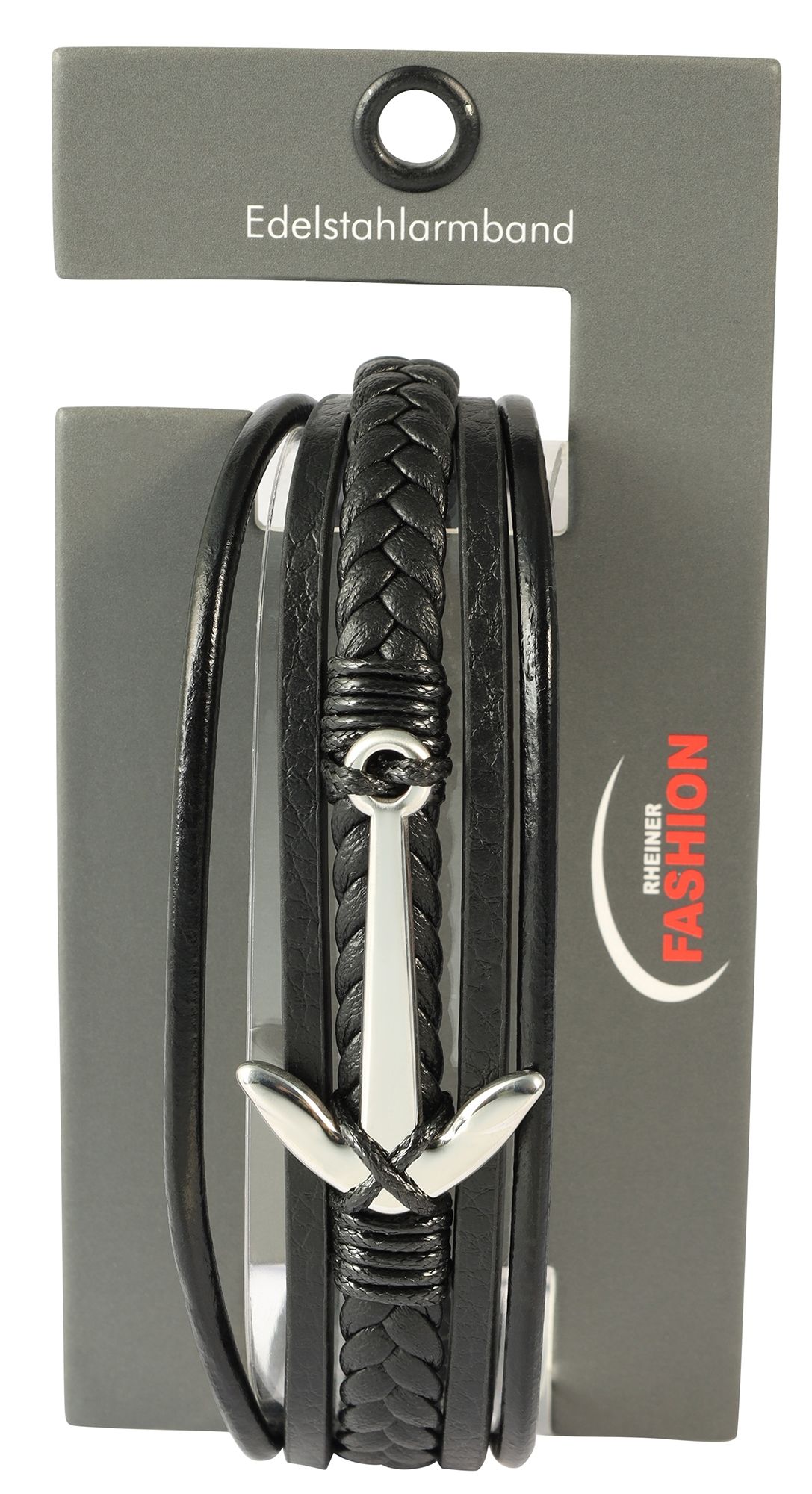 De "Arian" armband van zwart imitatieleer is een elegant accessoire dat nog wordt versterkt door zilverkleurige roestvrij stalen elementen. De verschillende oppervlaktestructuren zorgen samen voor een harmonieus totaalbeeld en maken van de armband iets heel bijzonders. Het roestvrijstalen anker in het midden rondt het ontwerp perfect af.