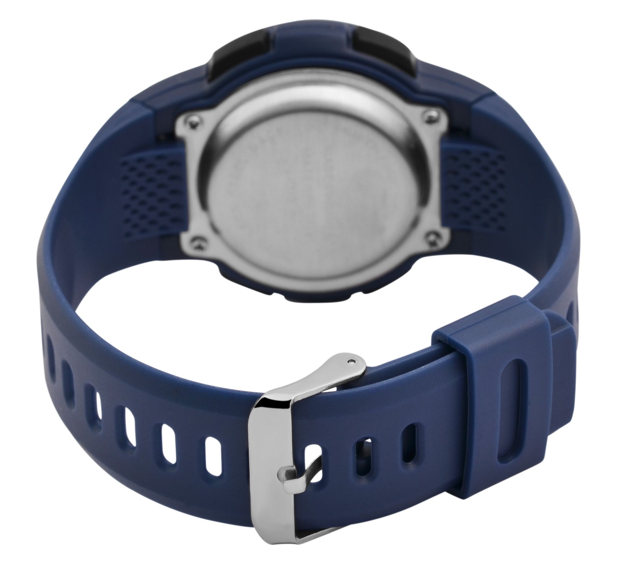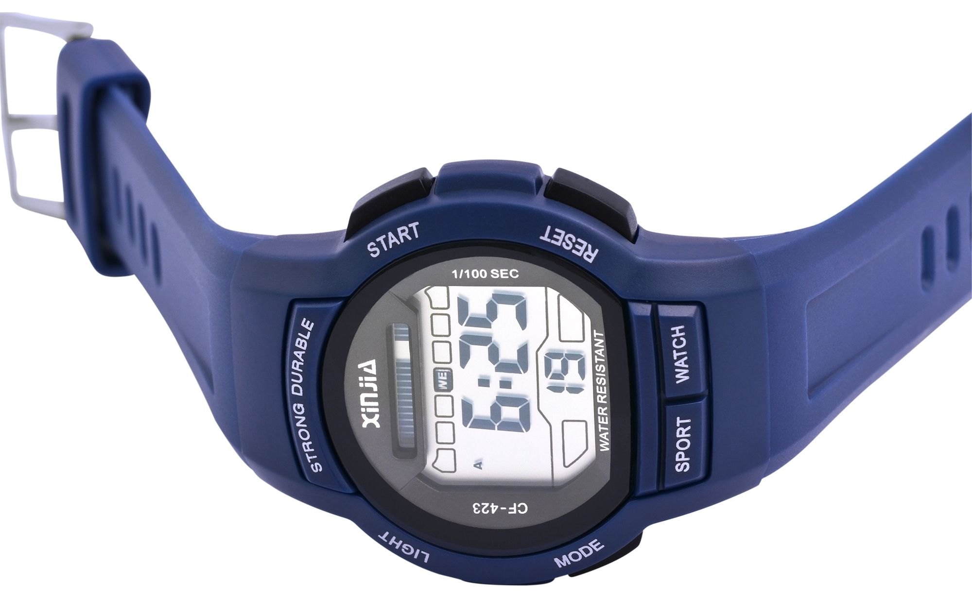 Het unisex digitale polshorloge van het merk Xinjia heeft een digitaal uurwerk van hoge kwaliteit. De blauwe siliconen band is 26 mm breed bij de lug en kan worden geopend en gesloten met een zilverkleurige gesp. De totale lengte van het horloge is 24,5 cm. De kunststof kast heeft een diameter van 42 mm en een kasthoogte van 14 mm. Het horloge is bijzonder goed bestand tegen schokken en trillingen. De achterkant van de kast is gemaakt van roestvrij staal en is aan de kast bevestigd met vier roestvrijstalen schroeven. De digitale tijd kan worden ingesteld met de vier drukknoppen, die gelijkmatig verdeeld zijn over de buitenrand van de kast. De drukknoppen kunnen ook worden gebruikt om alle andere functies in te stellen, zoals de displayverlichting, de stopwatchfunctie en de alarmfunctie. Dankzij de lichtfunctie is de tijd bijzonder gemakkelijk af te lezen, zelfs in het donker. De wijzerplaat heeft dezelfde kleur als de kast en band en is voorzien van één groot en drie kleinere digitale velden. Deze velden tonen de tijd, datum, dag van de week, maand, seconden, stoptijd en alarmtijd. De weergave in de digitale velden verandert afhankelijk van de ingestelde modus. Het Xinjia digitale horloge is een robuust horloge dat dankzij de vele functies op verschillende manieren gebruikt kan worden. Het is bijvoorbeeld ideaal voor hardlopen, fietsen of wandelen.