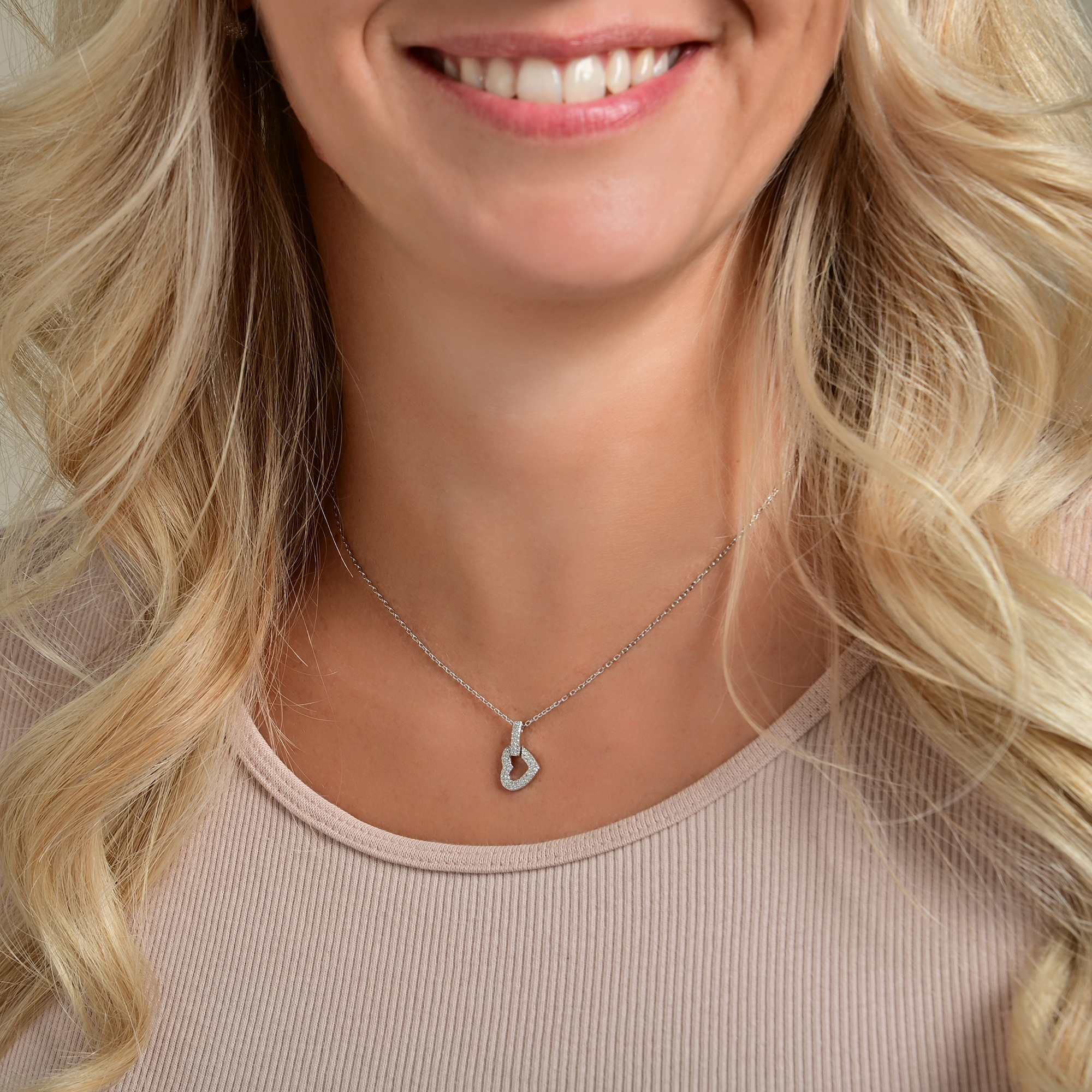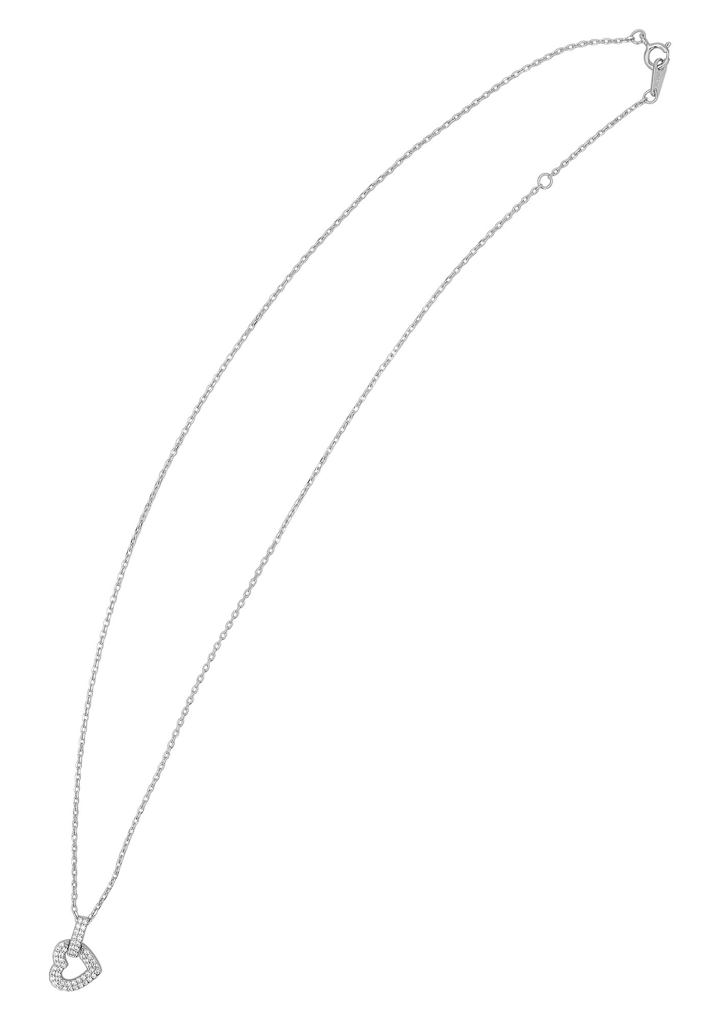 Met een fijne dikte van 0,5 mm, een breedte van 1 mm en een lengte van 44 cm ligt het delicaat om de hals. De hartvormige hanger, die aan de zijkant hangt en aan de ketting is bevestigd via een met zirkonia versierde kruisschakel, is 10 mm breed, 15 mm lang en 1,5 mm dik.