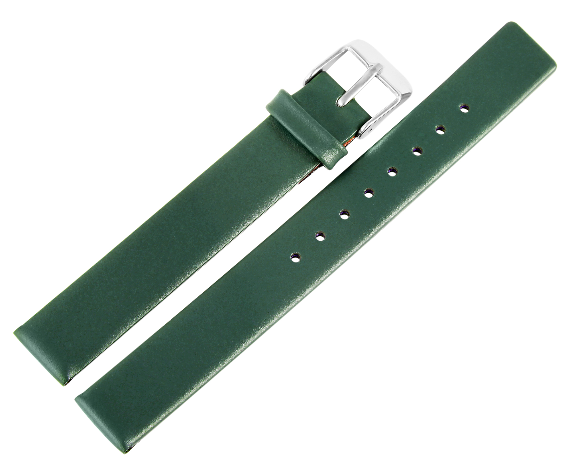 De donkergroene horlogeband is gemaakt van echt leer en heeft een lugbreedte van 14 mm. De totale lengte van het horlogebandje is 20,5 cm en de materiaaldikte is 2 mm. Het horlogebandje kan worden geopend en gesloten met een zilverkleurige, hoogglans gepolijste gesp. De glanzende afwerking in combinatie met het gladde leren horlogebandje benadrukt het mooie design van het horlogebandje en zorgt ervoor dat het snel en gemakkelijk om- en afgedaan kan worden.