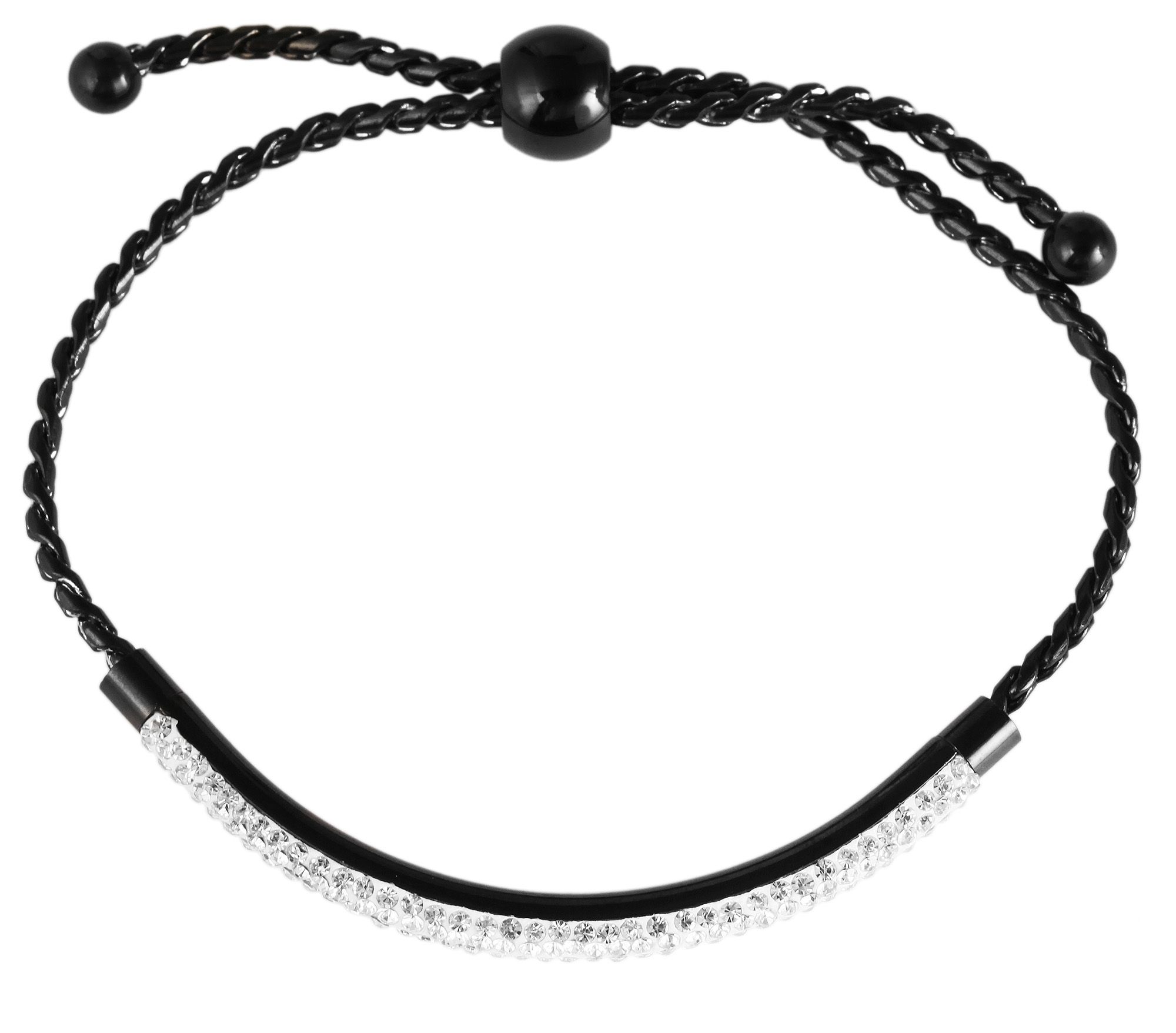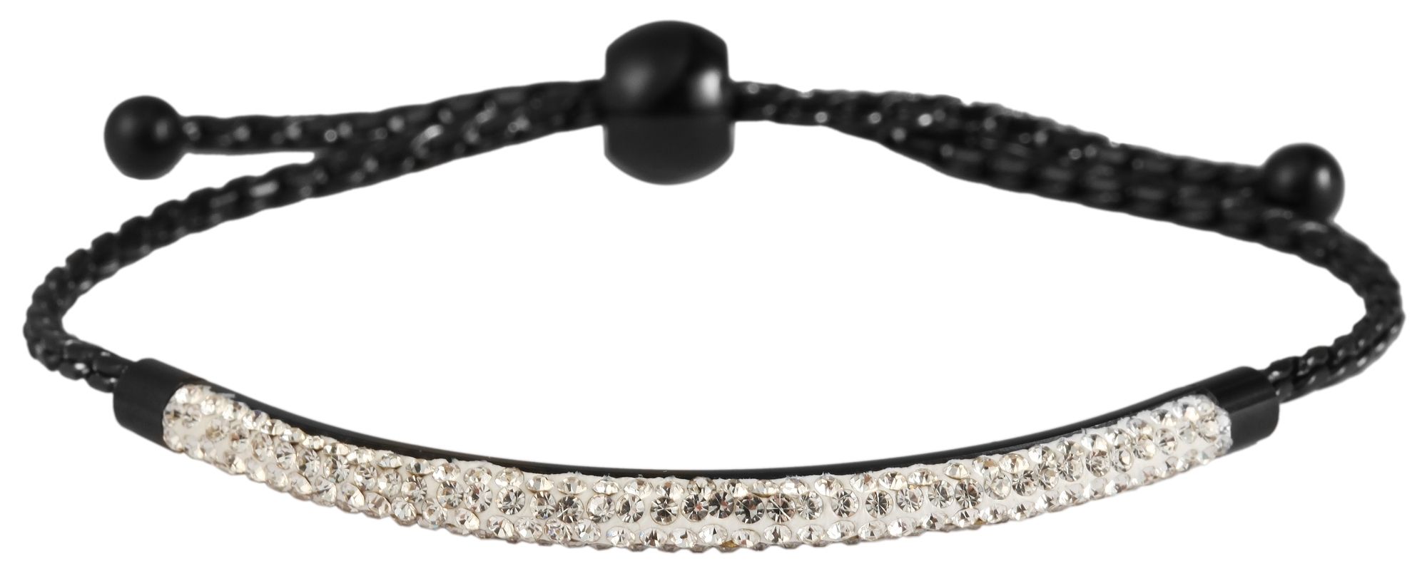 De vrouwelijke armband in een curb chain-design is gemaakt van roestvrij staal, is zwart en is bovendien afgewerkt met een ion-plating. In het midden van de armband bevindt zich een roestvrijstalen element dat in vier rijen gelijkmatig is bezet met in totaal 164 similietstenen. Dankzij de praktische treksluiting, die is versierd met een halfronde kraal met een diameter van 9 mm, kan de armband individueel worden aangepast aan elke pols. De roestvrijstalen armband is een echte blikvanger dankzij de stralende Similis-stenen. De armband heeft een totale lengte van 23 cm, een breedte van 4 mm en een dikte van 2 mm.