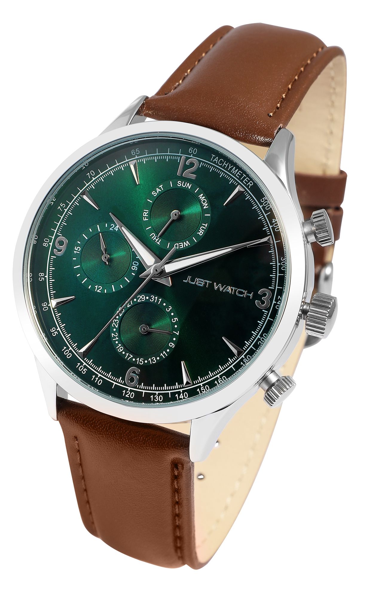 Het herenpolshorloge van het merk Just Watch heeft een hoogwaardig kwartsuurwerk. De band van echt leer is 20 mm breed bij de lug en kan worden geopend en gesloten met een roestvrijstalen gesp. De totale lengte van het horloge is 25,5 cm. De metalen kast met mineraalglas heeft een diameter van 42 mm en een kasthoogte van 12 mm. De achterkant van de kast is gemaakt van roestvrij staal. Dankzij het multifunctionele horloge kan de dag van de week, de datum en de tijd worden afgelezen. Dankzij de Superluminova-gecoate wijzers kun je de tijd zelfs in het donker gemakkelijk aflezen. Het herenhorloge heeft ook een waterbestendigheid van 3 bar. Al met al is dit horloge een sportief uurwerk en een geweldige metgezel voor dagelijks gebruik. Elk van onze Just Watch-horloges wordt geleverd in een mooie geschenkverpakking. Dit maakt het ook ideaal als cadeau.