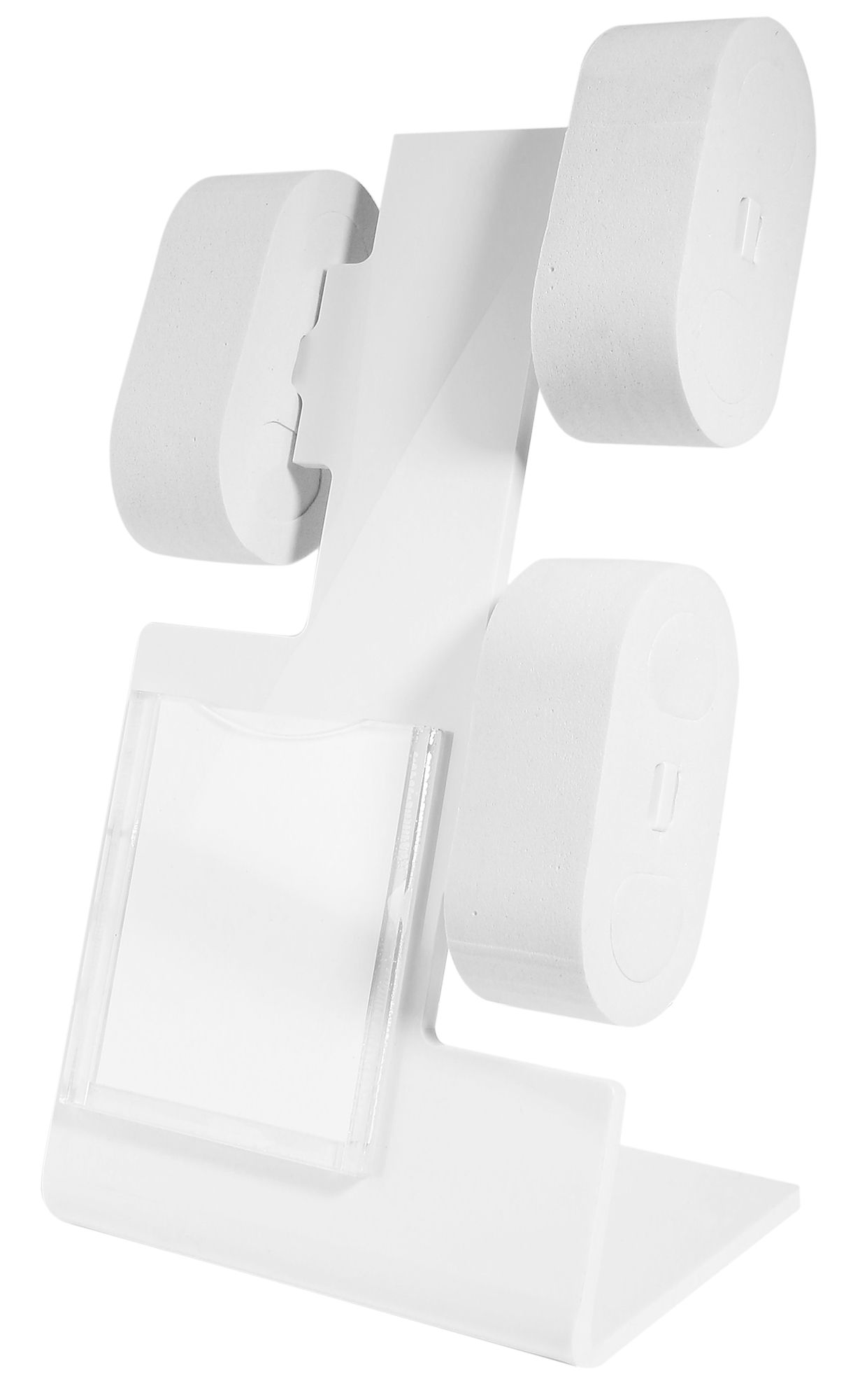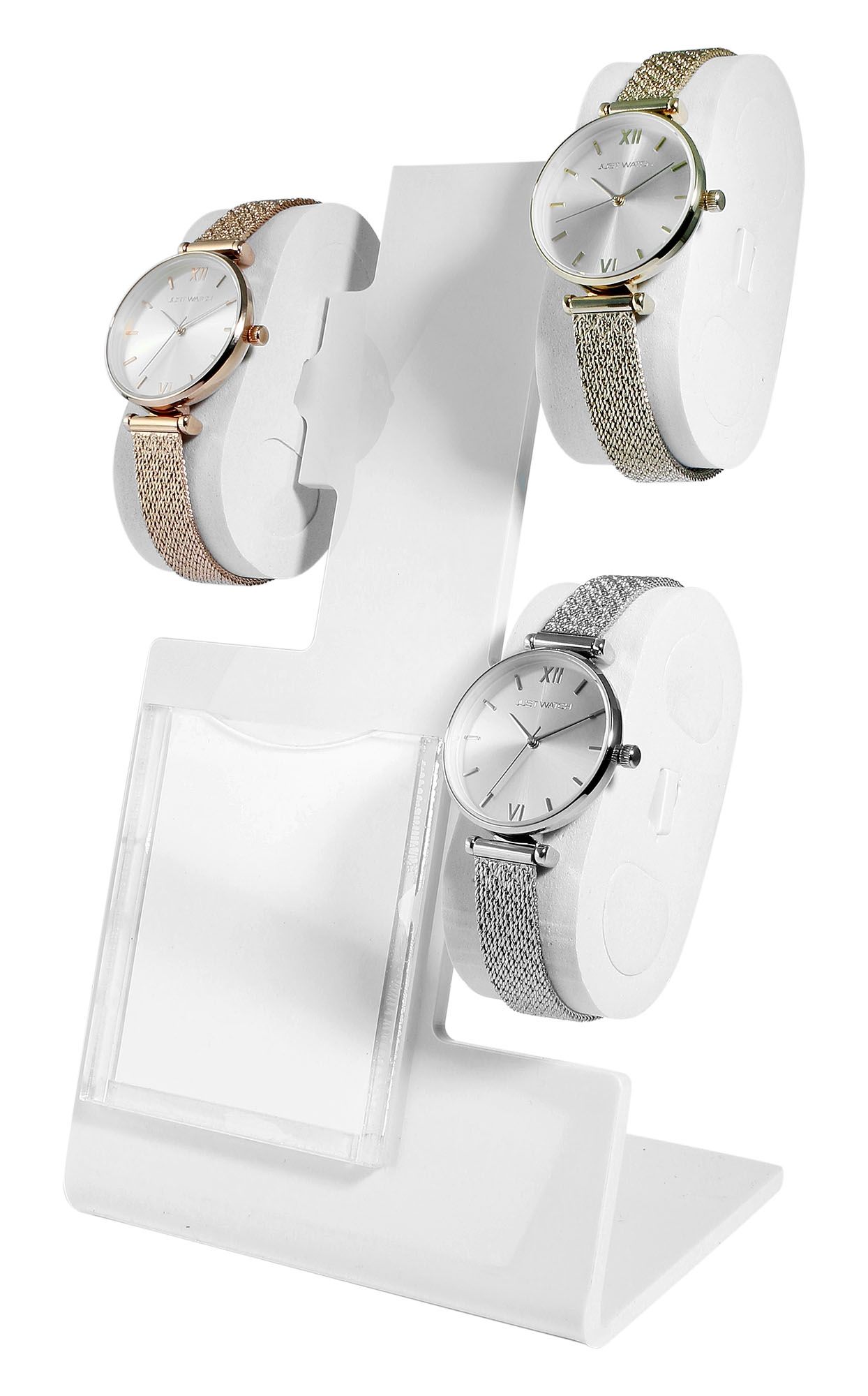 Productinformatie "Uhrendisplay für 3 Uhren (Dekoserie Shiny) mit Werbefläche, Kunststoff, 22 cm, weiß"