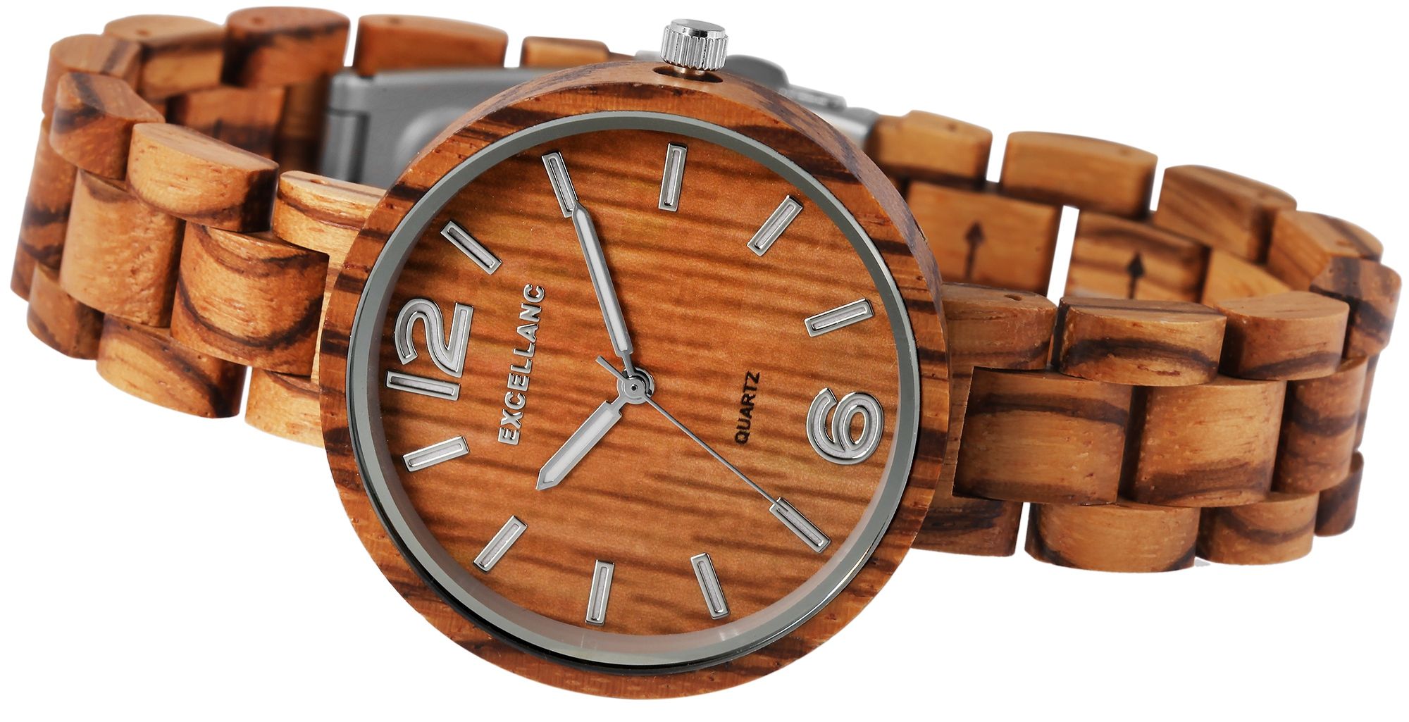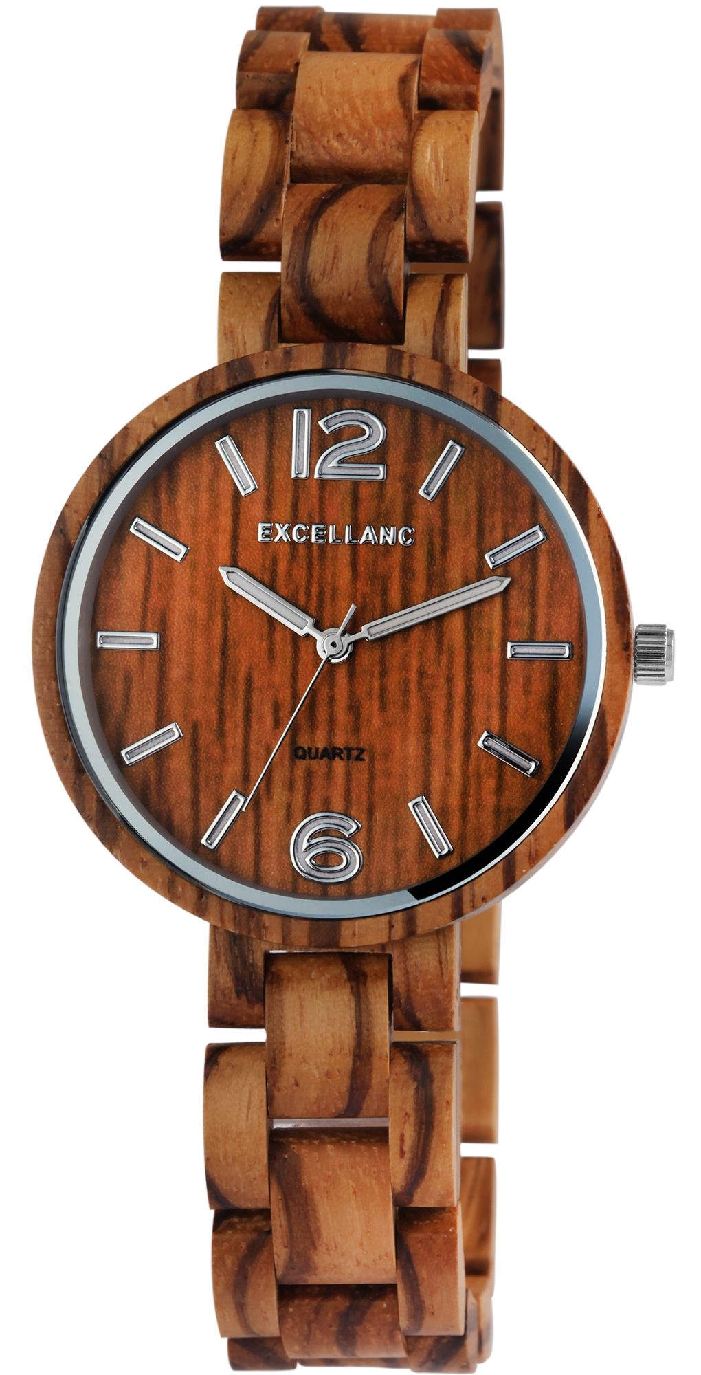 Het analoge damespolshorloge met 3 wijzers van het merk Excellanc heeft een hoogwaardig kwartsuurwerk. De zebrahouten band is 16 mm breed bij de lug en kan worden geopend en gesloten met een zilverkleurige roestvrijstalen vouwsluiting. De totale lengte van het horloge is 22 cm, maar kan naar wens worden ingekort dankzij de afneembare elementen. De kast, ook gemaakt van zebrahout, met een houten achterkant in dezelfde kleur en mineraalglas, heeft een diameter van 38 mm en een kasthoogte van 11 mm. Een visueel hoogtepunt is het mineraalglas met een zilverkleurige spiegelrand aan de buitenrand. Samen met de kleurgecoördineerde kroon geeft dit het horloge een elegante uitstraling. De wijzerplaat is ook van hout. De wijzers en uurmarkeringen passen bij de kleur en ronden het geheel harmonieus af. Een ander bijzonder kenmerk zijn de Superluminova wijzers en indexen, die het mogelijk maken om de tijd zelfs in het donker af te lezen. Elk houten horloge is uniek en individueel. Het is een statement van duurzaam denken en tegelijkertijd een modieus accessoire. De lichtheid van de natuurlijke grondstof zorgt voor een aangenaam draagcomfort, waardoor dit tijdloze horlogemodel onmisbaar is.