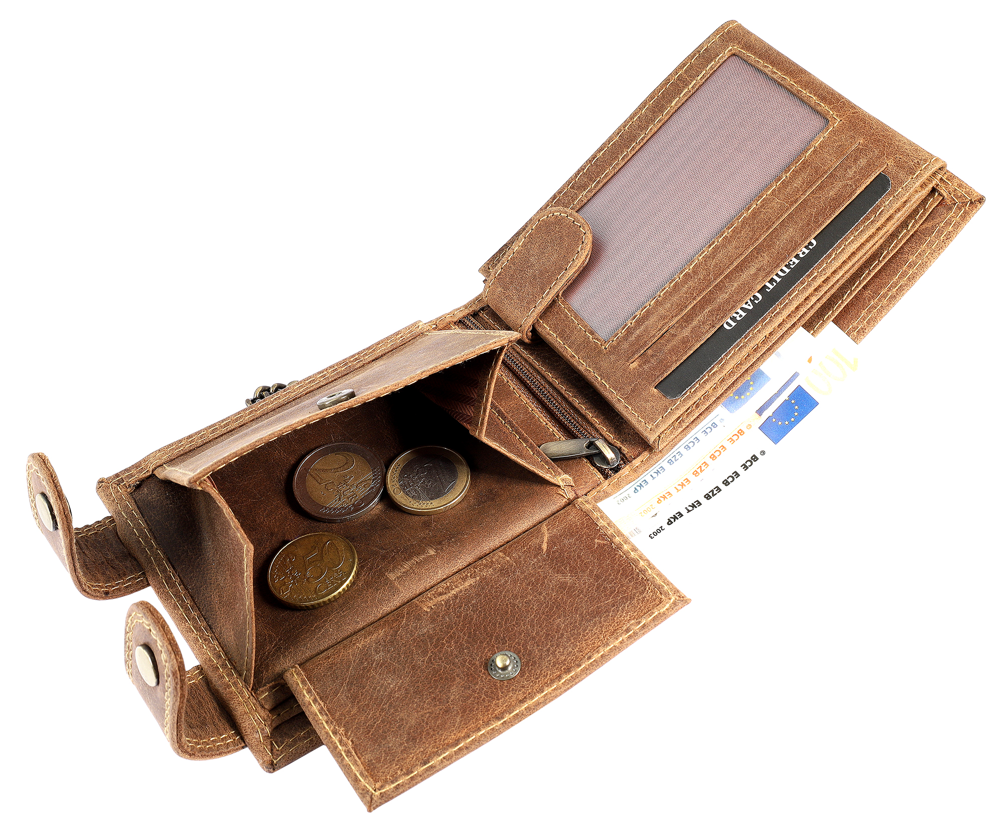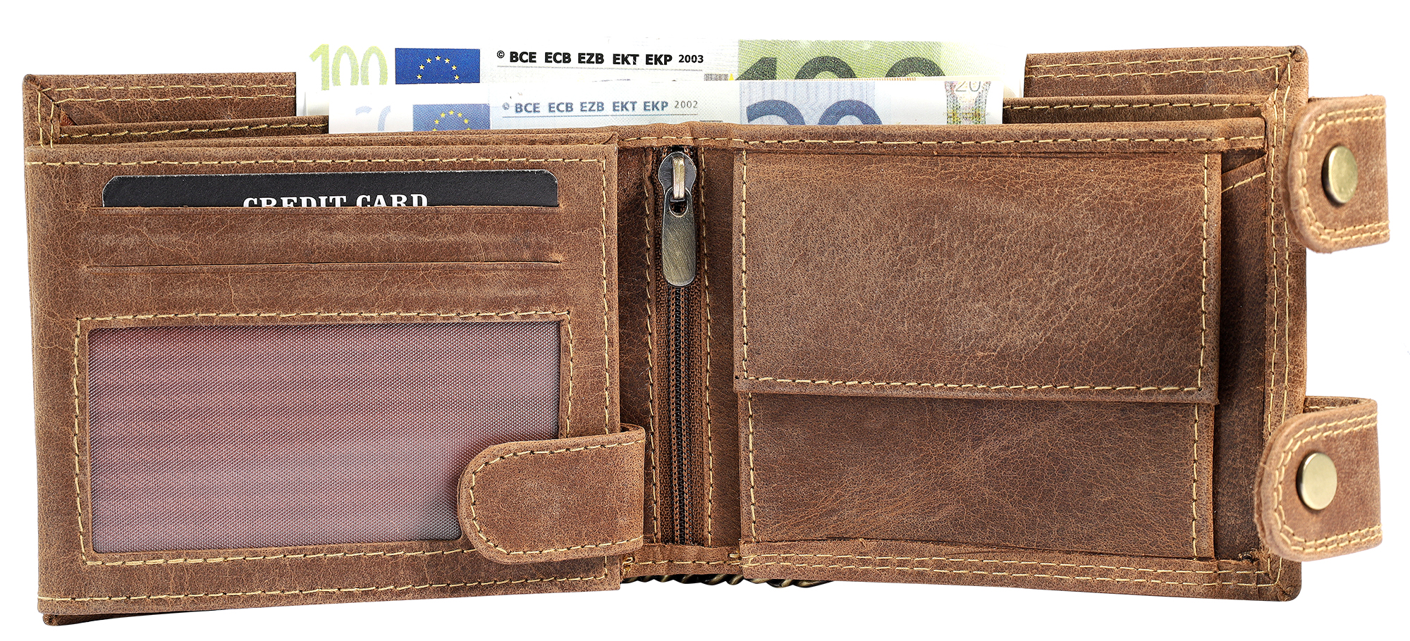 Met zijn handige afmetingen van ca. 9,5 x 12 x 2,5 cm biedt deze portemonnee niet alleen een opvallende look, maar ook een doordachte en praktische indeling:Beveiligde drukknoopsluiting 2 biljetvakken 8 creditcardvakken 3 ID-kaartvakken 1 muntvak 2 insteekvakken 1 ritsvak voor extra veiligheid De absolute must-have voor echte biker-stijl is de robuuste ketting met karabijnhaak, die wordt meegeleverd en een lengte heeft van 50 cm. Bevestig je portemonnee veilig en stijlvol aan je broek.