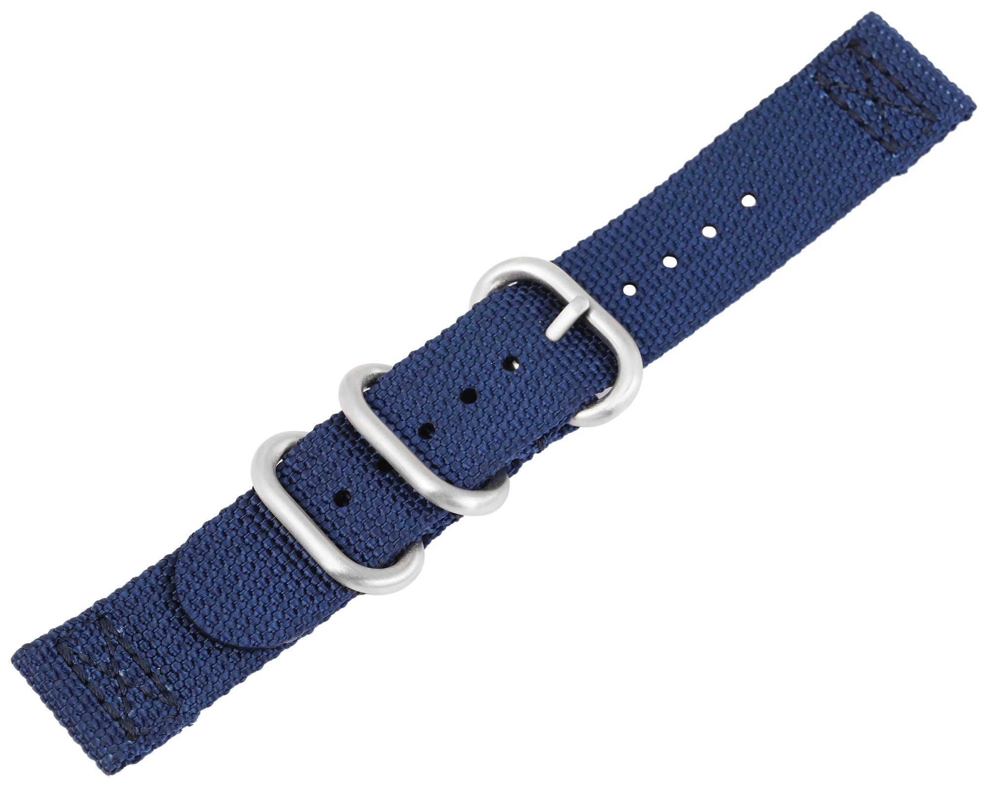 De donkerblauwe nylon horlogeband heeft een lugbreedte van 22 mm. Het kan eenvoudig aan de horlogekast worden bevestigd met twee standaard veerpennen. Het horlogebandje heeft een totale lengte van 21,5 cm. Het horlogebandje kan worden geopend en gesloten met een zilverkleurige gesp. Twee zilverkleurige metalen lussen zijn ook stevig aan het horlogebandje genaaid. Het zachte materiaal maakt de horlogeband bijzonder comfortabel om te dragen. Het eenvoudige uiterlijk maakt het mogelijk om het vervangende horlogebandje aan elk type horloge te bevestigen. Het past goed bij het algemene uiterlijk van de horloges.
