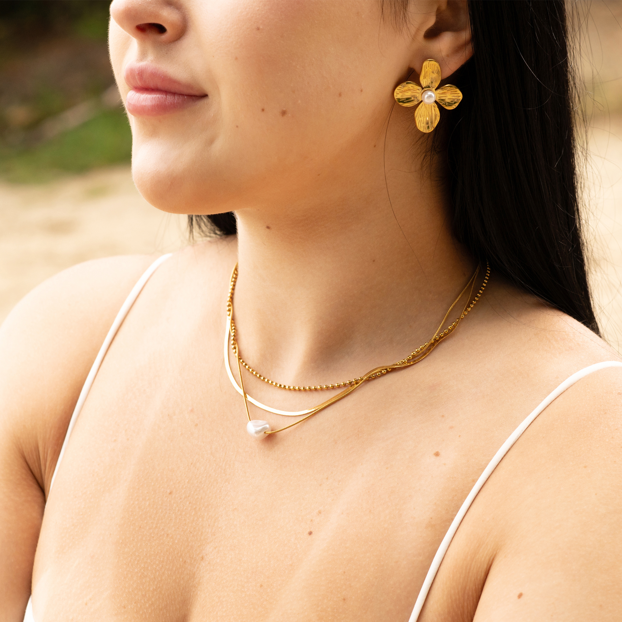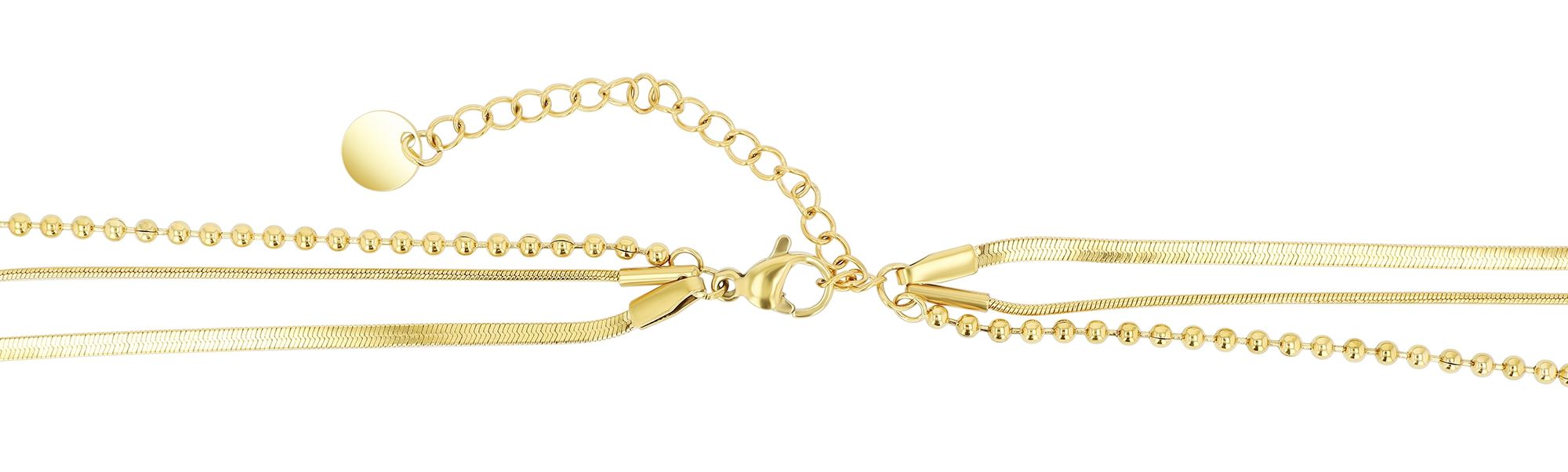 Gemaakt van roestvrij staal en vakkundig ontworpen met een bolletjesketting, ronde slangenketting en platte slangenketting, is deze gelaagde ketting een meesterwerk van modern design. In het midden van dit artistieke arrangement bevindt zich een parel van maar liefst 10 x 11 mm. Deze parel wordt het stralende middelpunt dat wordt omlijst door de verschillende soorten kettingen. De goudkleurige ion-plating zorgt niet alleen voor een elegante look, maar biedt ook een extra beschermlaag die de levensduur van het collier ondersteunt. De gelaagde ketting is 45 + 5 cm lang en wordt gesloten met een veilige karabijnsluiting. Deze lengte maakt het flexibel om te dragen en aan te passen aan verschillende outfits en halsvormen.
