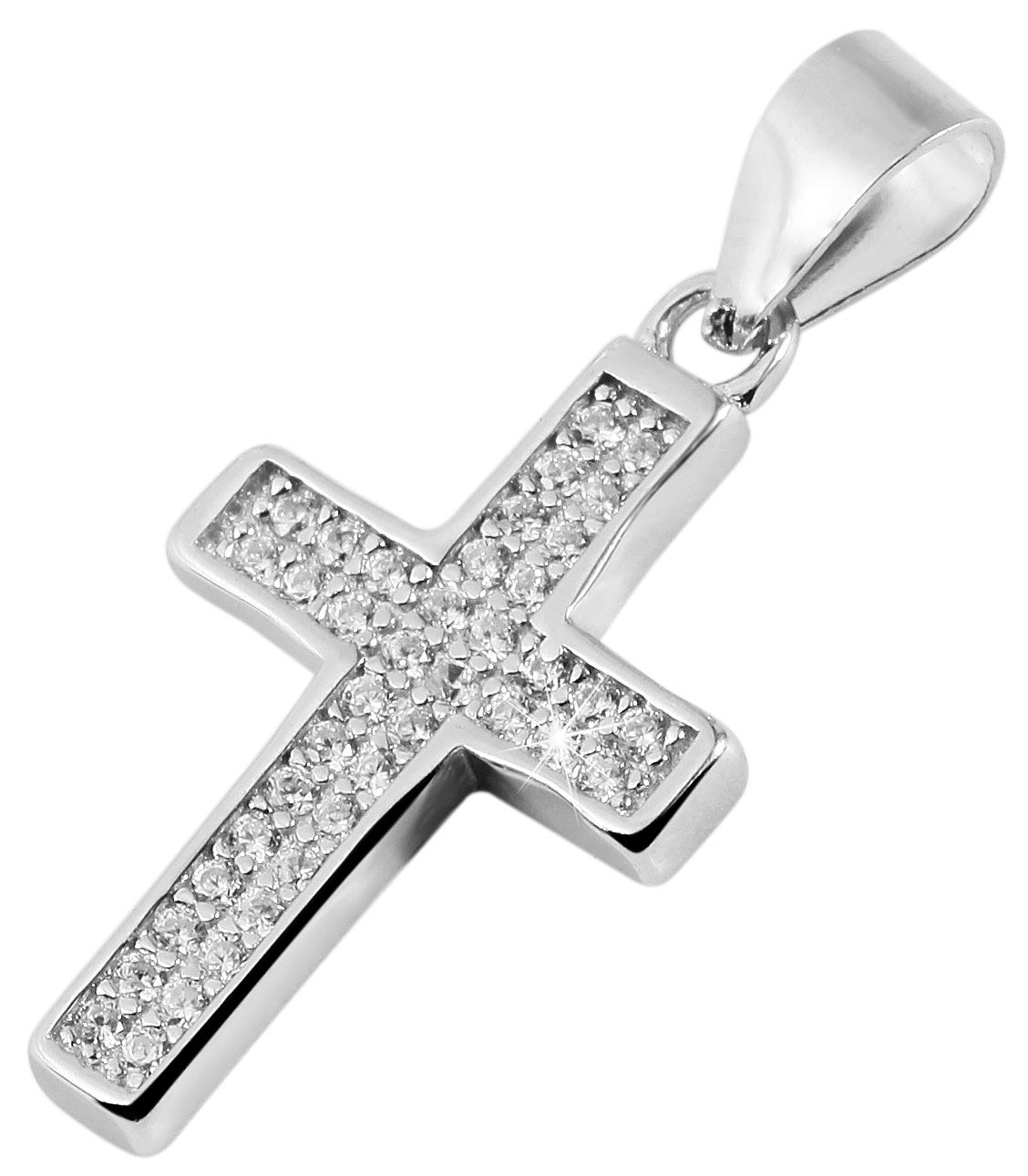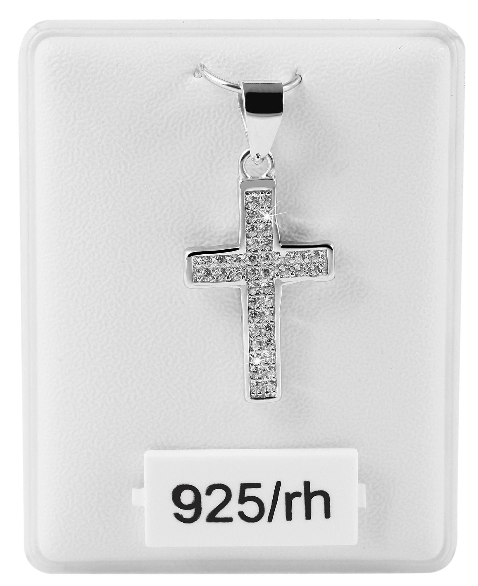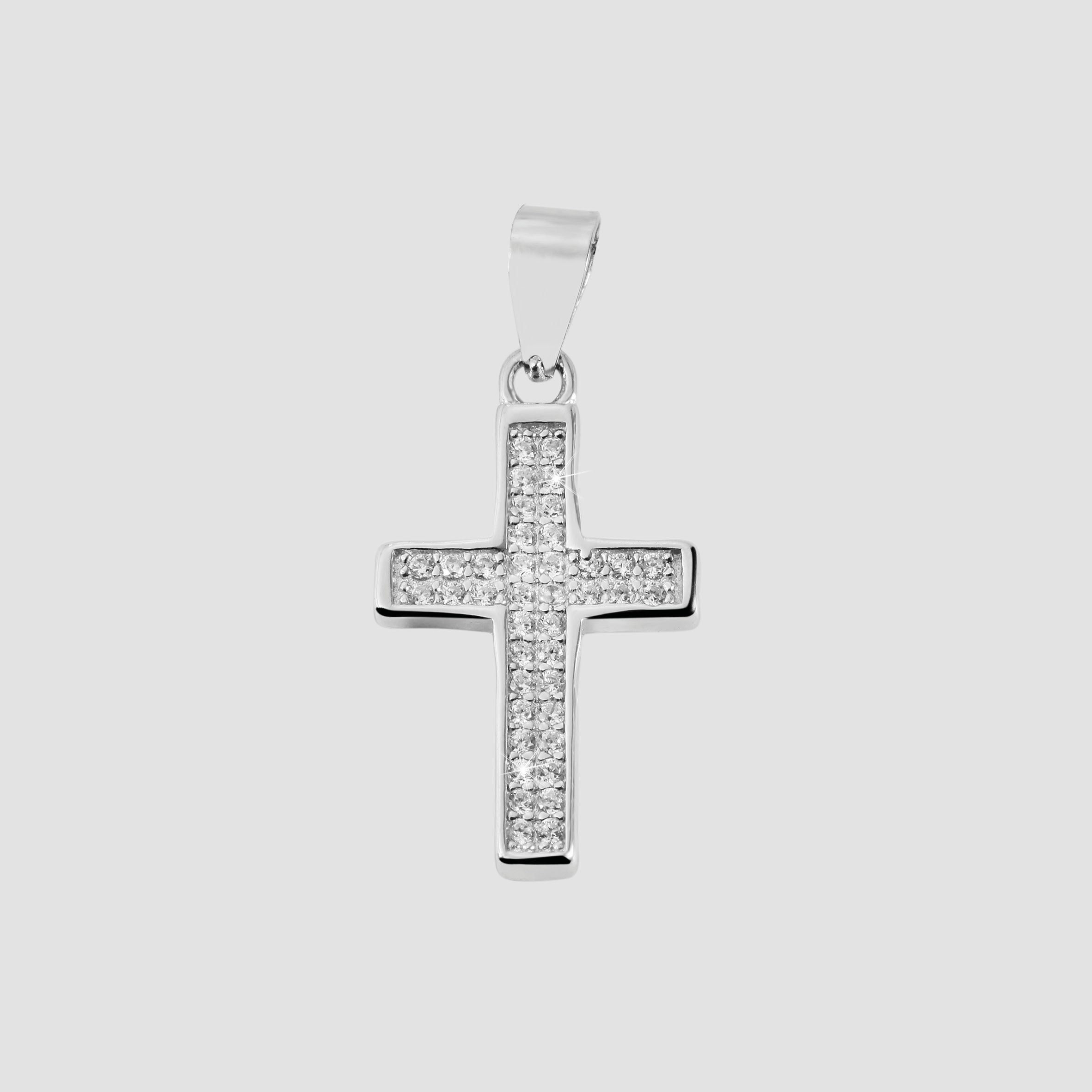 De kettinghanger in de vorm van een kruis is gemaakt van 925/- sterling zilver en heeft een extra rodium coating. Deze hoogwaardige coating beschermt het sieraad tegen aantasting en geeft het een bijzonder hoge glans. Het kruis is versierd met 40 fonkelende zirkonia steentjes. Dit fijne detail geeft de hanger een eenvoudige elegantie, het is het perfecte accessoire voor elke gelegenheid en ideaal om cadeau te geven, bijvoorbeeld voor communie, vormsel of doop. Dankzij een ovaal oogje kan de hanger aan verschillende kettingen worden bevestigd. Houd er bij de aankoop van dit product rekening mee dat de ketting niet is inbegrepen. De afmetingen zijn 20 mm lang, 12 mm breed en 2 mm dik. Dit product wordt geleverd op een witte sieradenkaart. De afmetingen zijn 45 x 35 mm en ideaal om te presenteren in een passende display of om cadeau te geven.