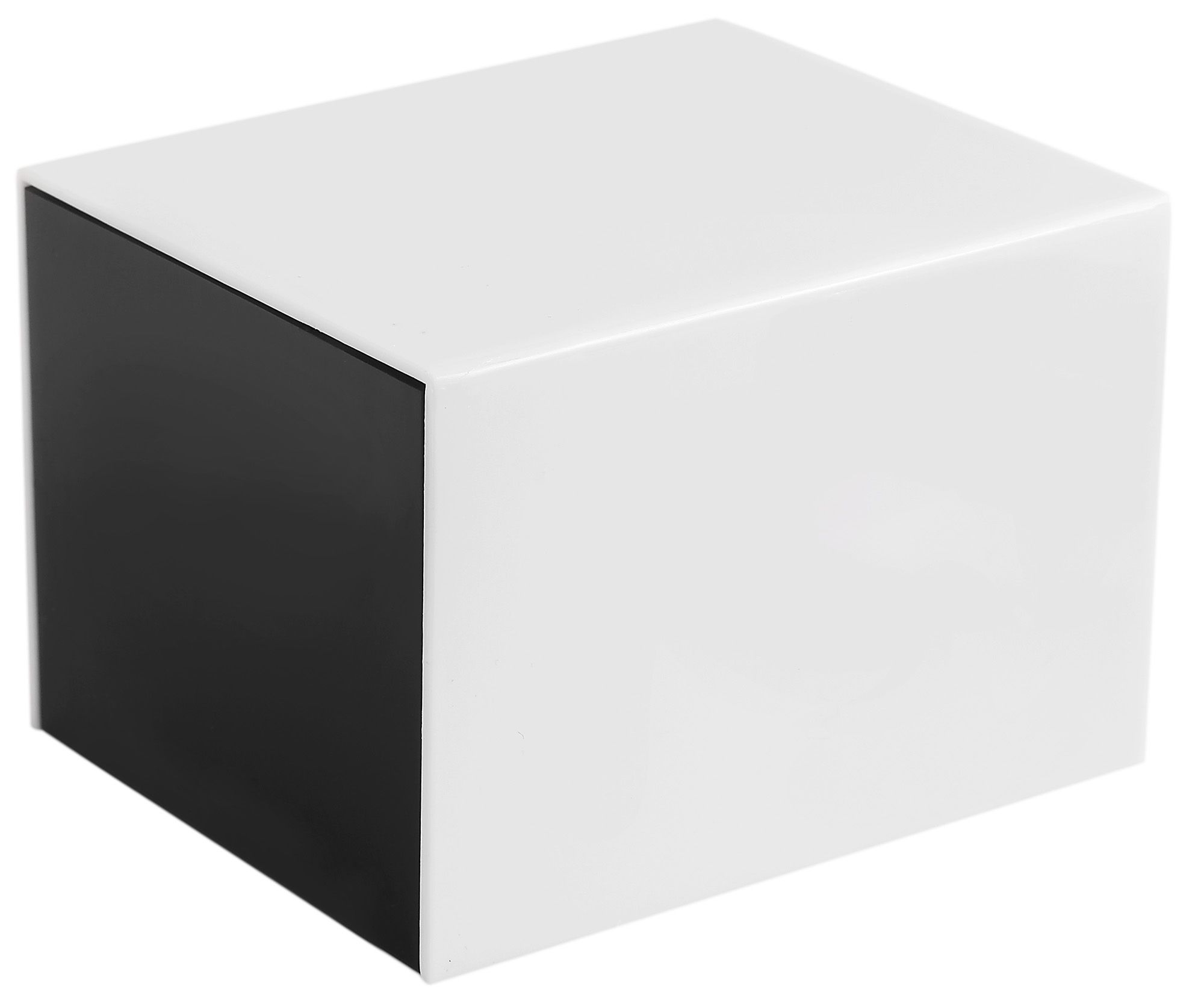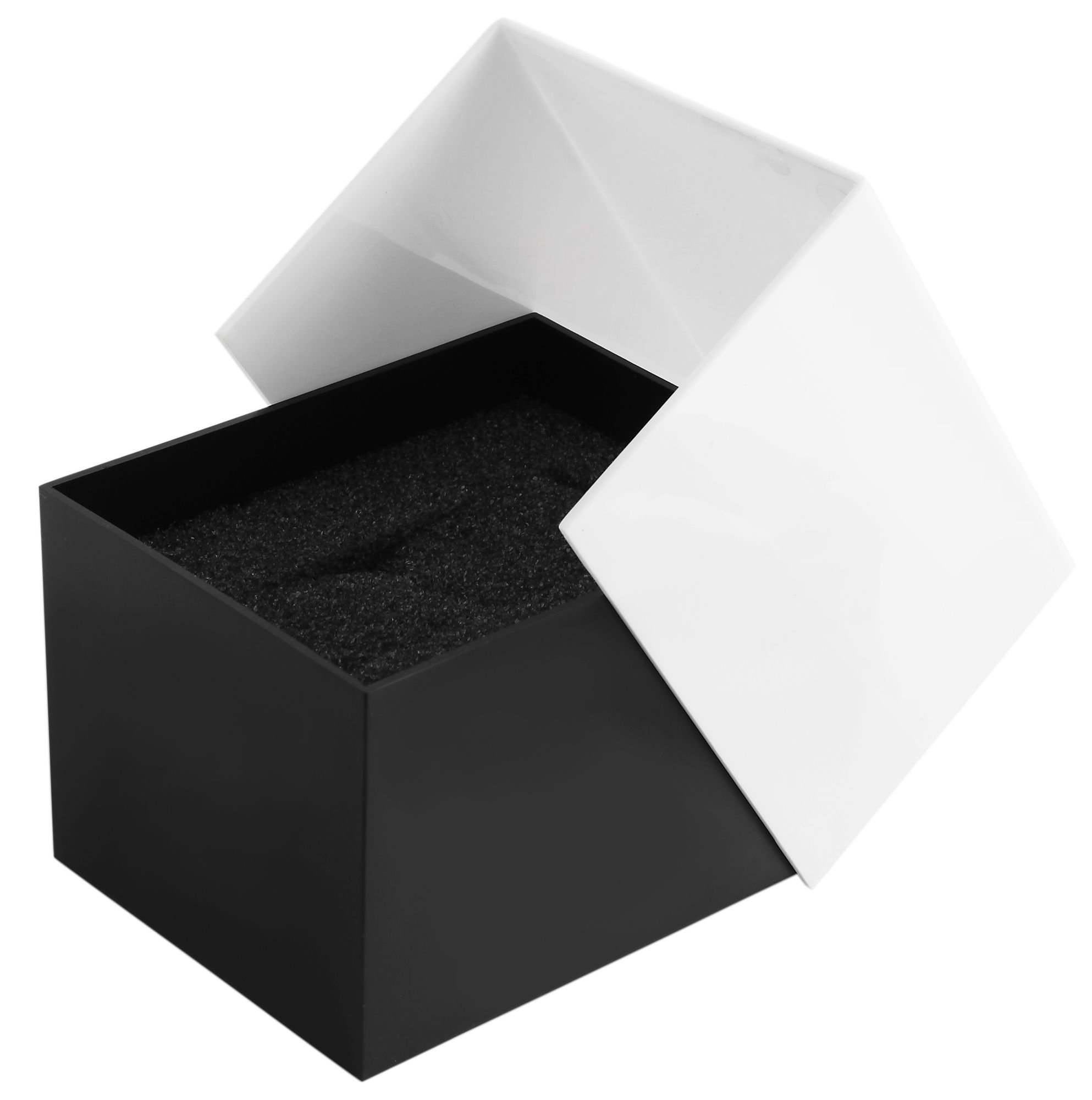 De horlogedoos is gemaakt van kunststof, het onderste gedeelte is zwart en het deksel is wit. Binnenin zit een grijze schuimrubberen inleg met een uitneembaar horlogekussentje. De doos is ideaal voor het presenteren en opbergen van horloges, maar ook voor andere geschikte sieraden. De glanzende look en het speciale vouwmechanisme geven de verpakking een uniek design. De afmetingen van de horlogedoos zijn 9,9 cm lang, 8,1 cm breed en 6,8 cm diep.