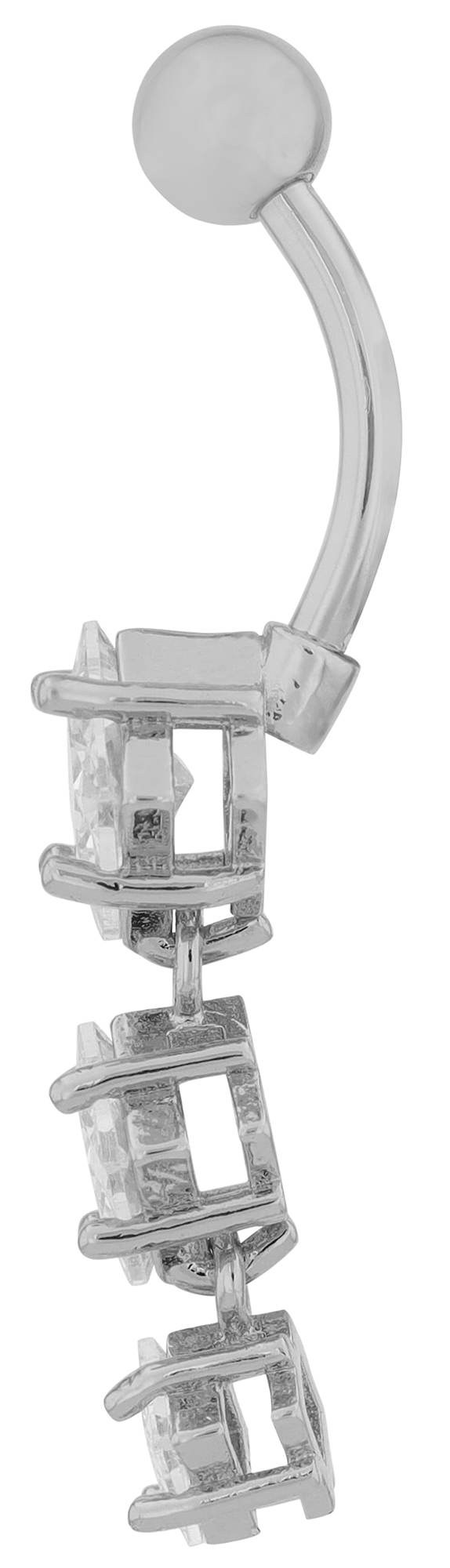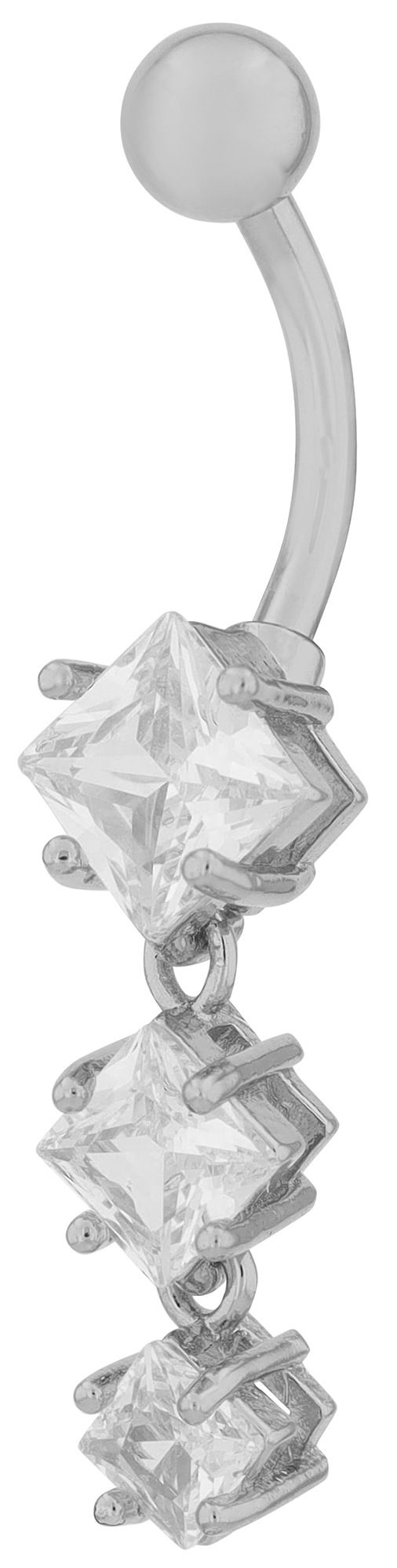 Je bent helemaal trendy met deze hoogwaardige roestvrijstalen navelpiercing. De combinatie van goud- en zilverkleurig design geeft dit sieraad een elegante touch. De 12 mm lange en 2 mm dikke staaf zorgt voor een comfortabele pasvorm en hoge stabiliteit. Het hoogtepunt van deze piercing zijn de vierkante zirkonia steentjes: één vaste en twee beweegbare steentjes in verschillende groottes zorgen voor een fascinerende schittering bij elke beweging. Met een totale lengte van 38 mm is deze piercing een elegante blikvanger en combineert tijdloze elegantie met een perfect design.