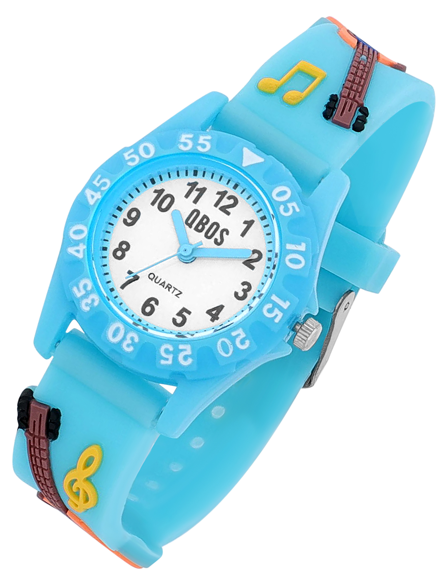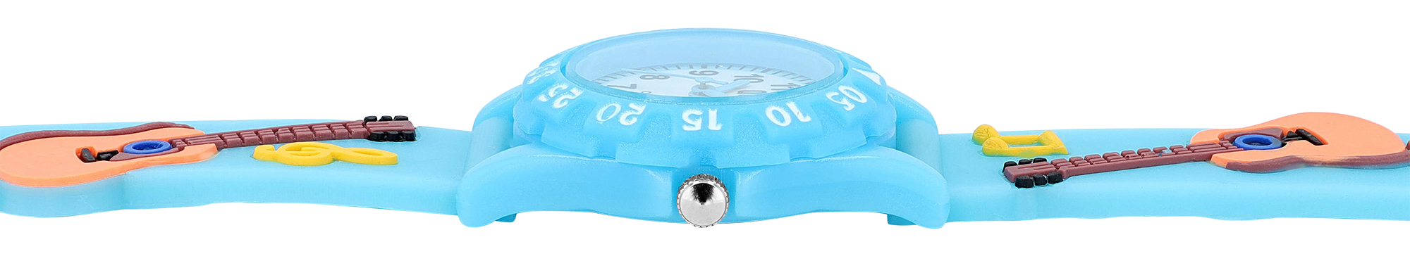 Qbos Kinderuhr mit Silikonband, bunt, Motiv Gitarre, Ø 28 mm, hellblau