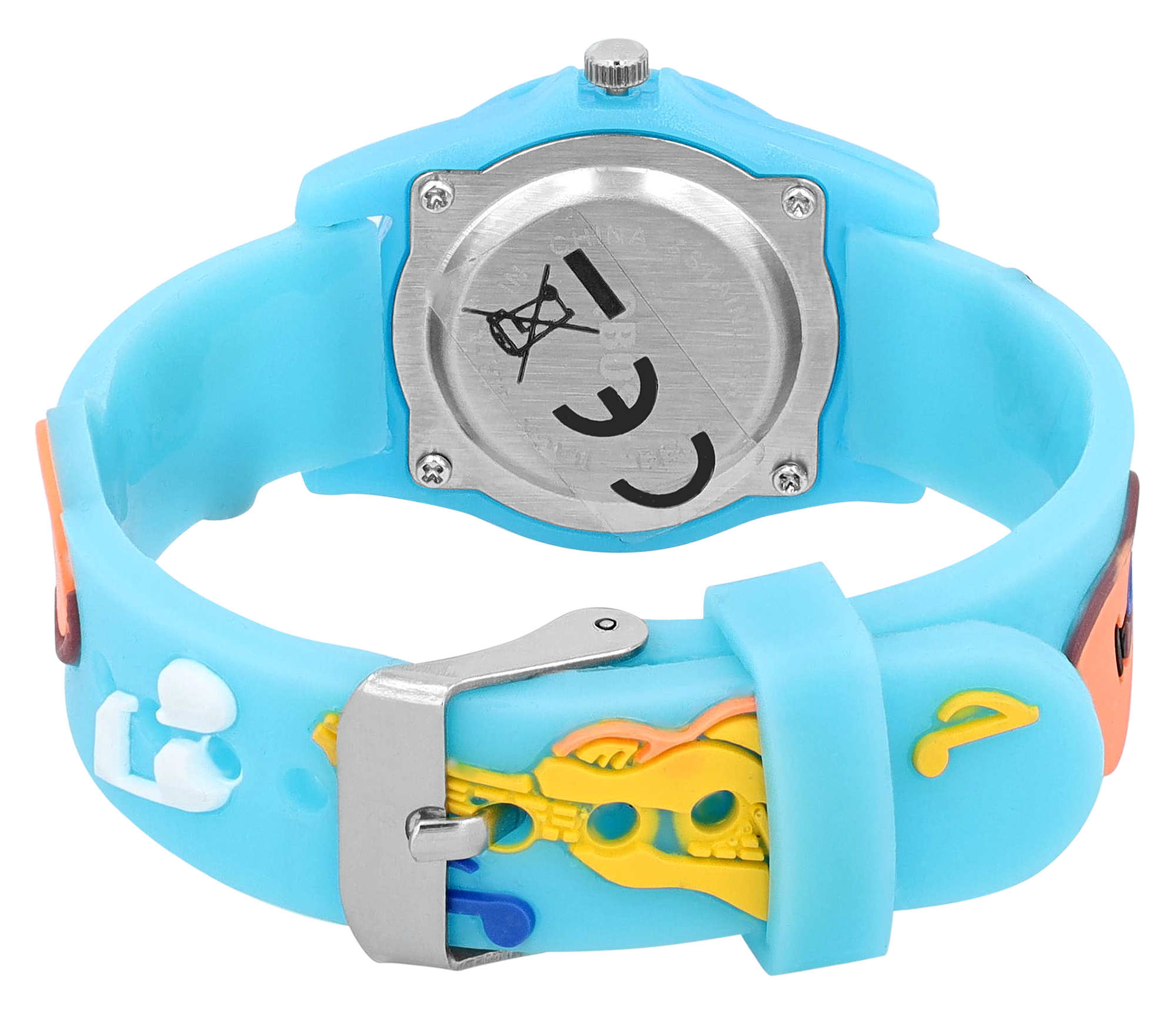 De kast is gemaakt van kunststof en de band is gemaakt van zacht siliconen, waardoor het zeer comfortabel is om te dragen. Er zit een hoogwaardig kwartsuurwerk in, beschermd door stevig, krasbestendig mineraalglas aan de bovenkant en een roestvrijstalen achterkant aan de onderkant van de kast. Het horloge is ontworpen in een speelse casual stijl met een gitaarmotief op de band. De kast heeft een diameter van 28 mm en een kasthoogte van 9 mm. Hij is rond en heeft een lunette met cijfers van 5 tot 55, waardoor de seconden en minuten op de analoge wijzerplaat met grote Arabische cijfers gemakkelijk af te lezen zijn.