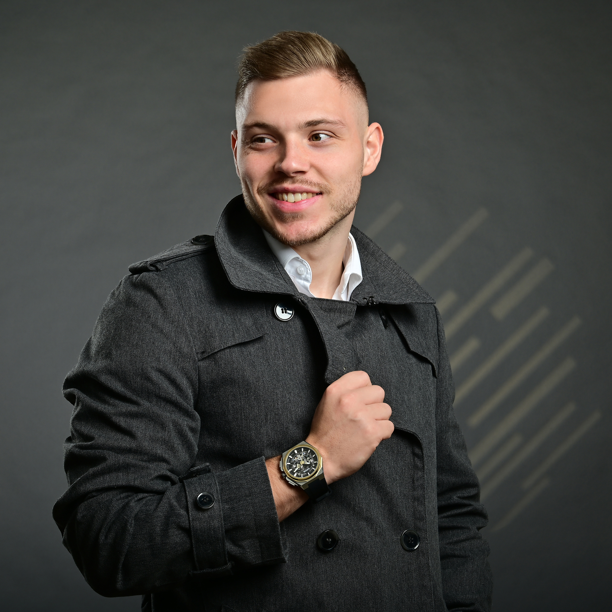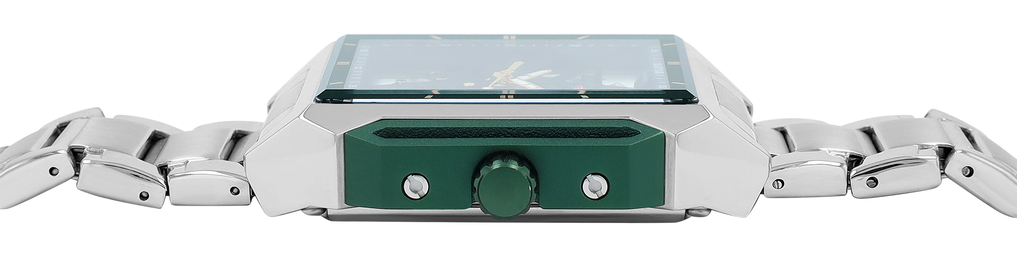 De look wordt afgerond door een massief roestvrijstalen schakelarmband: geborstelde, grotere binnenste schakels ontmoeten gepolijste, kleinere buitenste schakels - een elegant contrast dat comfort en karakter combineert. Met een brugbreedte van 22 mm en een totale lengte van 24 cm zit het horloge perfect om de pols.