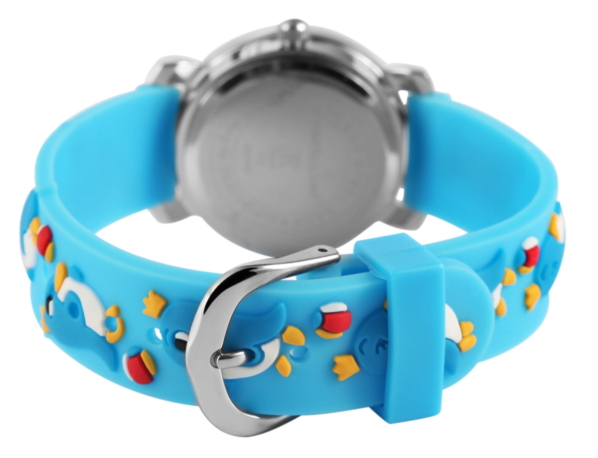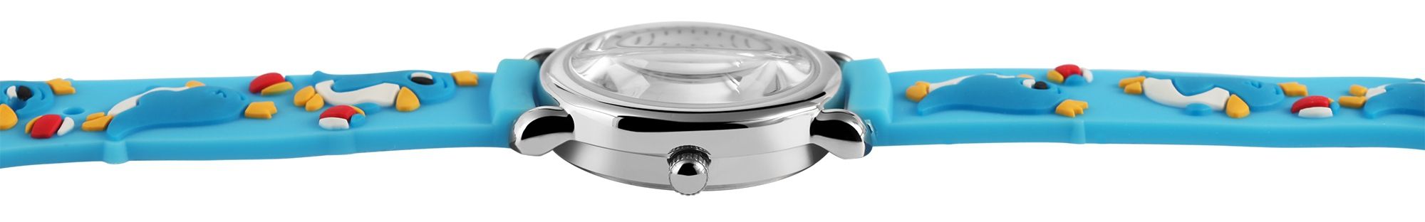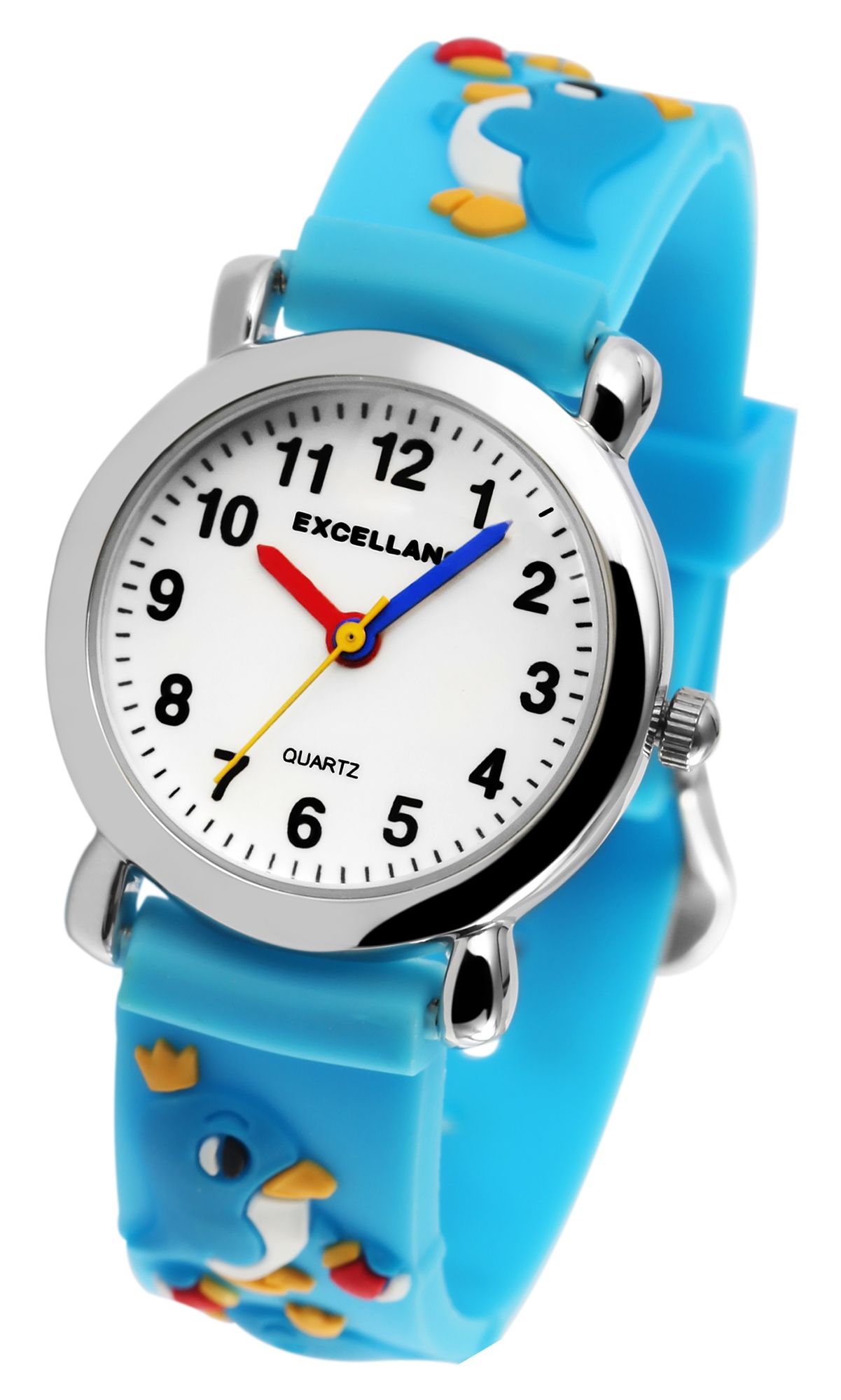 Het analoge 3-hands kinderpolshorloge van het merk Excellanc heeft een hoogwaardig PC21 kwartsuurwerk. De siliconen band is 14 mm breed bij de lug en kan worden geopend en gesloten met een gesp. De totale lengte van het horloge is 20 cm. De zilverkleurige metalen kast met mineraalglas heeft een diameter van 27 mm en een kasthoogte van 10 mm. De achterkant van de kast is gemaakt van roestvrij staal. De lichtblauwe rubberen band is versierd met verschillende pinguïns en is comfortabel om te dragen. De witte wijzerplaat is bedrukt met zwarte cijfers. De uurwijzer is rood en de minutenwijzer is blauw. De seconden worden aangegeven door een gele wijzer.