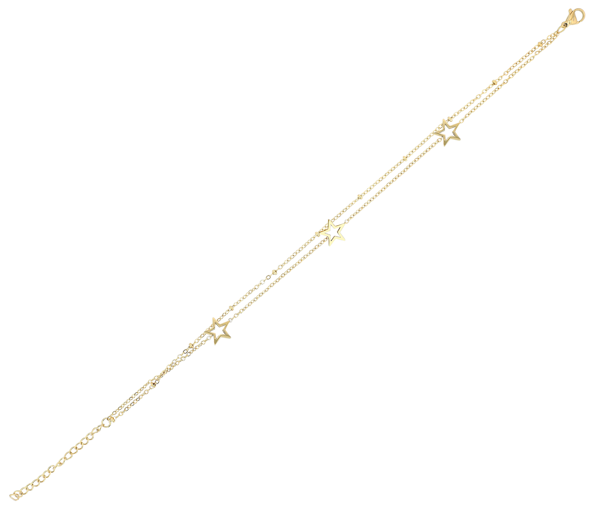 Het bijzondere aan dit ontwerp zit in de details: een van de kettingen is versierd met drie geïntegreerde sterhangers die speels het licht vangen. De andere ketting wordt op regelmatige afstanden onderbroken door kleine, ronde roestvrijstalen elementen die voor een modern accent zorgen. Een veilige roestvrijstalen karabijnsluiting garandeert dat dit accessoire altijd perfect past. Dit maakt "Svea" tot een moderne en veelzijdige enkelband die elke look compleet maakt.