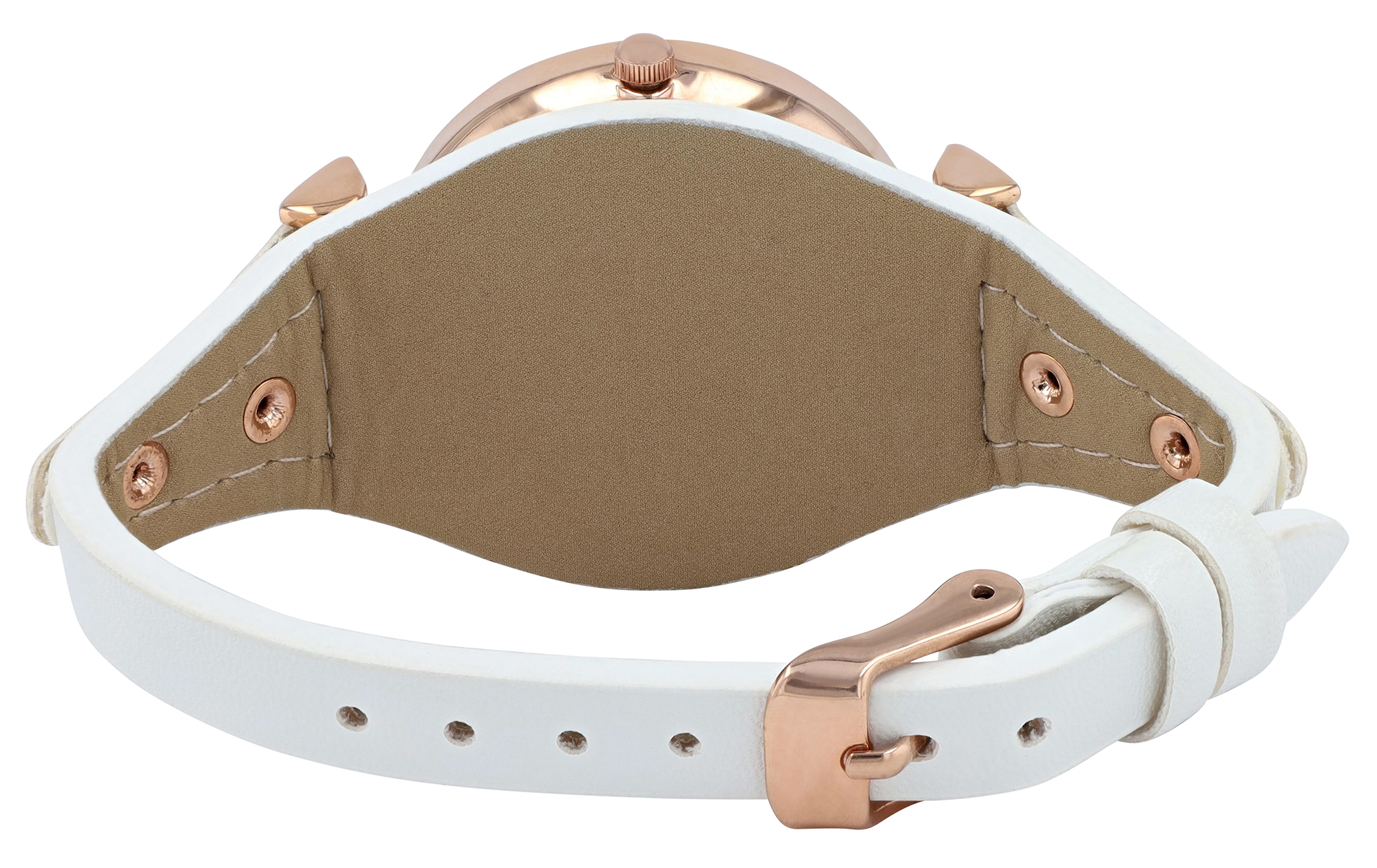 Een modieus contrast wordt gecreëerd door de brede onderarmband van wit imitatieleer. De totale breedte van de armband is 33 mm op het breedste punt, wat zorgt voor een opvallende verschijning. De breedte van de band is 16 mm. De band wordt vastgemaakt met een klassieke roségoudkleurige gesp met een breedte van 8 mm.