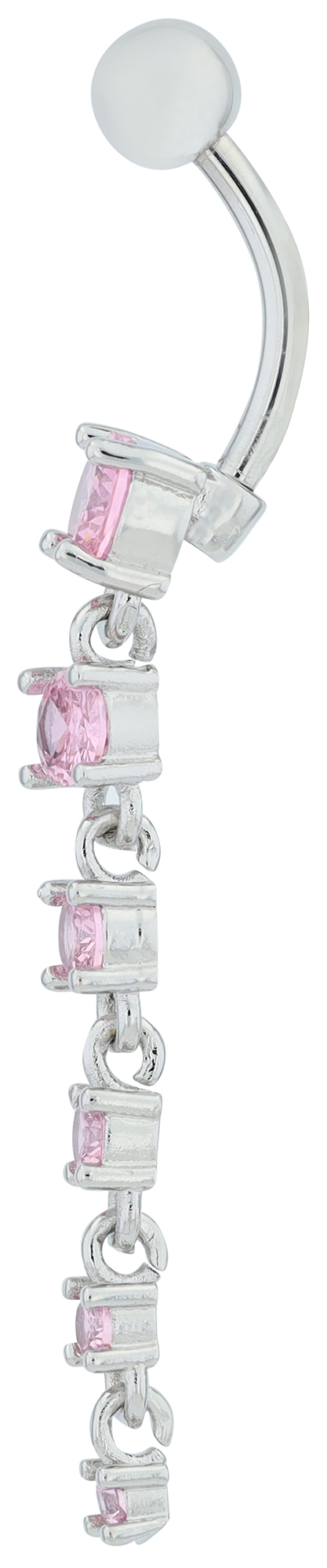 Deze stijlvolle navelpiercing van hoogwaardig roestvrij staal combineert elegantie en kwaliteit. Met een totale lengte van 50 mm maakt hij een indrukwekkend statement. De vijf beweegbare roze zirkonia steentjes zijn in grootte getrapt en creëren een mooi, vloeiend effect. De prongzetting houdt de stenen stevig vast en benadrukt hun schittering. De piercing is verkrijgbaar in twee kleuren en maakt indruk met een staaflengte van 11 mm en een staafdikte van 2 mm - perfect om comfortabel te dragen. Een elegant accessoire dat zowel modern als klassiek is.