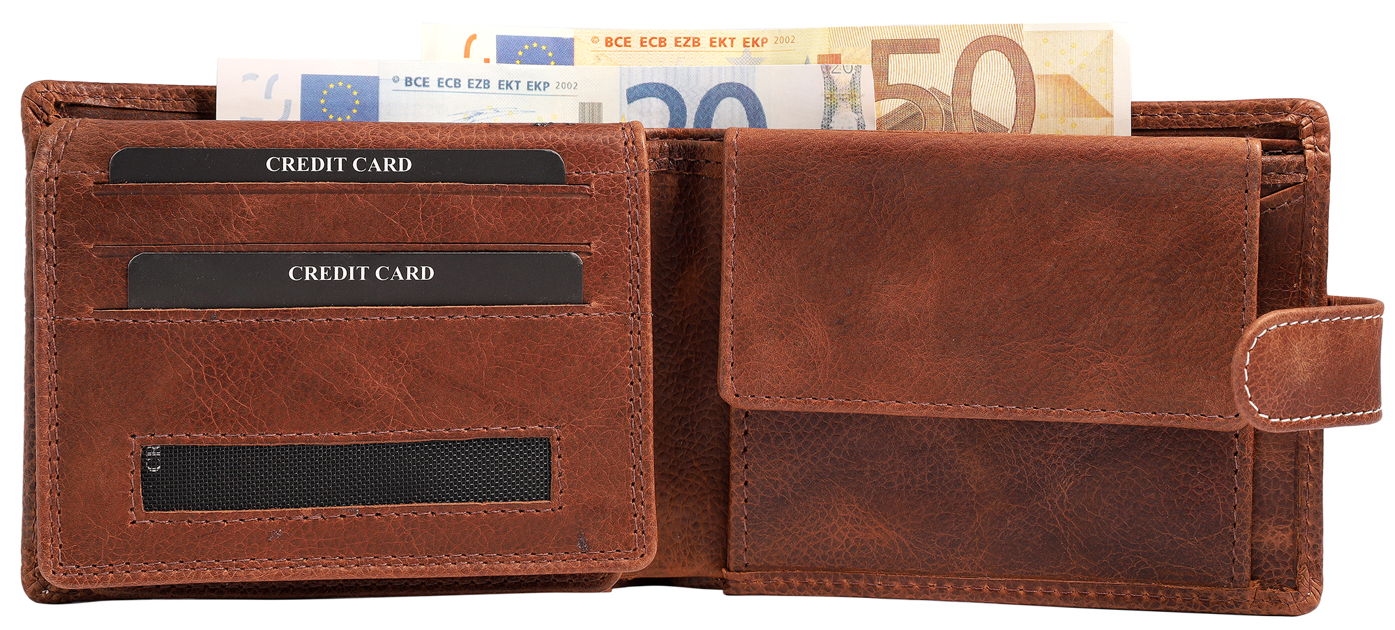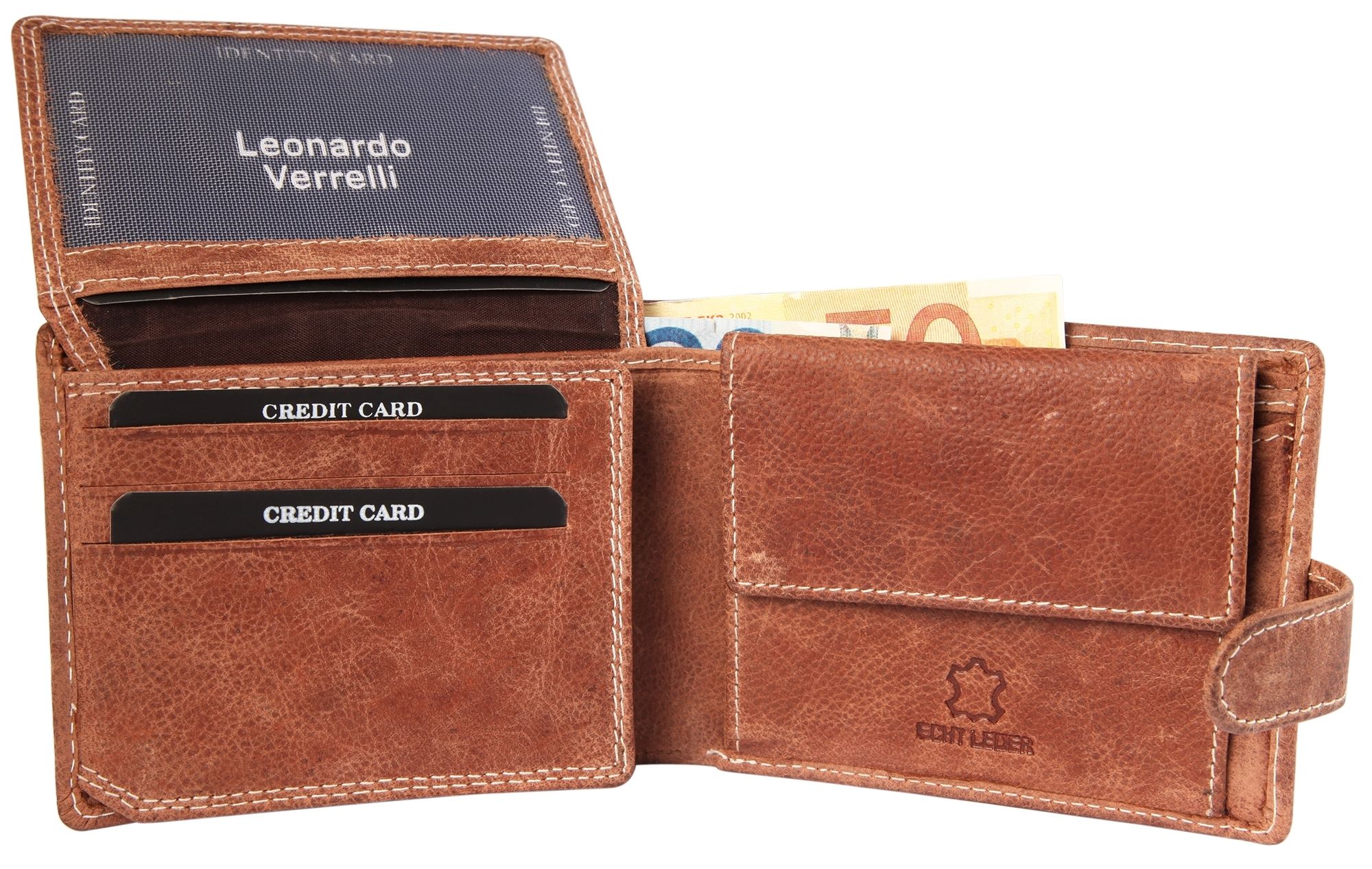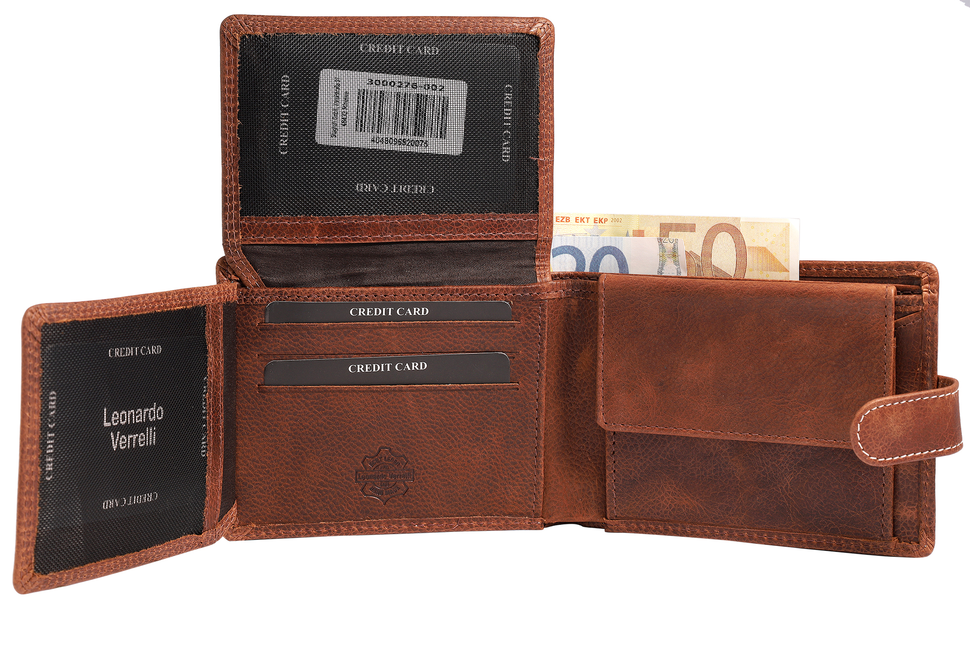 Leonardo Verrelli, echt lederen (Distressed Hunter) damesportemonnee, RFID, liggend formaatvoor de moderne man die waarde hecht aan praktische organisatie en voldoende ruimte voor al zijn belangrijke kaarten. De geïntegreerde RFID-bescherming blokkeert het lezen van uw gegevens en beschermt zo uw creditcards en ID-kaarten tegen onbevoegde toegang. De portemonnee wordt betrouwbaar gesloten met een drukknoop, zodat de inhoud veilig is opgeborgen.