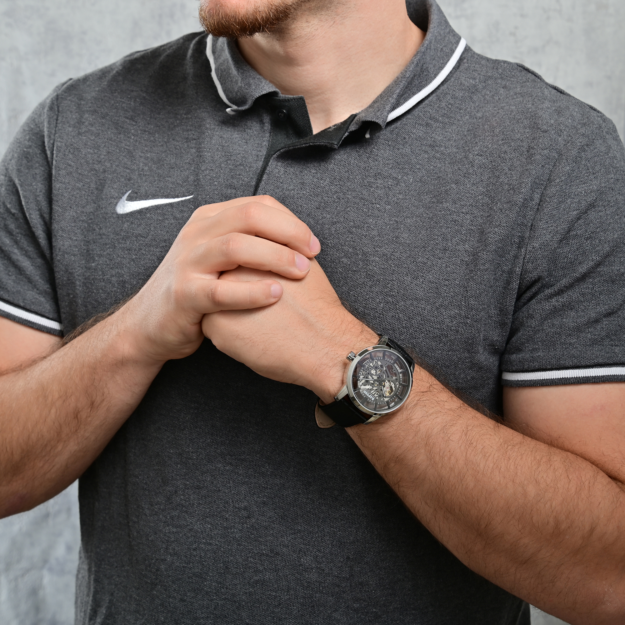 Dit moderne herenhorloge met skelet is meer dan alleen een uurwerk - het is een statement. Een combinatie van technisch raffinement, tijdloze esthetiek en hoogwaardige afwerking die je persoonlijkheid benadrukt. De 44 mm roestvrijstalen kast met een hoogte van 15 mm geeft het horloge een constante aanwezigheid om de pols. Het gebogen mineraalglas aan de voorkant creëert diepte en geeft het ontwerp een elegante dynamiek. Aan de achterkant biedt een volledig transparant mineraalglas een fascinerend zicht op het mechanische automatische uurwerk - de kunst van horlogemaken die leeft en ademt.