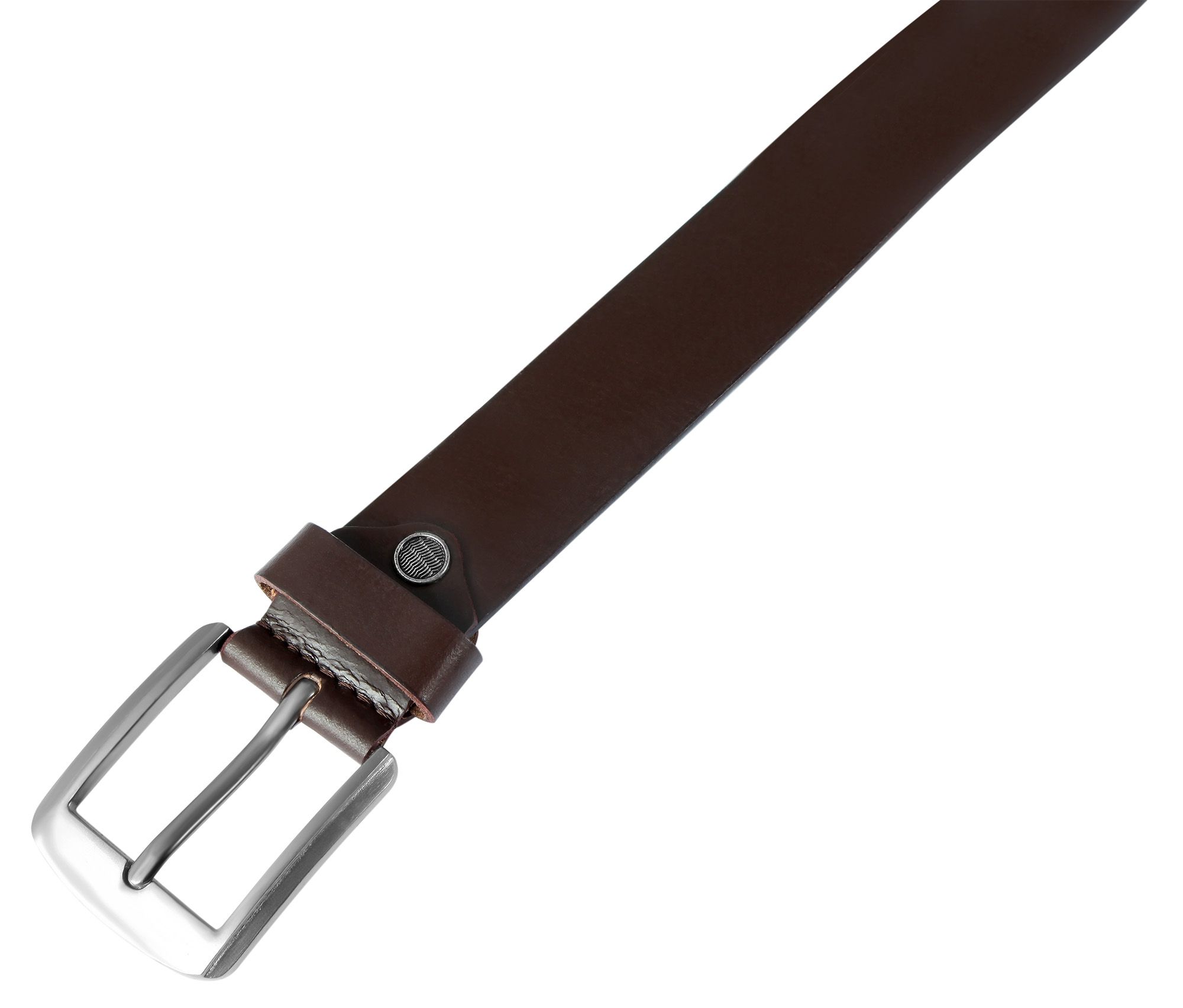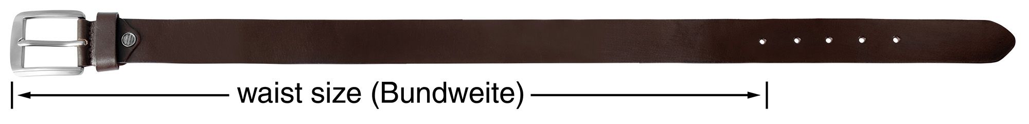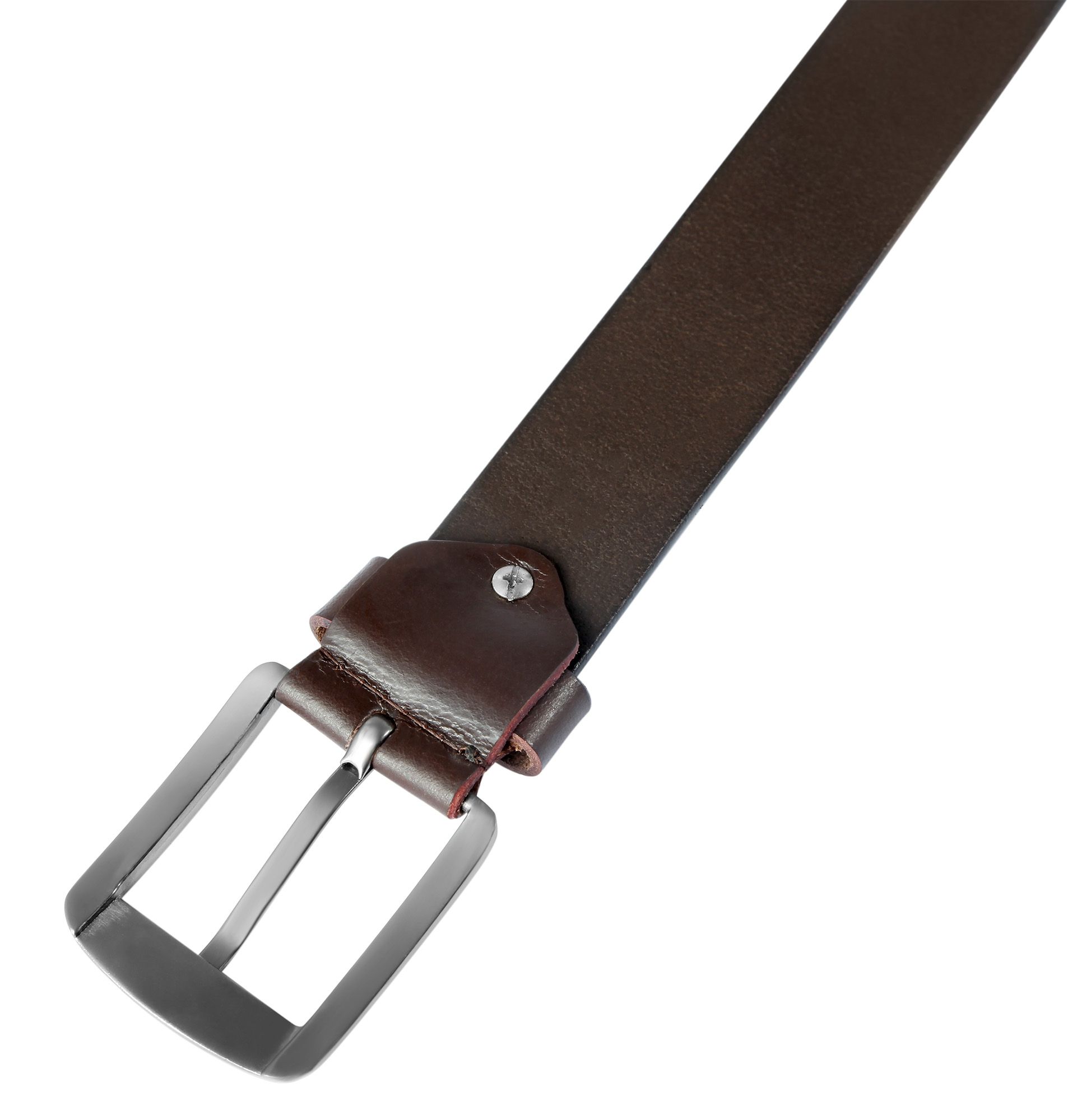 Deze bruine riem van het merk Leonardo Verrelli is gemaakt van generfd rundleer en heeft een gladde afwerking met een subtiele nerf. Hij heeft een taillewijdte van 90 cm, is 3,7 cm breed en 0,3 cm dik. De gaten zitten 2,5 cm uit elkaar. Dit maakt de leren riem veelzijdig, omdat hij gemakkelijk door de gebruikelijke riemlussen kan worden gehaald. Dankzij het hoogwaardige, natuurlijke materiaal is deze riem bijzonder robuust, duurzaam en scheurbestendig, waardoor het de ideale metgezel is voor alle gelegenheden. De metalen gesp wordt bevestigd met een schroef, waardoor de riem gemakkelijk kan worden ingekort en aangepast aan elke tailleomvang. De maat van de riem wordt aangegeven in taillebreedte, die 15 cm korter is dan de totale lengte.