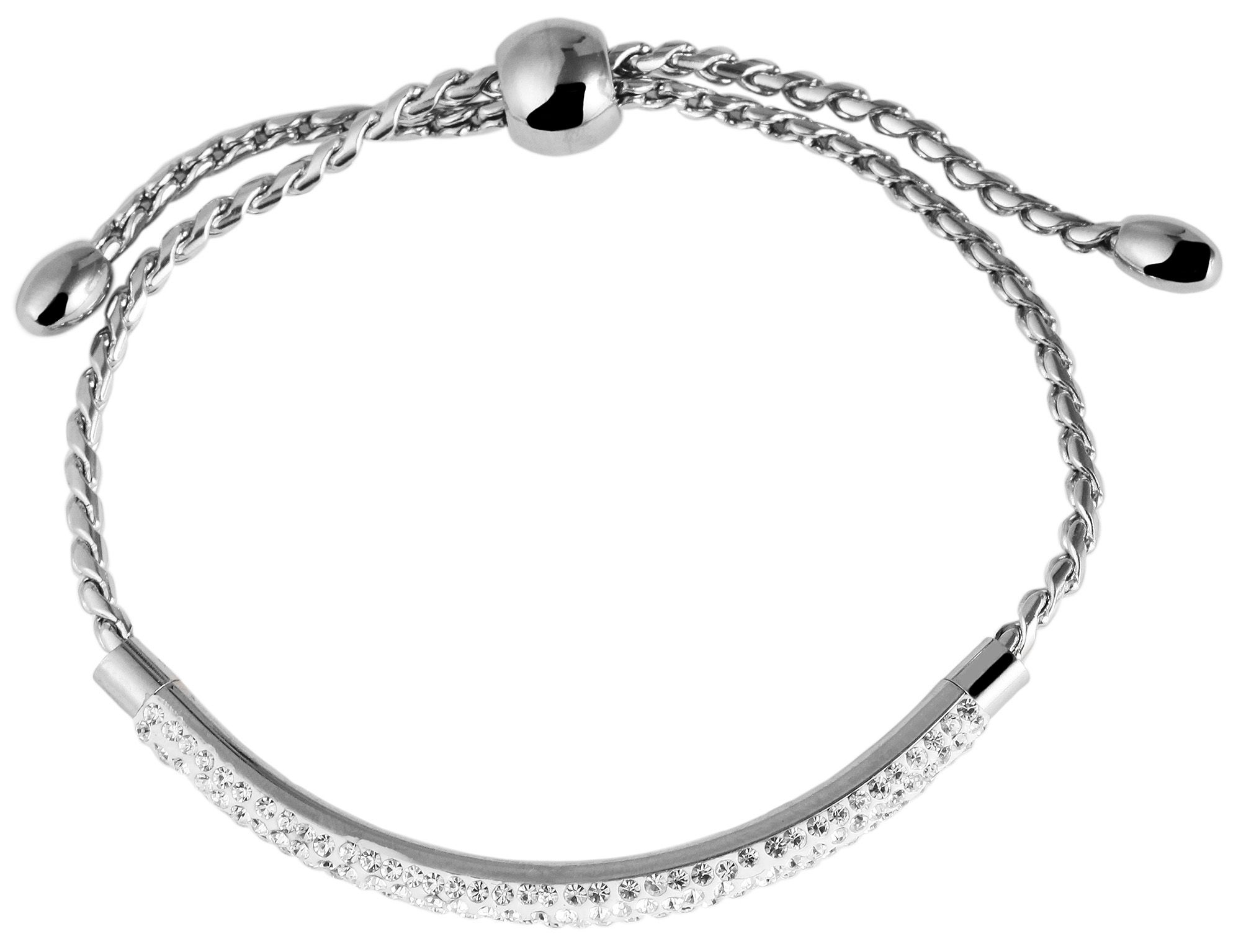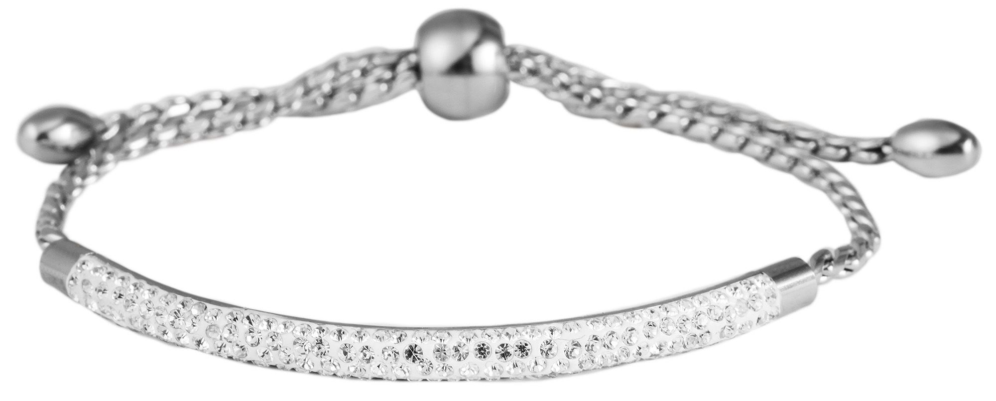 De vrouwelijke armband in een curb chain-design is gemaakt van roestvrij staal en is zilverkleurig. In het midden van de armband bevindt zich een roestvrijstalen element dat in vier rijen gelijkmatig is bezet met in totaal 164 simillietstenen. De armband kan individueel worden aangepast aan elke pols met behulp van een praktische treksluiting, die is versierd met een halfronde kraal met een diameter van 9 mm. De roestvrijstalen armband is een echte blikvanger dankzij de stralende Similis-stenen. De armband heeft een totale lengte van 23 cm, een breedte van 4 mm en een dikte van 2 mm.