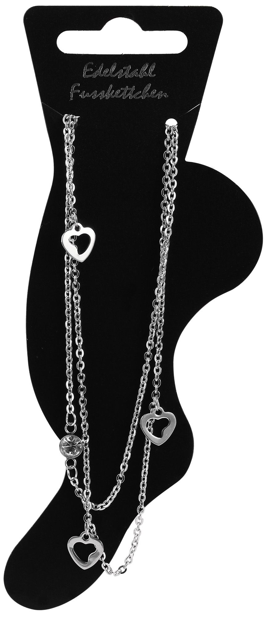De enkelband van het merk Akzent bestaat uit twee zilverkleurige ankerkettingen van verschillende lengtes. De kortste van de twee kettingen is 26 cm lang en is versierd met een similietsteen van 4 mm in het midden. De langste van de twee kettingen is 27,5 cm lang en is gelijkmatig verdeeld met drie kleine zilverkleurige hartvormige hangers. Deze zijn 10 mm lang en 9 mm breed. De speelse enkelband kan worden geopend en gesloten met een zilverkleurige karabijnsluiting, die ook van roestvrij staal is gemaakt. Aan één uiteinde van de enkelband is ook een 5 cm lange verlengketting bevestigd. Hierdoor is het mogelijk om de lengte met maximaal 5 cm te variëren en de enkelband aan elke enkel aan te passen. De afmetingen resulteren uit een lengte van 26 cm en een kettingdikte van 1 mm. Het moderne enkelsieraad maakt elke outfit af en is ook een geweldig cadeau. Bijvoorbeeld voor een verjaardag, Kerstmis of Valentijnsdag.