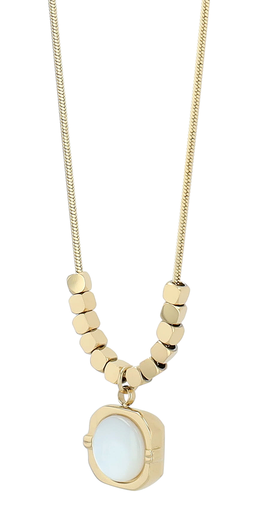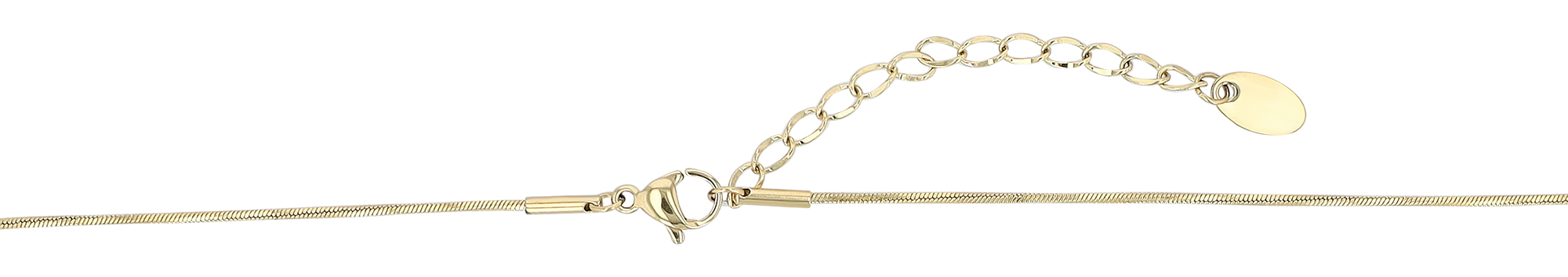 Diese elegante Halskette besteht aus hochwertigem Edelstahl, der robust und langlebig ist, um auch bei täglichem Gebrauch zu bestehen. An der Schlangenkette ist ein wunderschöner Anhänger mit feinem goldfarbenem Rand und mit Echt-Muschel Besatz angebracht. Auch ein Highlight sind die beweglichen Quadrate,die jeweils rechts und links neben dem Anhänger an der Kette befestigt sind. Mit einer Länge von 40,5 cm und einem Verlängerungskettchen von 5 cm ist die Halskette perfekt für jeden Halsumfang geeignet. Sie setzt beim Tragen gekonnt ein Statement am Dekolleté und strahlt dabei eine subtile Eleganz aus, um dem Look einen Hauch von Glamour zu verleihen. Der Karabinerverschluss macht das An- und Ausziehen einfach und schnell und verhindert ein eigenständiges Öffnen.