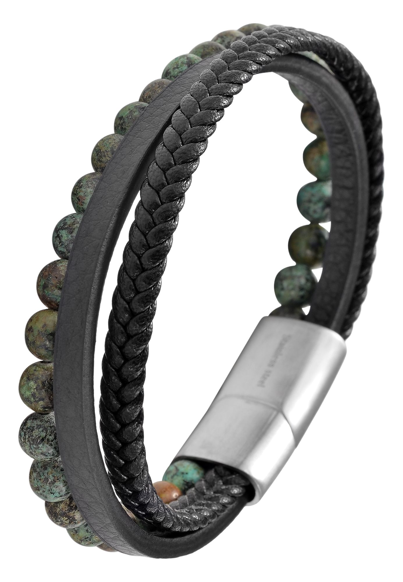 Das Echtlederarmband der Marke Akzent ist aus einer Kugelkette und zwei Lederriemen gefertigt. Der erste Lederriemen ist aufwendig geflochten und hat eine Breite von 6 mm und eine Materialstärke von 2,5 mm. Der zweite Lederriemen hat eine glatte Oberfläche, ist 5 mm breit und hat eine Materialstärke von 3 mm. Die Kugelkette besteht aus 29 grünen Tigerauge Kugeln. Öffnen und schließen lässt sich das moderne Schmuckarmband mit einer silberfarbenen Magnetschließe, die ebenfalls aus Edelstahl gefertigt ist. Die Maße ergeben sich aus einer Gesamtlänge von 21 cm oder 23 cm, einer Breite von 18 mm und einer Stärke von 7 mm. Das Armband ist ein toller Begleiter für den Alltag und eignet sich gut als Geschenk.