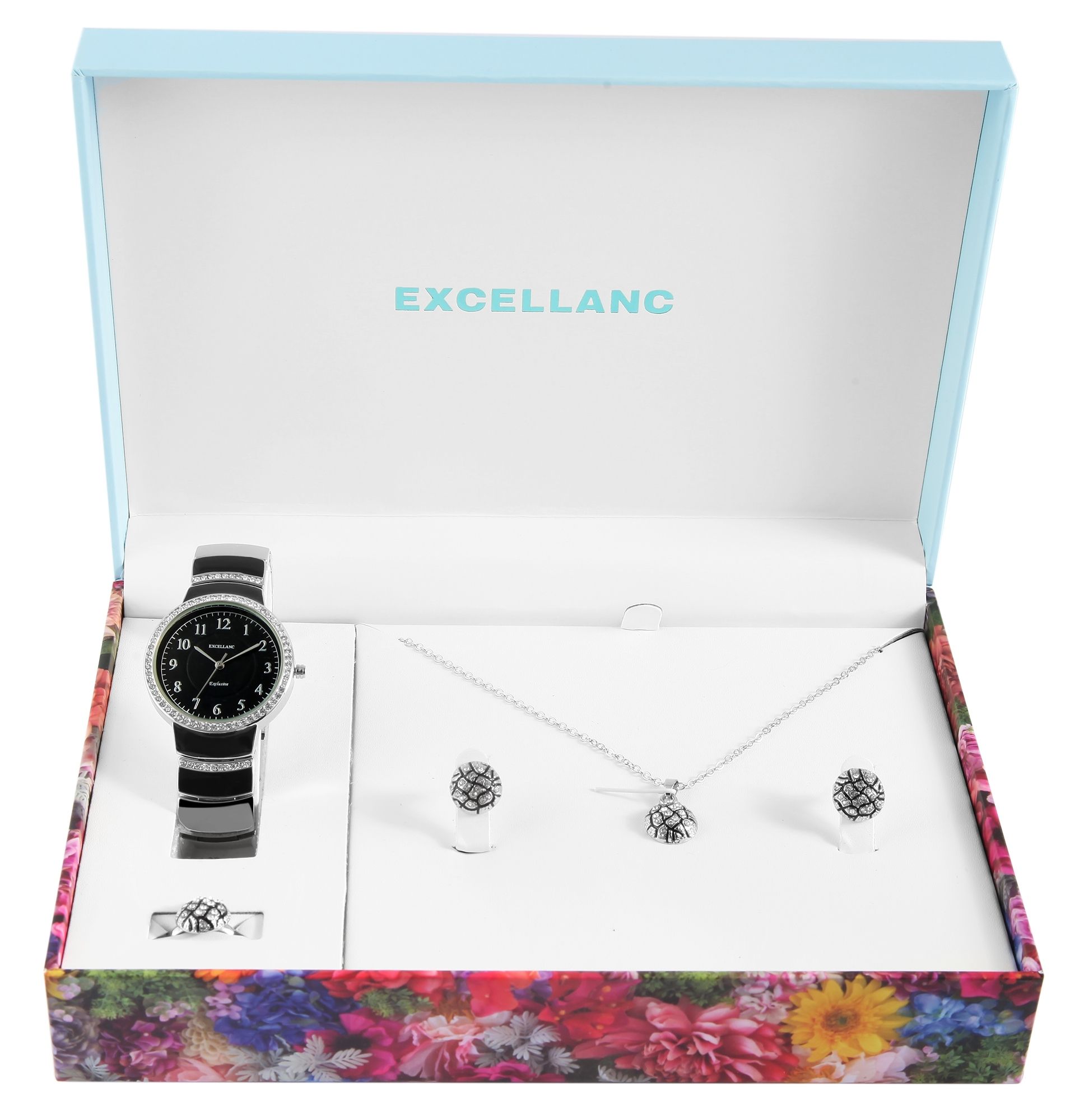 Productinformatie "Excellanc Geschenkset mit Damenuhr, Halskette, Ring und Ohrsteckern, silberfarben/schwarz"