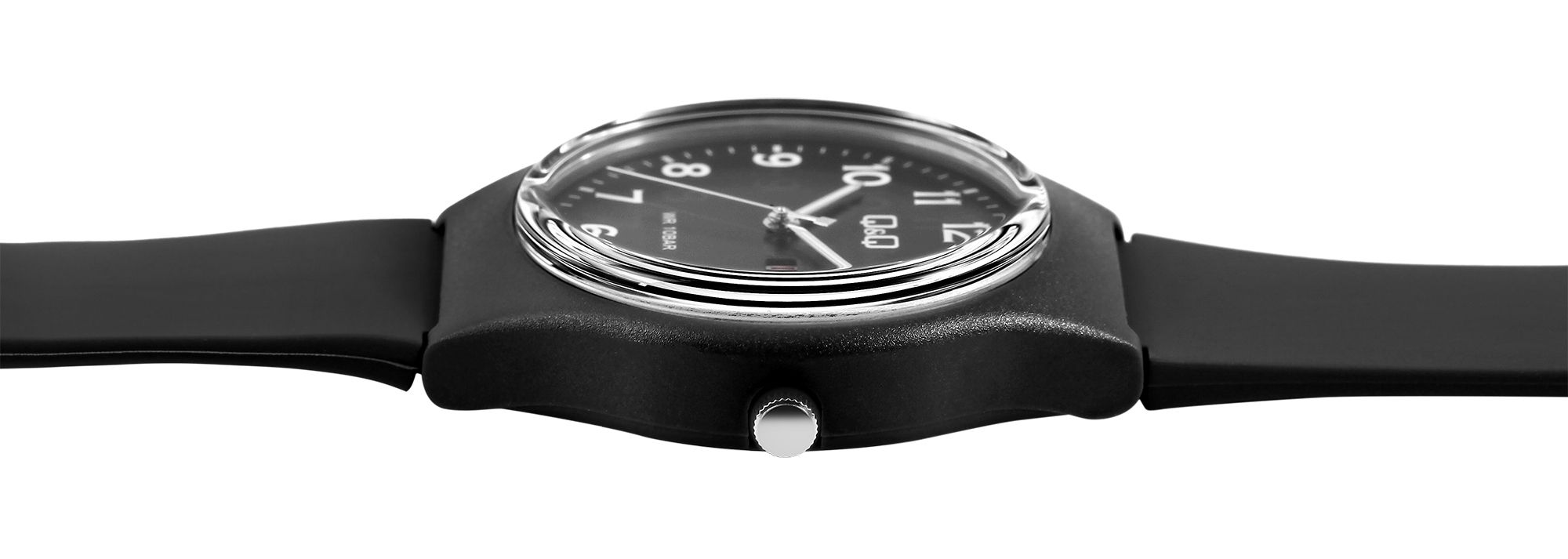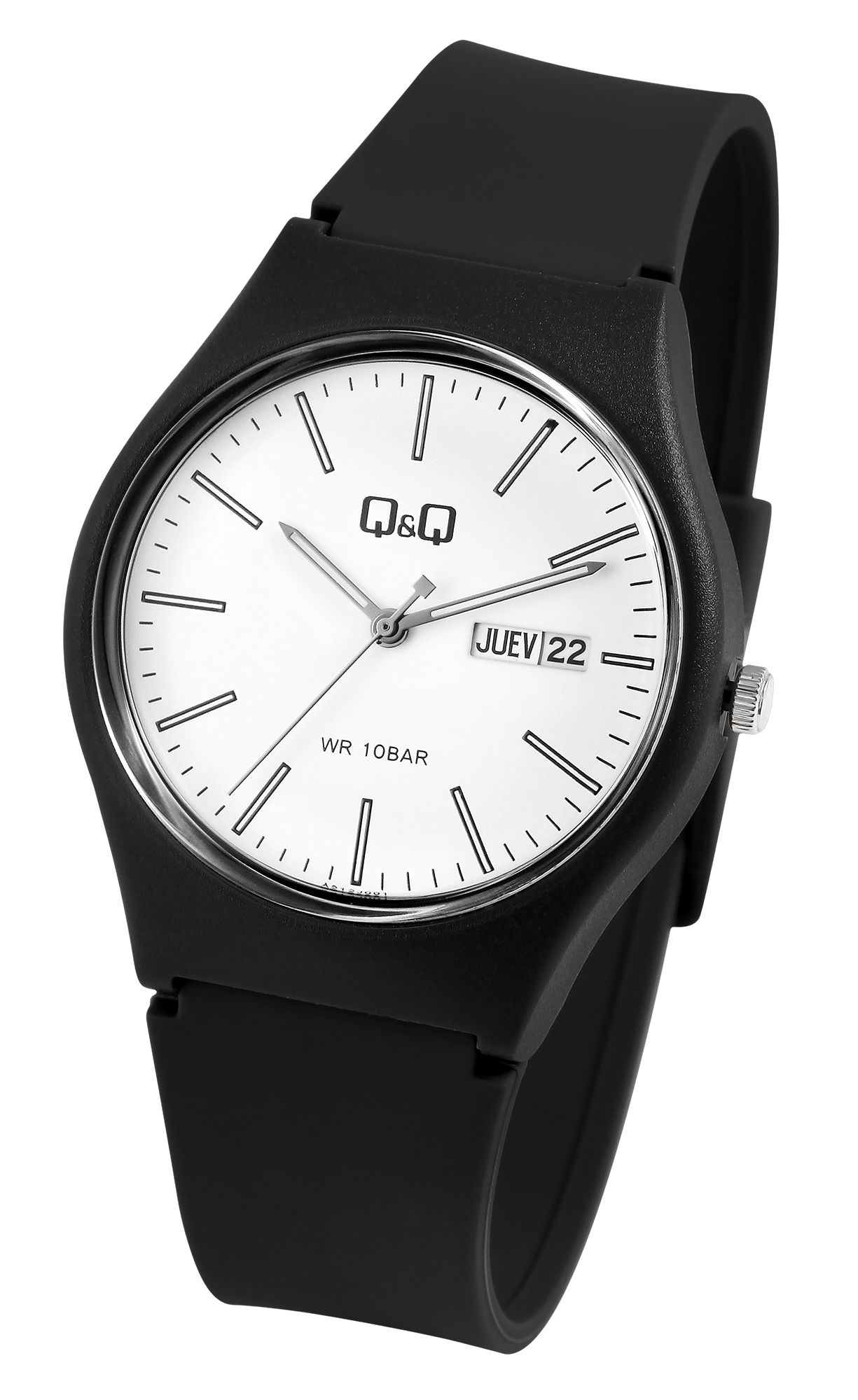 Diese Q&Q - by Citizen Watch Co. LTD Uhr kommt mit einem leichten und extrem widerstandsfähigen Kunststoffgehäuse Ø 38 mm und einem kratzfesten Kunststoffglas. Für Tragekomfort sorgt das flexible und langlebige Silikonarmband 21 mm breit, konisch zulaufend, Gesamtlänge 25 cm, das dank der Dornschließe immer perfekt sitzt.