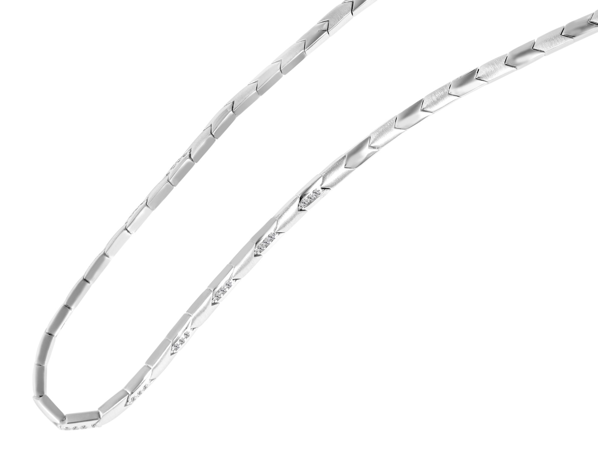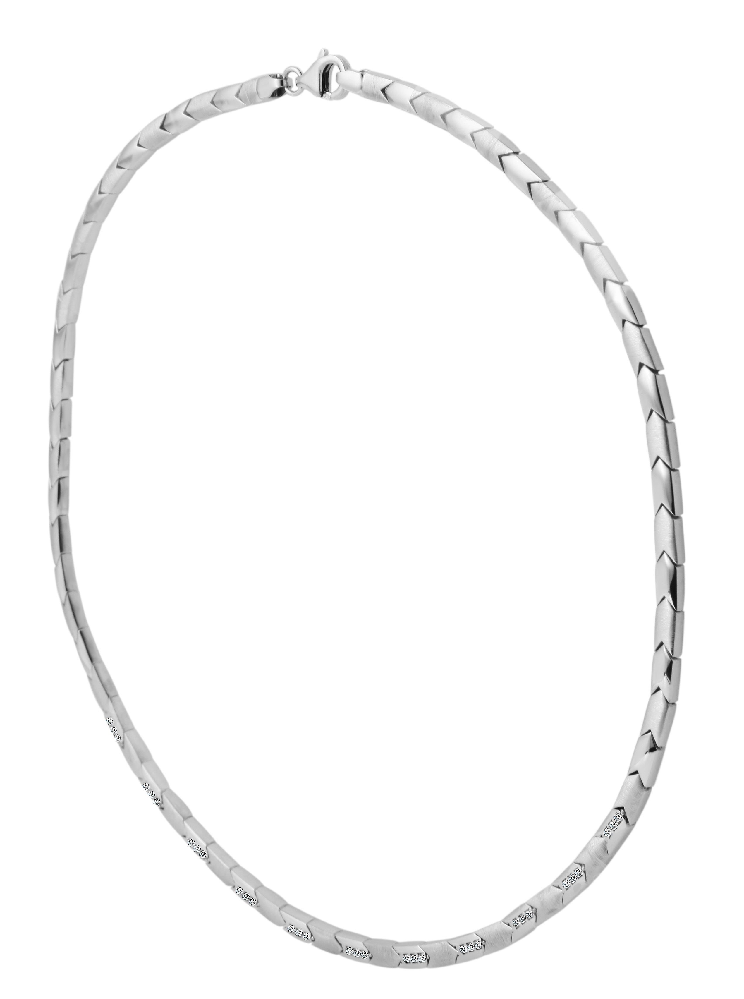 Die Schmuckkette in besonderer Formgebung wurde aus 925/- Sterling Silber gefertigt. Sie hat eine Länge von 45 cm, eine Breite von 4 mm und eine Kettenstärke von 3 mm. Mit einem klassischen Karabinerhaken wird sie am Hals gesichert. Die gesamte Halskette ist rhodiniert. Das heißt, sie ist mit einer hochwertigen Edelmetallschicht überzogen, die das Schmuckstück vor dem Anlaufen schützt. Außerdem hebt das Rhodium den Silberton der Kette hervor und verleiht einen perfekten Glanz. Die Besonderheit der Silberkette ist die besondere Form der einzelnen Kettenelemente. Diese sind in gleichmäßigen Abständen sowohl mattiert, als auch poliert und mit zahlreichen Zirkoniasteinen verziert. Die besondere Silberkette ist ein absoluter Hingucker und passt zu jeder Gelegenheit.