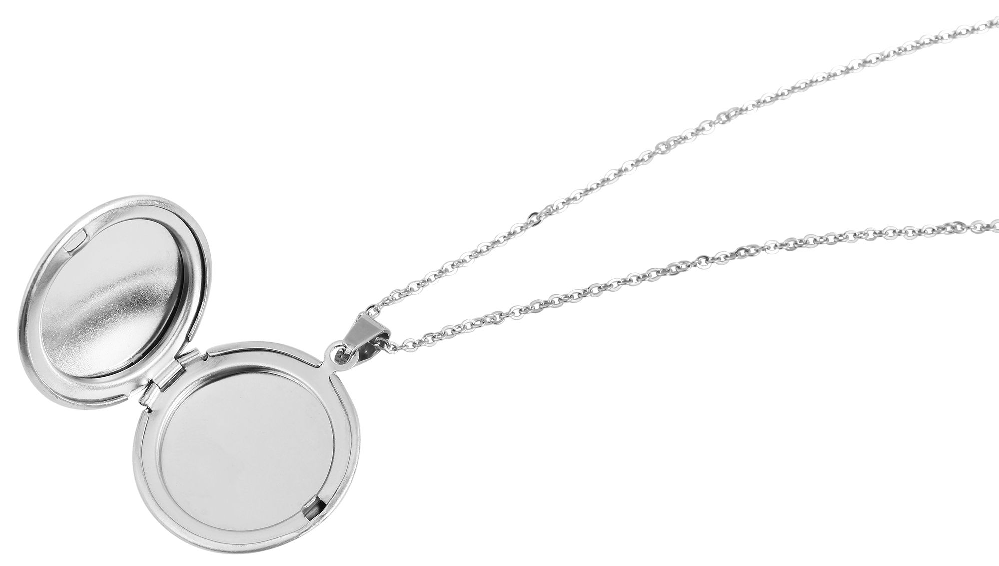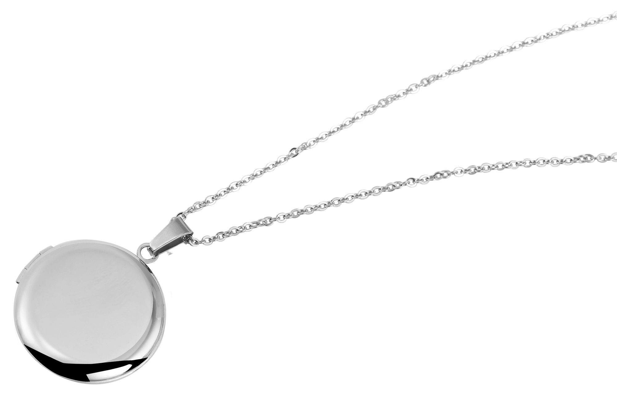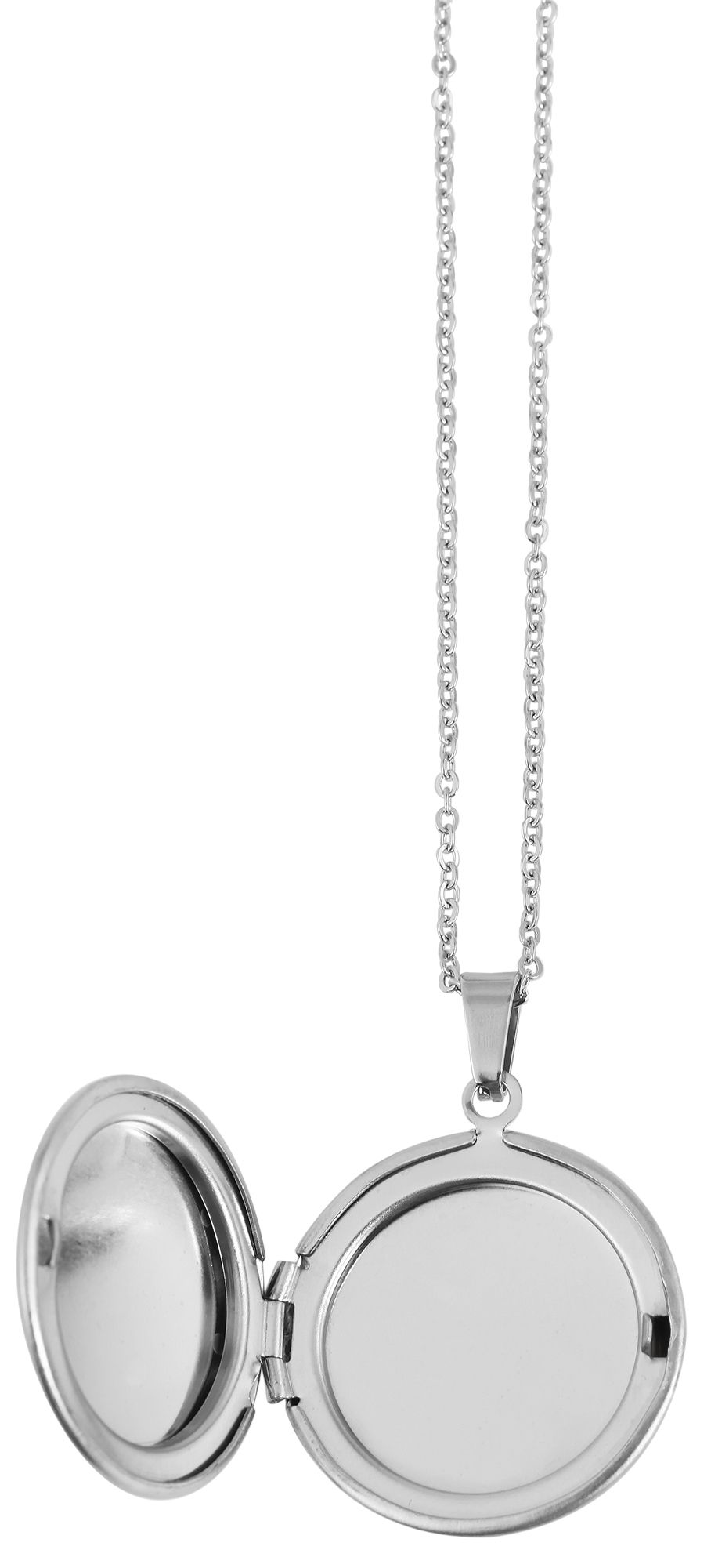 Die silberfarbene Halskette aus Edelstahl ist im Ankermuster gefertigt und hat eine Länge von 48 cm inklusive einer 5 cm langen Verlängerungskette. Die Stärke der Kette beträgt 1 mm. An der Kette ist ein Medaillon angebracht, welches ebenfalls aus Edelstahl gefertigt ist. Es hat einen Durchmesser von 27 mm und eine Höhe von 5 mm. Das Medaillon lässt sich ganz einfach öffnen, sodass zum Beispiel ein Foto eingesetzt werden kann. Die Kette mit Medaillon ist ein schönes Accessoire, das durch die individuelle Personalisierung einzigartig gemacht werden kann. Ein Must-Have, das bei niemandem fehlen darf.