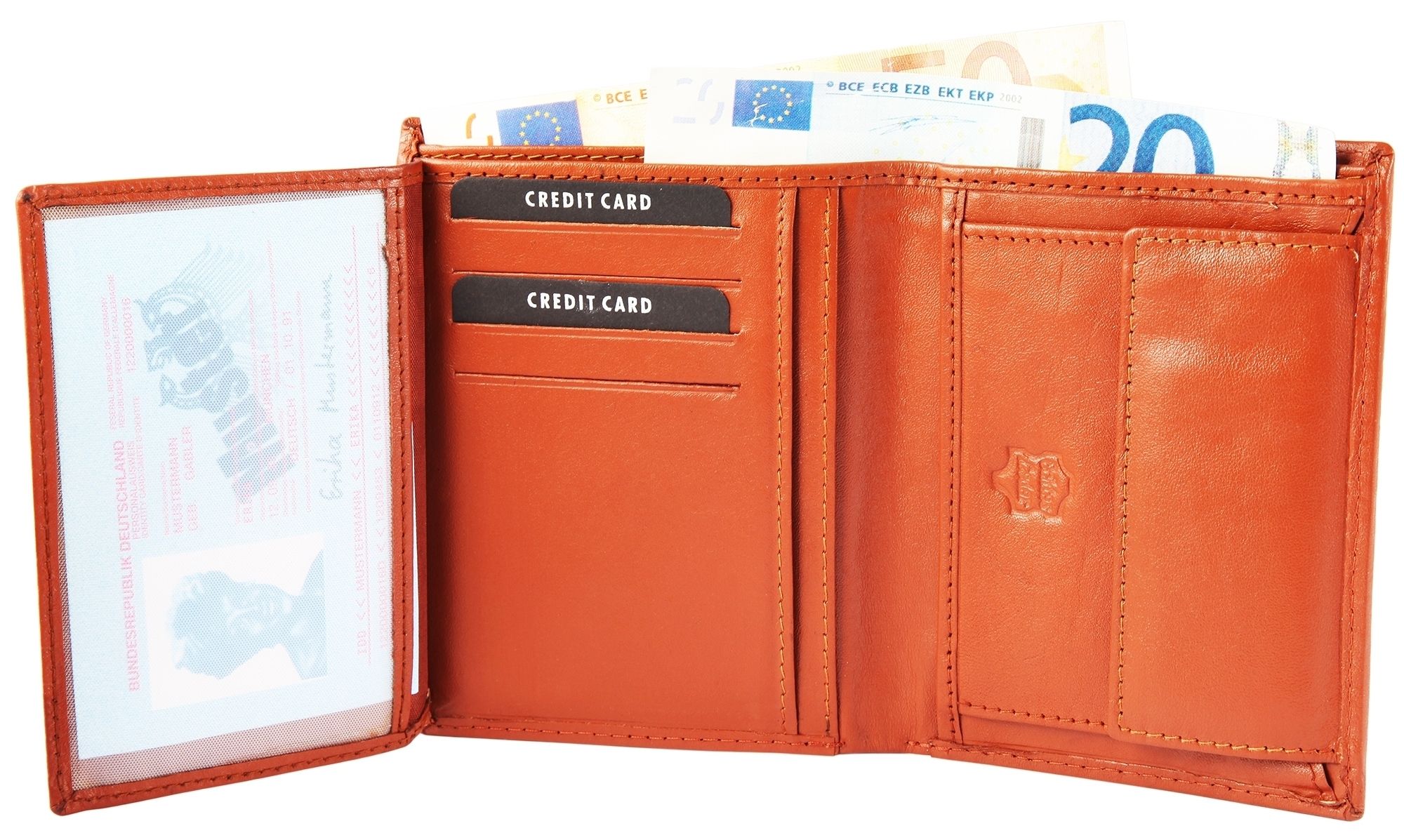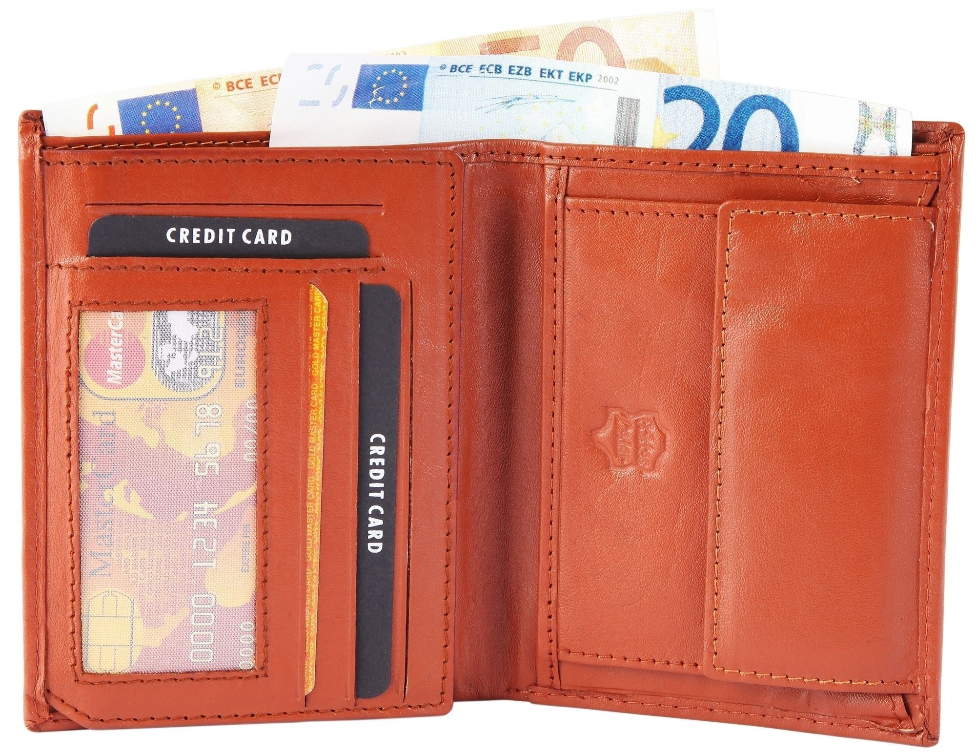 Akzent Herren Geldbörse aus Echtleder. Die Hochformat-Geldbörse ist 9 cm breit und 12 cm hoch. Die Farbe ist Braun. Sie verfügt über 2 Geldscheinfächer, ein Kleingeldfach, 10 Kreditkartenfächer, ein transparentes Kreditkartenfach und ein transparentes Ausweisfach.
