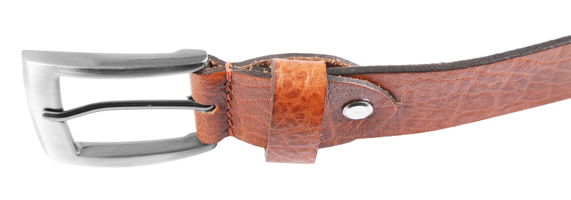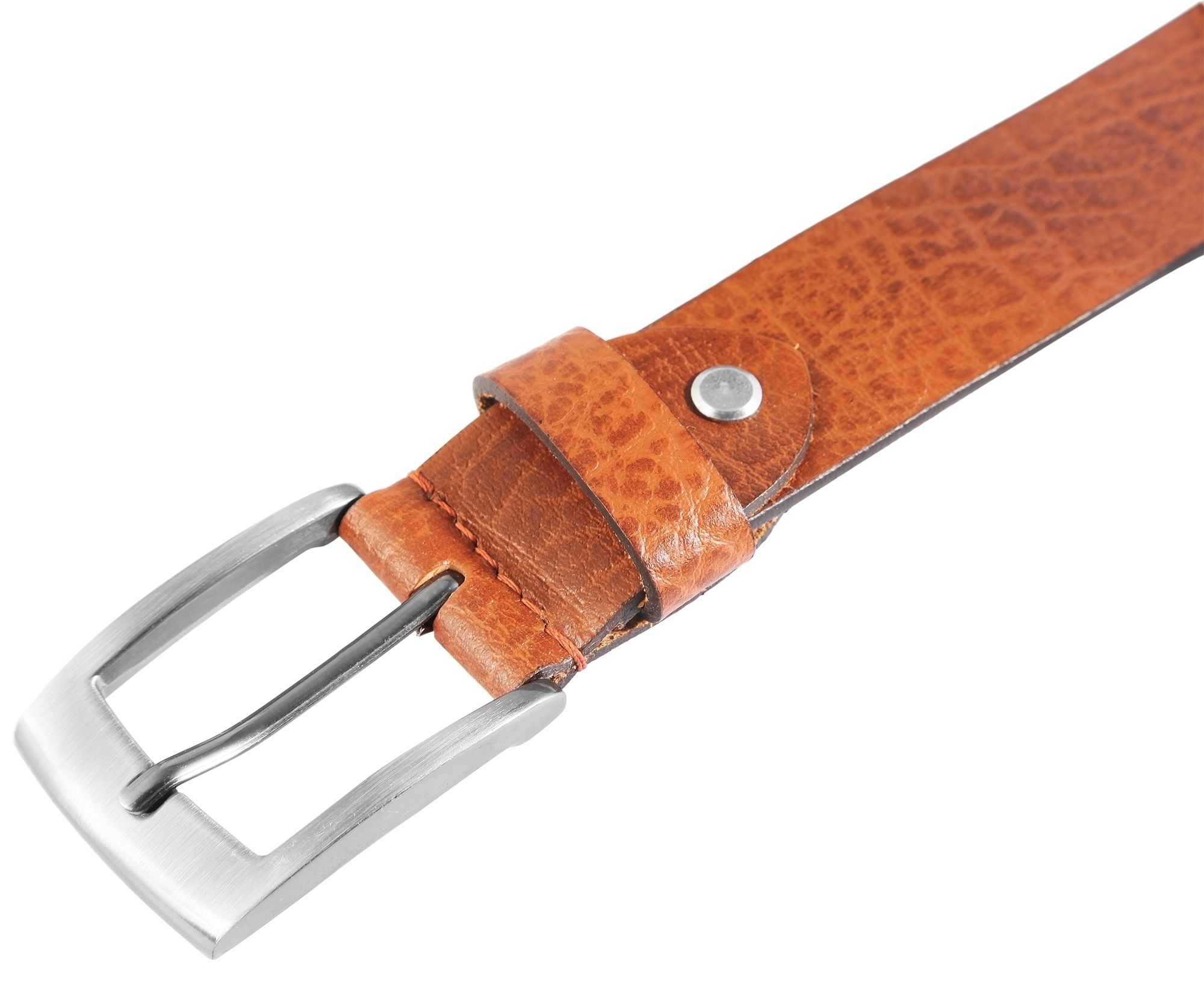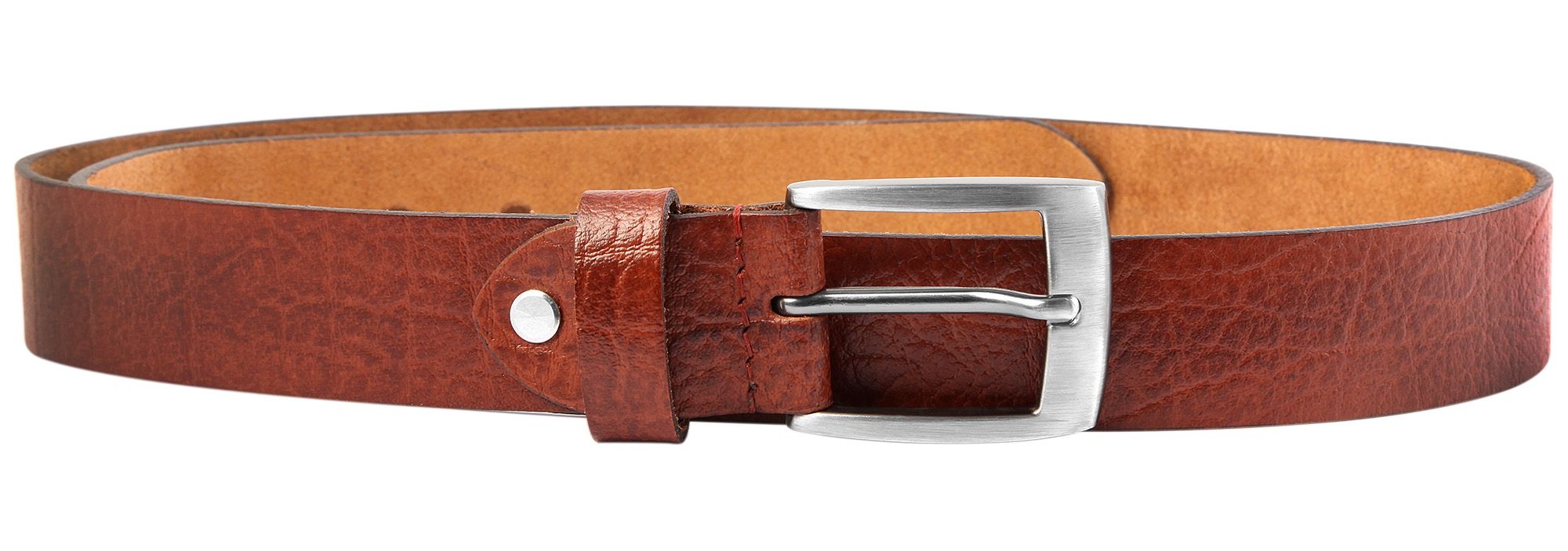 Gefertigt aus Echtleder in einem attraktiven Braunton, präsentiert sich der Gürtel mit einer natürlichen Vernarbungen auf der Oberfläche.