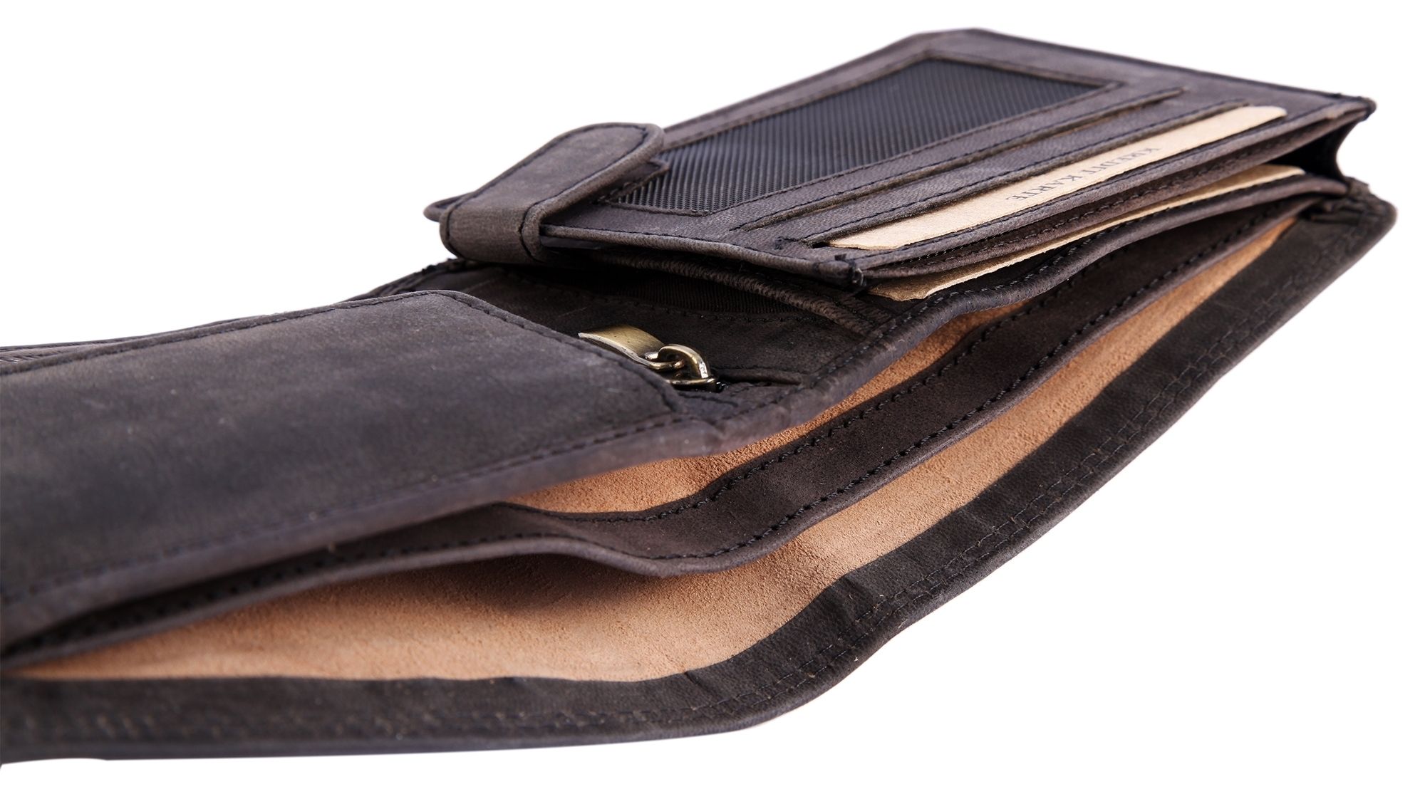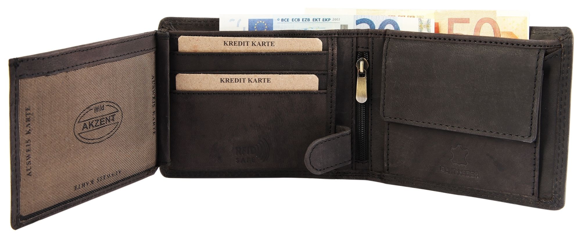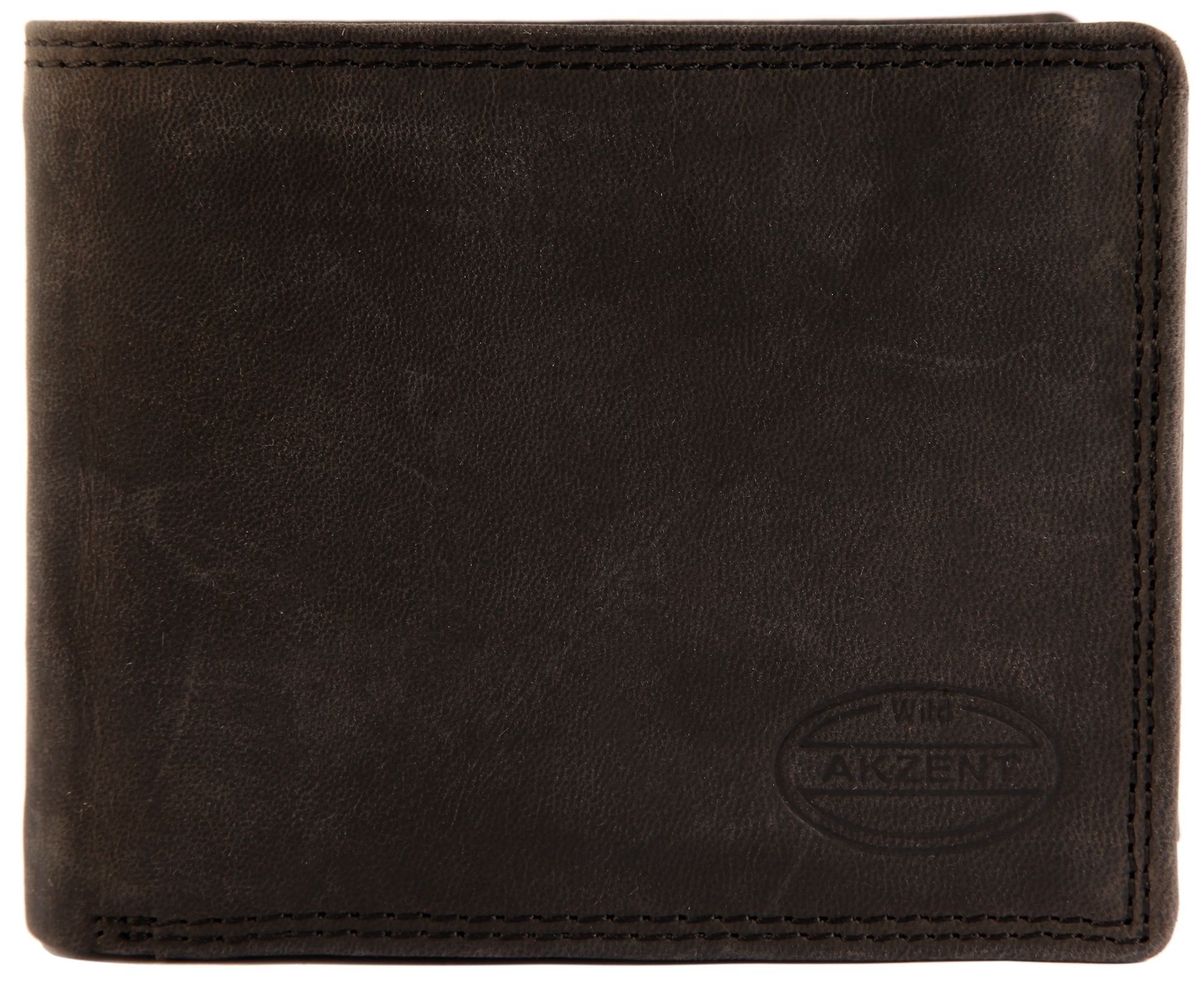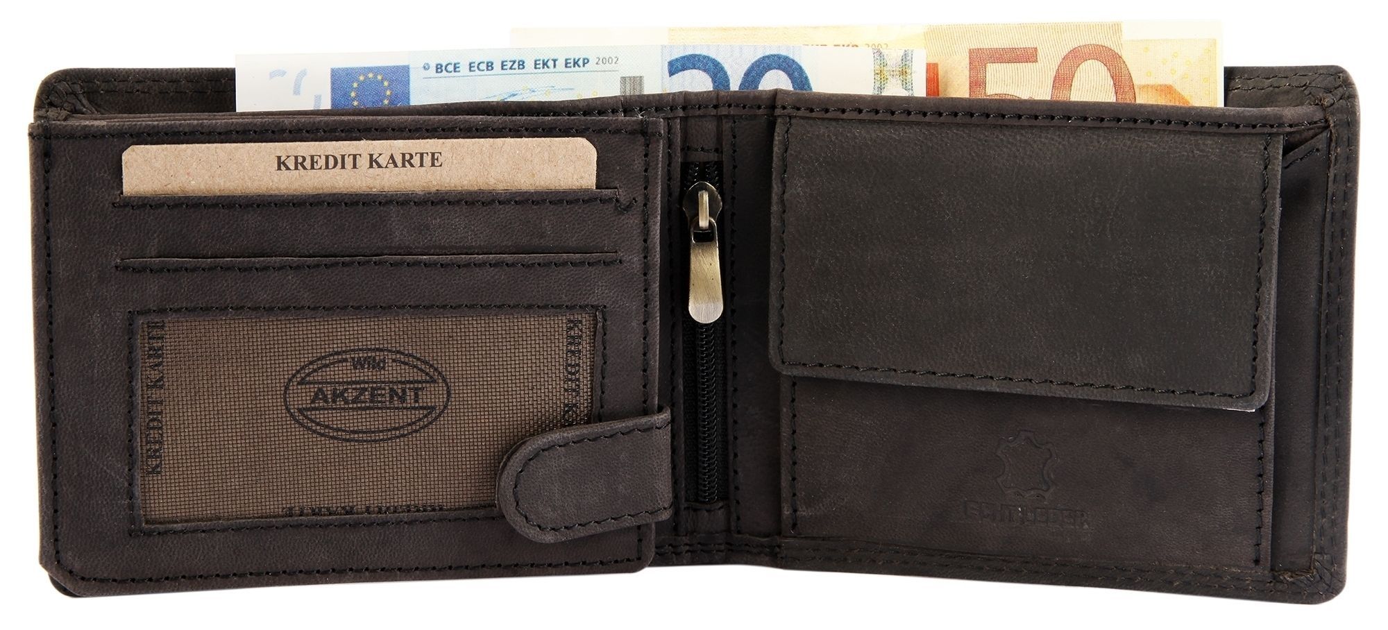 Akzent Herren Geldbörse aus Echtleder. Die Querformat-Geldbörse ist 12 cm breit und 10 cm hoch. Die Farbe ist Schwarz. Sie verfügt über 2 Geldscheinfächer, ein Kleingeldfach, 4 Kreditkartenfächer, ein transparentes Kreditkartenfach und ein transparentes Ausweisfach.