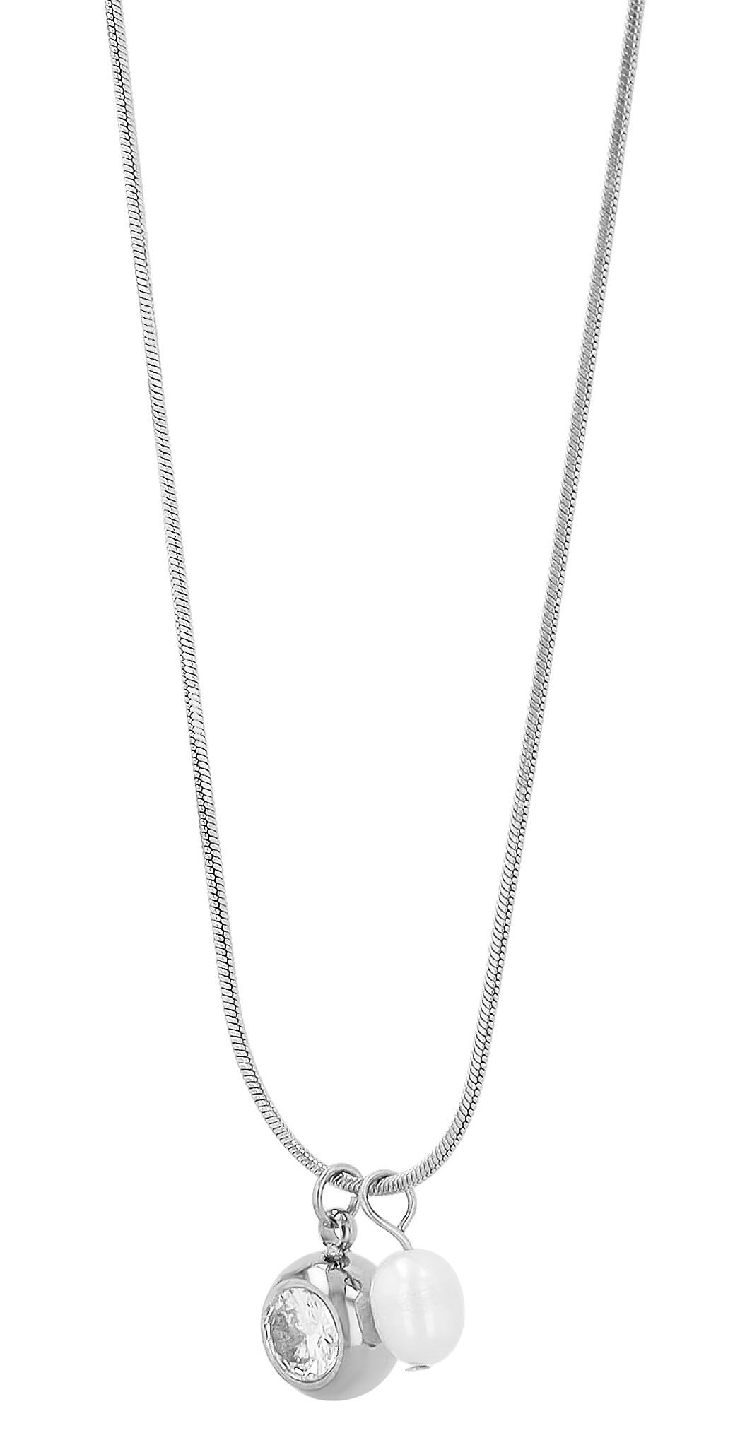 Gefertigt aus hochwertigem Edelstahl verkörpert unsere Halskette mit zwei Anhängern nicht nur zeitlose Eleganz, sondern auch Langlebigkeit und Beständigkeit. Edelstahl ist resistent gegen Korrosion und Anlaufen, was sicherstellt, dass die Kette auch nach längerem Tragen ihre strahlende Schönheit bewahrt. Die Halskette erstreckt sich über eine Länge von 41 cm, mit einer zusätzlichen 5 cm Verlängerungskette für eine individuelle Anpassung. Der sichere Karabinerverschluss sorgt nicht nur für einen festen Halt, sondern auch für eine einfache Handhabung. Das Herzstück dieser bezaubernden Halskette ist der Anhänger mit einem Similistein (Ø 8 mm), mit zusätzlich einem Ornament auf der Rückseite und ein zweiter kleiner Anhänger mit einer zierlichen Süßwasserperle Die funkelnden Anhänger strahlen eine natürliche Schönheit aus und verleiht der Halskette eine sanfte Eleganz.
