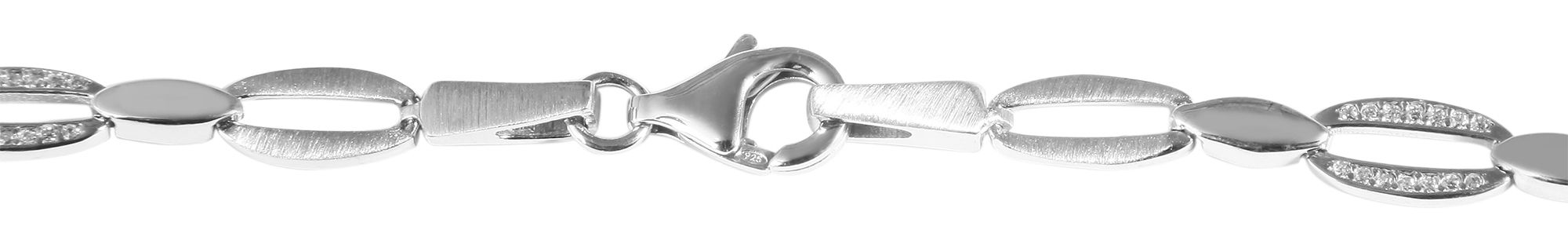 Die Schmuckkette wurde aus 925/- Sterling Silber gefertigt und zusätzlich rhodiniert. Das heißt, sie ist mit einer hochwertigen Edelmetallschicht überzogen, die das Schmuckstück vor dem Anlaufen schützt. Außerdem hebt das Rhodium den Silberton der Kette hervor und verleiht einen perfekten Glanz. Zudem sind die Elemente der Kette in wechselnden Abständen sowohl poliert, als auch mattiert und mit funkelnden Zirkoniasteinen besetzt. Dieses Design verleiht dem Schmuckstück einen edlen und einzigartigen Look. Sie besteht aus ovalen Kettenösen und länglichen Elementen und lässt sich mit einem klassischen Karabinerhaken an Hals sichern. Die Länge beträgt 45 cm, sie hat eine Breite von 6 mm und eine Kettenstärke von 1 mm.