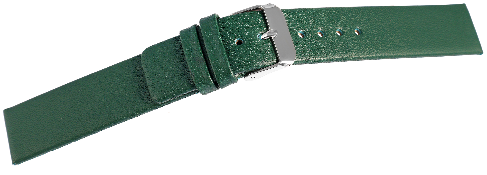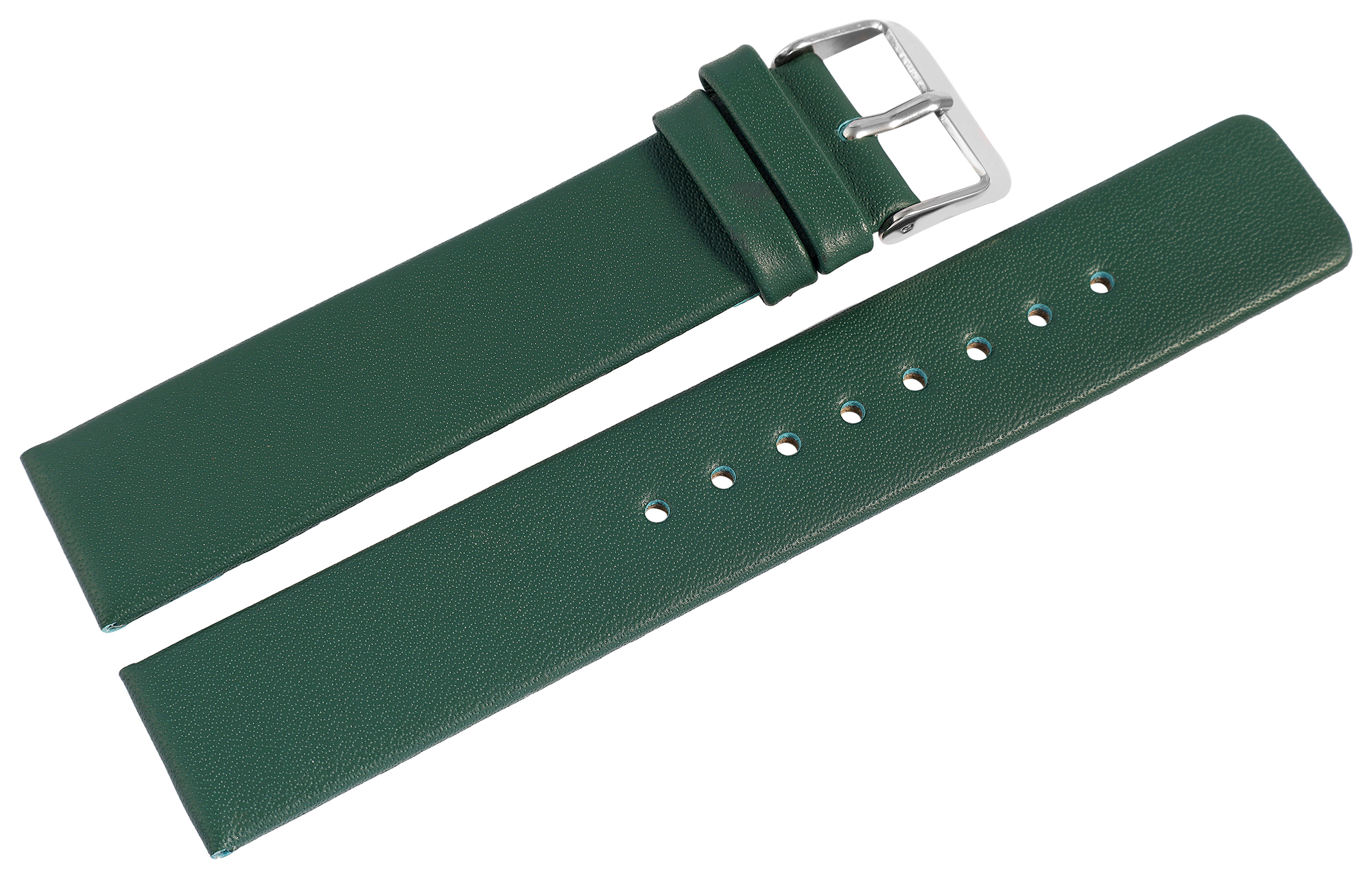 De donkergroene horlogeband is gemaakt van echt leer en is verkrijgbaar met een breedte van 14 mm, 16 mm, 18 mm, 20 mm en 22 mm. De totale lengte van het horlogebandje is 20,5 cm en de materiaaldikte is 2 mm. De vervangingsband kan worden geopend en gesloten met een zilverkleurige, hoogglans gepolijste gesp. De glanzende afwerking in combinatie met het gladde leren bandje benadrukt het mooie design van het horlogebandje en zorgt ervoor dat het snel en gemakkelijk om- en afgedaan kan worden.