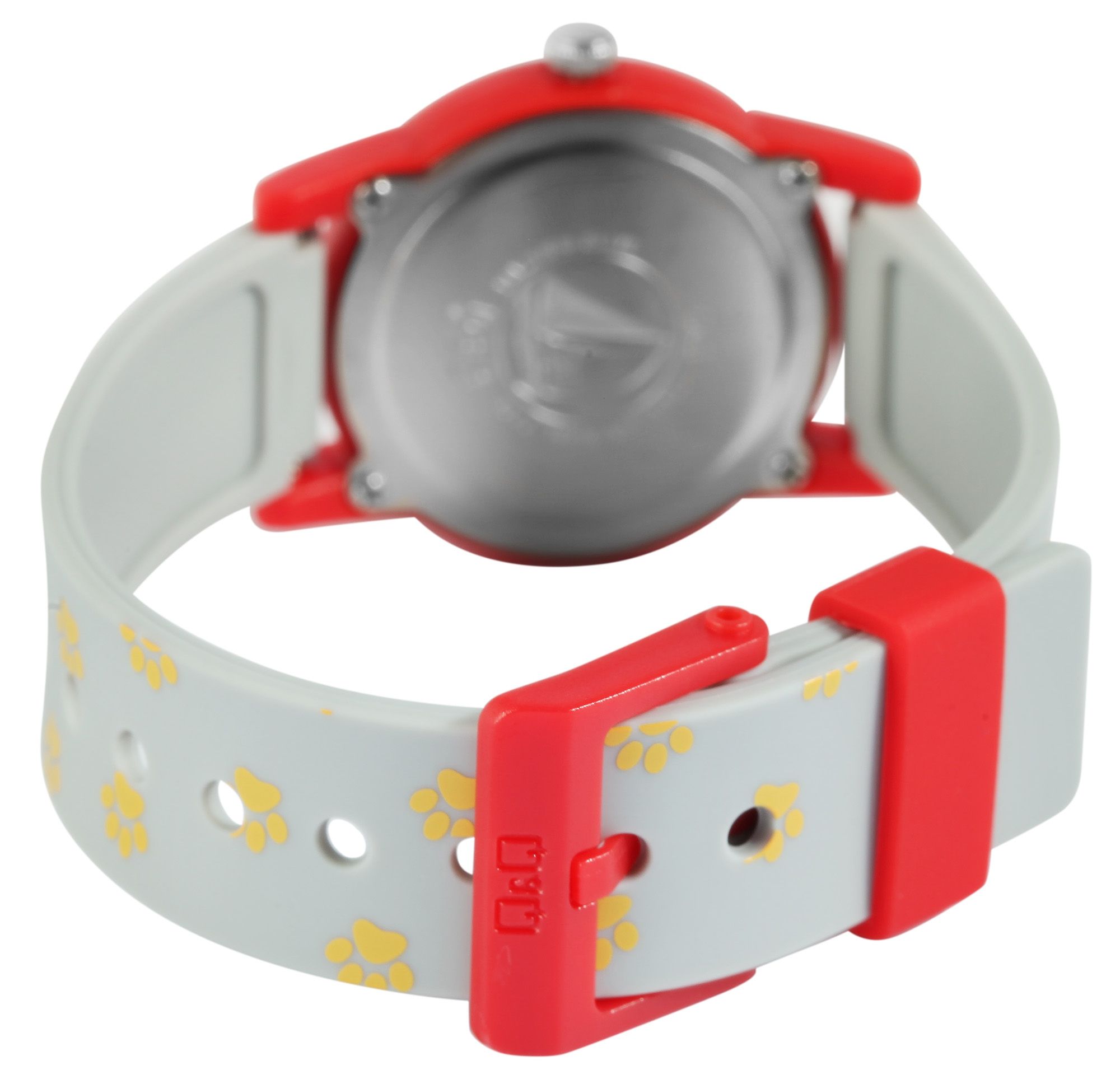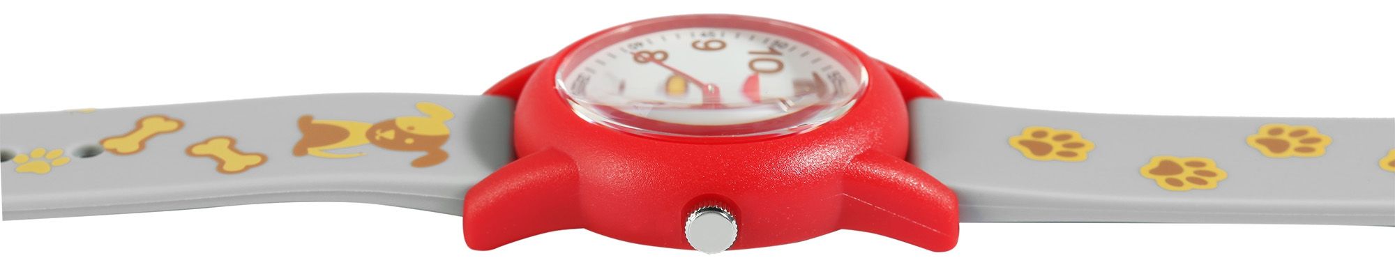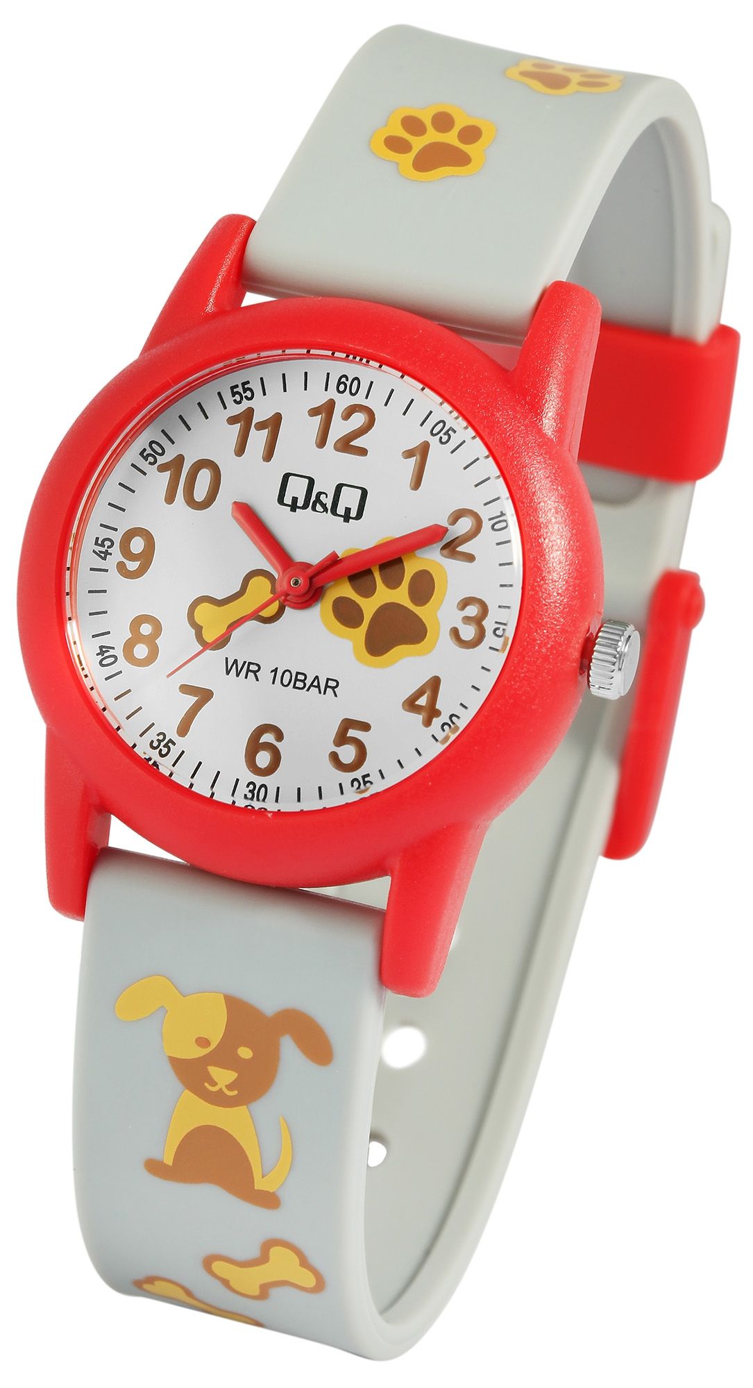Die analoge 3-Zeiger Kinderarmbanduhr der Marke Q&Q - by Citizen Watch Co. LTD verfügt über ein hochwertiges Quarzuhrwerk. Das graue Silikonarmband ist am Anstoß 16 mm breit und lässt sich mit einer roten Dornschließe aus Kunststoff öffnen und schließen. Die Gesamtlänge der Uhr beträgt 22,5 cm. Das rote Gehäuse mit Kunststoffglas hat eine Abmessung von 30 mm im Durchmesser und einer Gehäusehöhe von 10 mm. Der Gehäuseboden ist aus Edelstahl gefertigt. Das Silikonarmband ist mit Hunden, kleinen Pfötchen und Hundeknochen verziert. Zudem sorgt es für einen angenehmen Tragekomfort und ist äußerst unempfindlich. Im Zifferblatt spiegeln sich die Motive ebenfalls wider. Die arabischen Ziffern und die roten Zeiger auf dem weißen Zifferblatt machen das Ablesen der Uhrzeit zum Kinderspiel. Dieser Zeitmesser hilft Kindern auf freudvolle Weise beim Lernen der Uhrzeit und zaubert den kleinen Träger/innen ein Lächeln ins Gesicht.