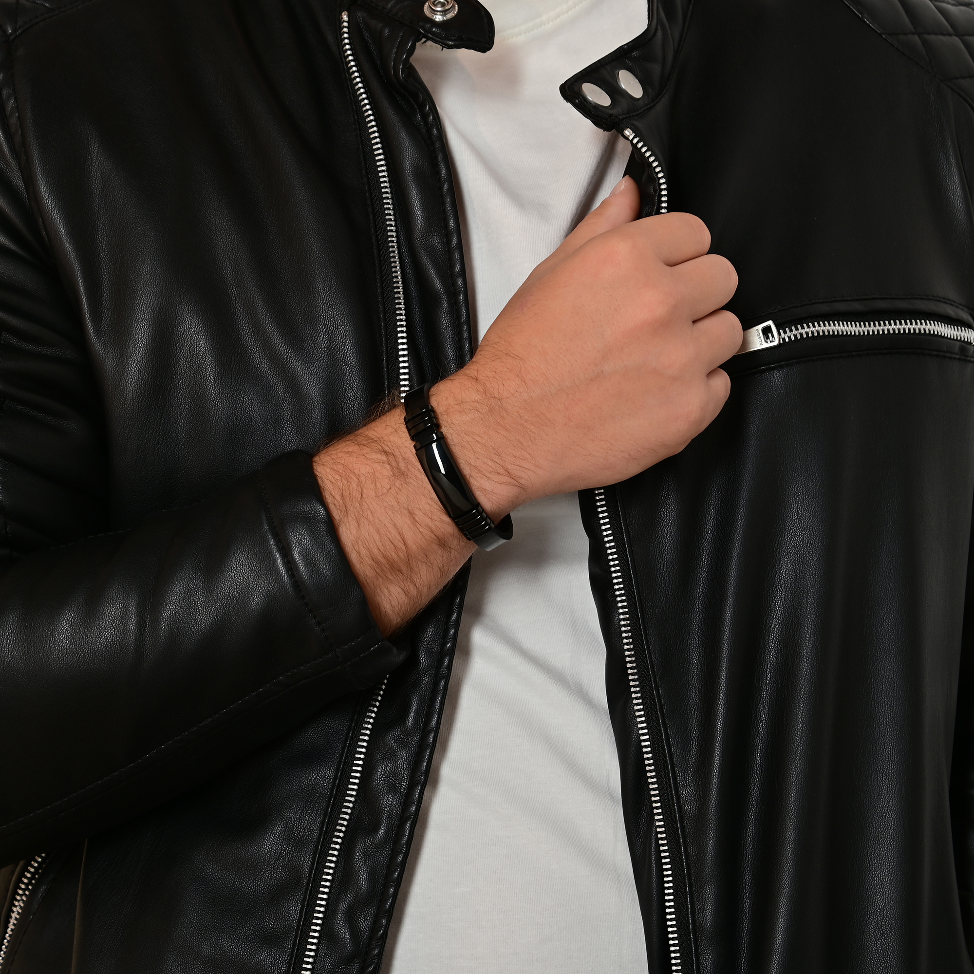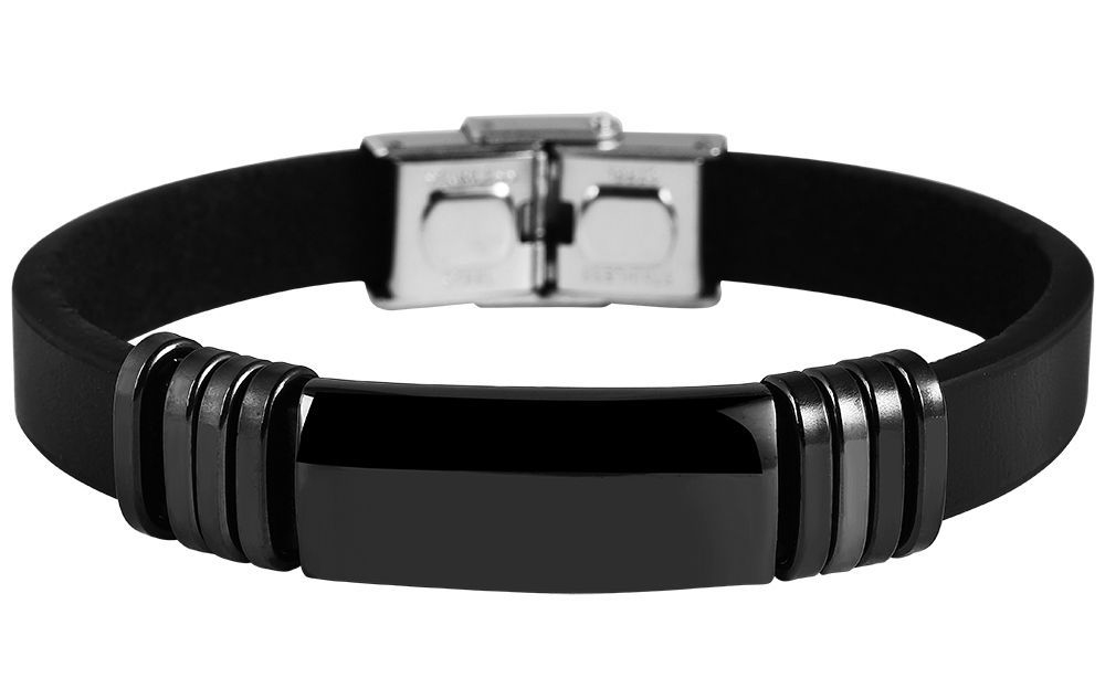 De echt lederen armband van het merk Akzent bestaat uit een 10 mm brede, gladde lederen band. In het midden is een 2,9 cm lang element van zwart roestvrij staal verwerkt. Dit wordt omringd door vier ovale roestvrijstalen ringen in dezelfde kleur. Deze ronden het harmonieuze totaalbeeld van de modieuze sieradenarmband af. De armband kan worden geopend en gesloten met een glanzende zilverkleurige haaksluiting. De totale lengte van het sieraad is 21 cm, de breedte van het graveerplaatje is 13 mm en de materiaaldikte is 8 mm.
