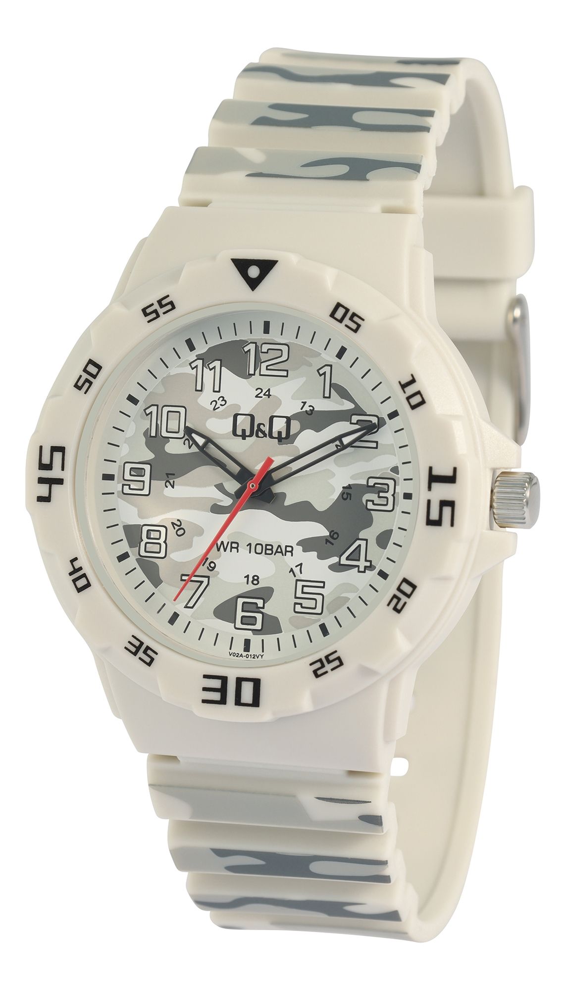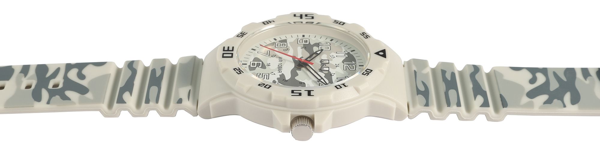 Das Kunststoffarmband mit Camouflagemuster verleiht der Uhr nicht nur eine robuste Optik, sondern sorgt auch für Tragekomfort. Die Dornschließe aus Edelstahl bietet sicheren Halt, während das graue Kunststoffgehäuse mit einer sportlichen Lünette einen dynamischen Touch verleiht. Das transparente Kunststoffglas schützt das Zifferblatt und sorgt für eine klare Sicht auf die Zeit. Mit einem Gehäusedurchmesser von 42 mm und einer Höhe von 11 mm ist diese Uhr auffällig, aber dennoch angenehm zu tragen. Das breite 22-mm-Band und die Gesamtlänge von 24 cm sorgen für den perfekten Sitz am Handgelenk. Der Gehäuseboden aus Edelstahl verleiht ihr zusätzliche Stabilität und Qualität. Das Zifferblatt ist ebenfalls in auffälligem Camouflagedesign gestaltet, was der Herrenuhr einen einzigartigen und stylischen Look verleiht. Die Kombination aus arabischen Ziffern, einem weißen Stichindex, schwarzen Zeigern und einem roten Sekundenzeiger sorgt für eine hervorragende Ablesbarkeit.