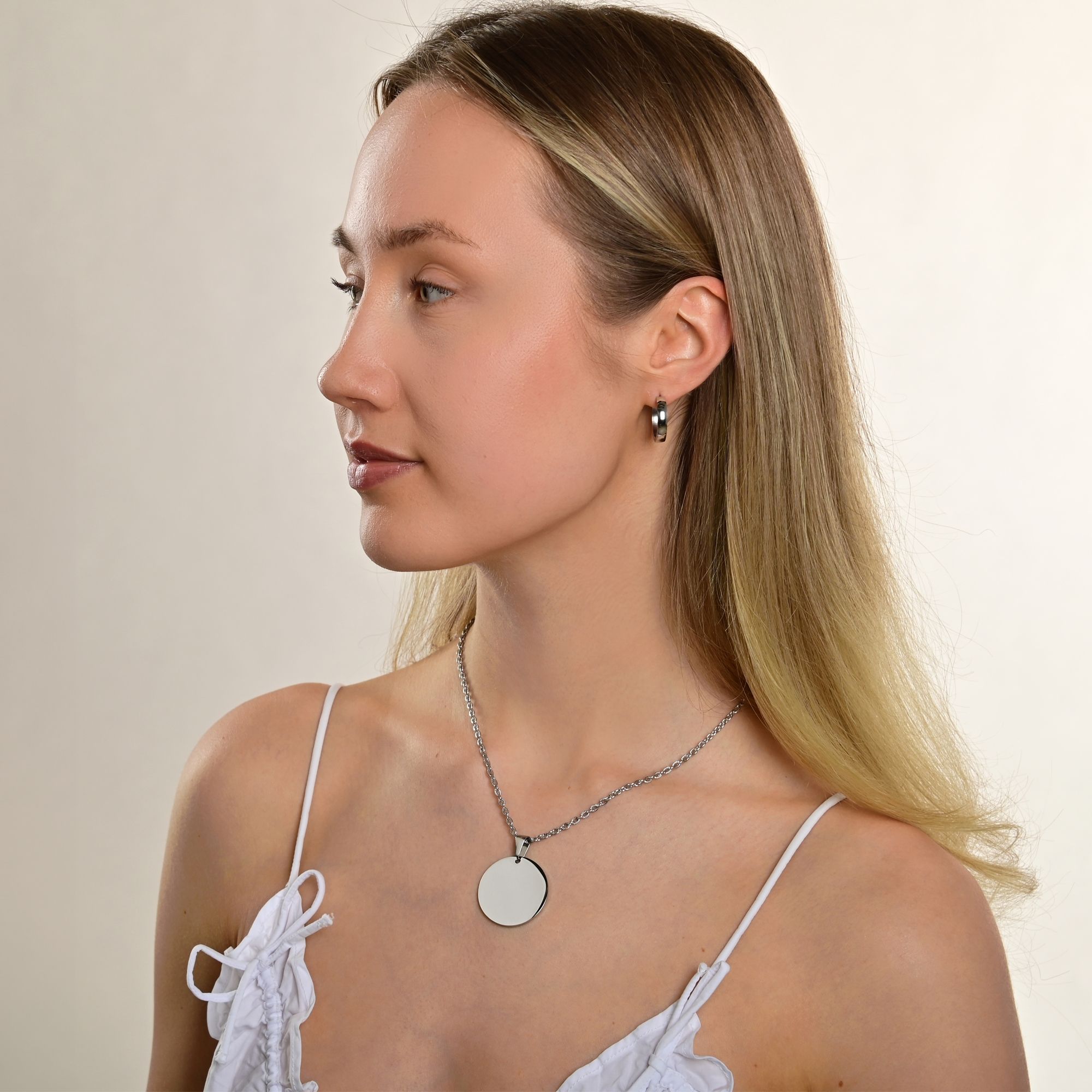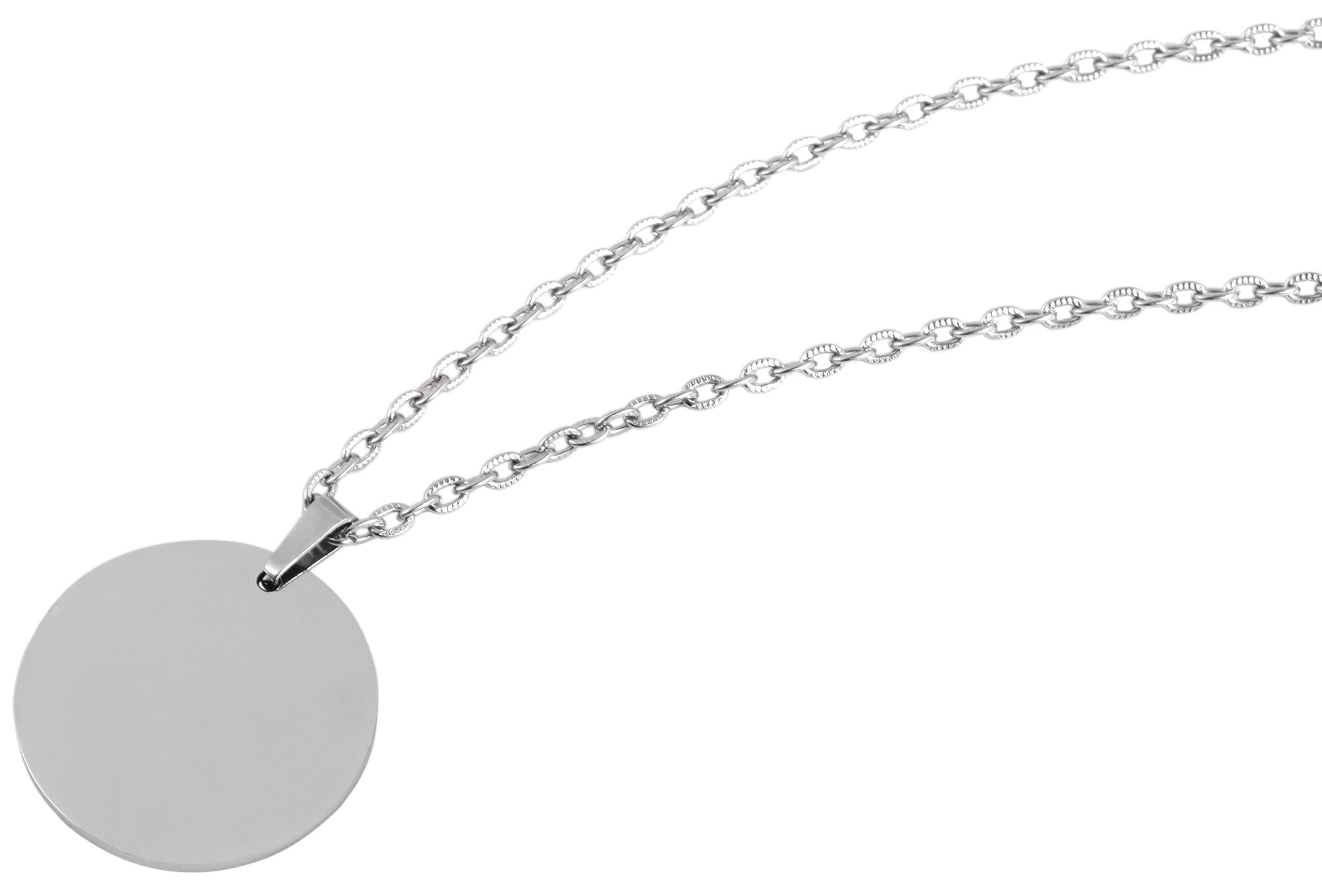 De ketting is uniek dankzij de hoogglans gepolijste, ronde munthanger( diameter30 mm ). Personaliseer de hanger zoals je wilt: met een speciale datum, initialen, een naam, een gezegde of zelfs een klein portret.